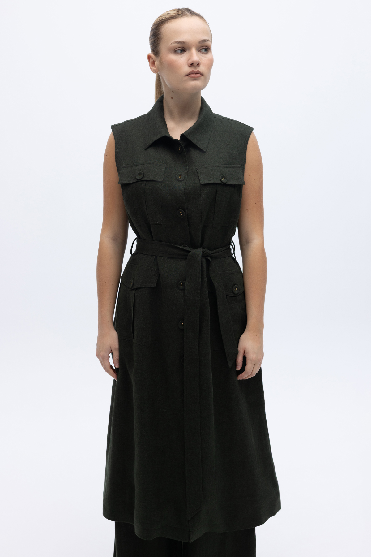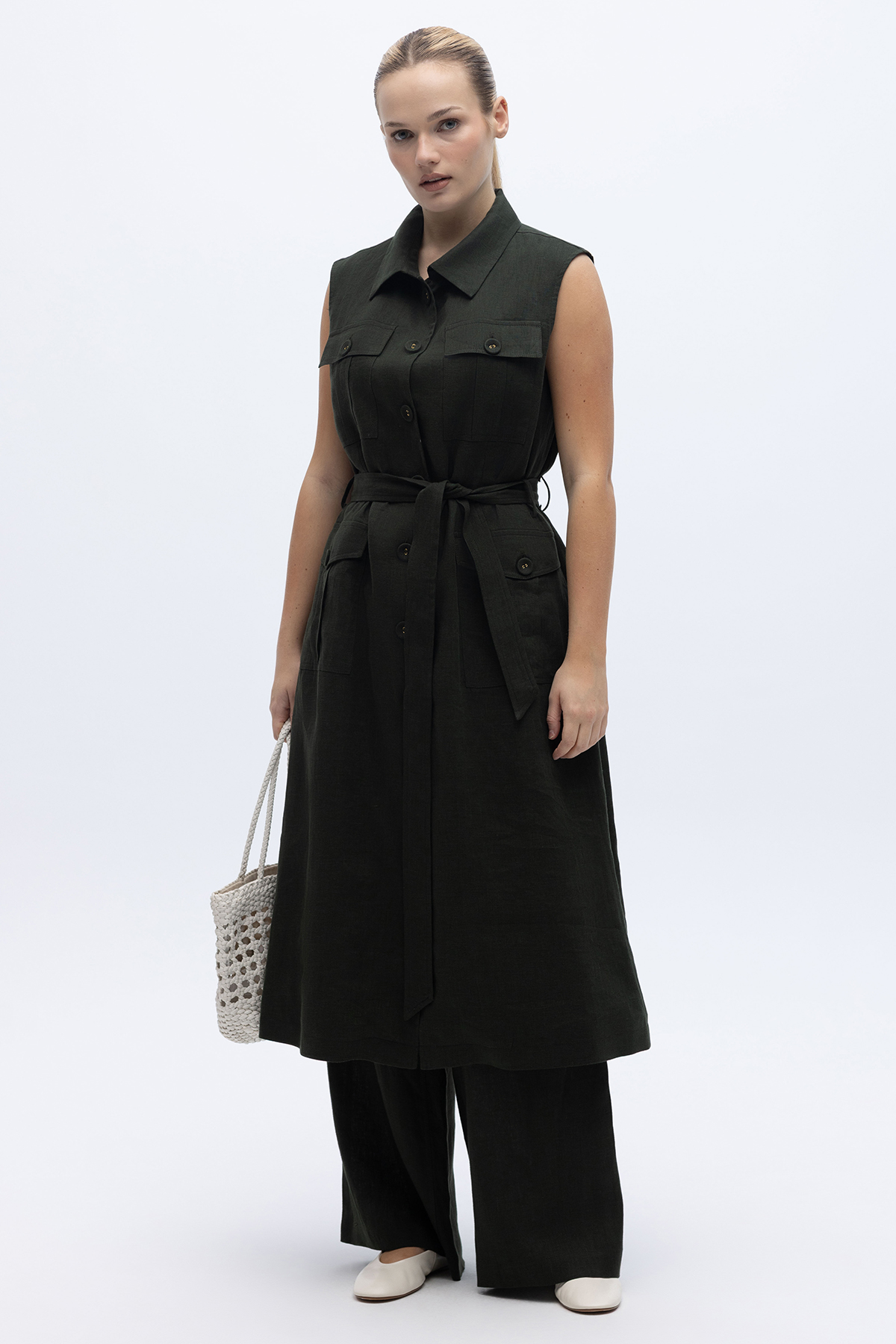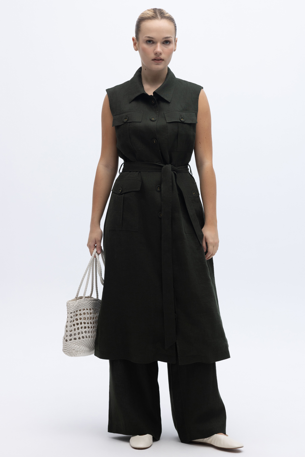 Kargo Cepli Uzun Keten Yelek Haki