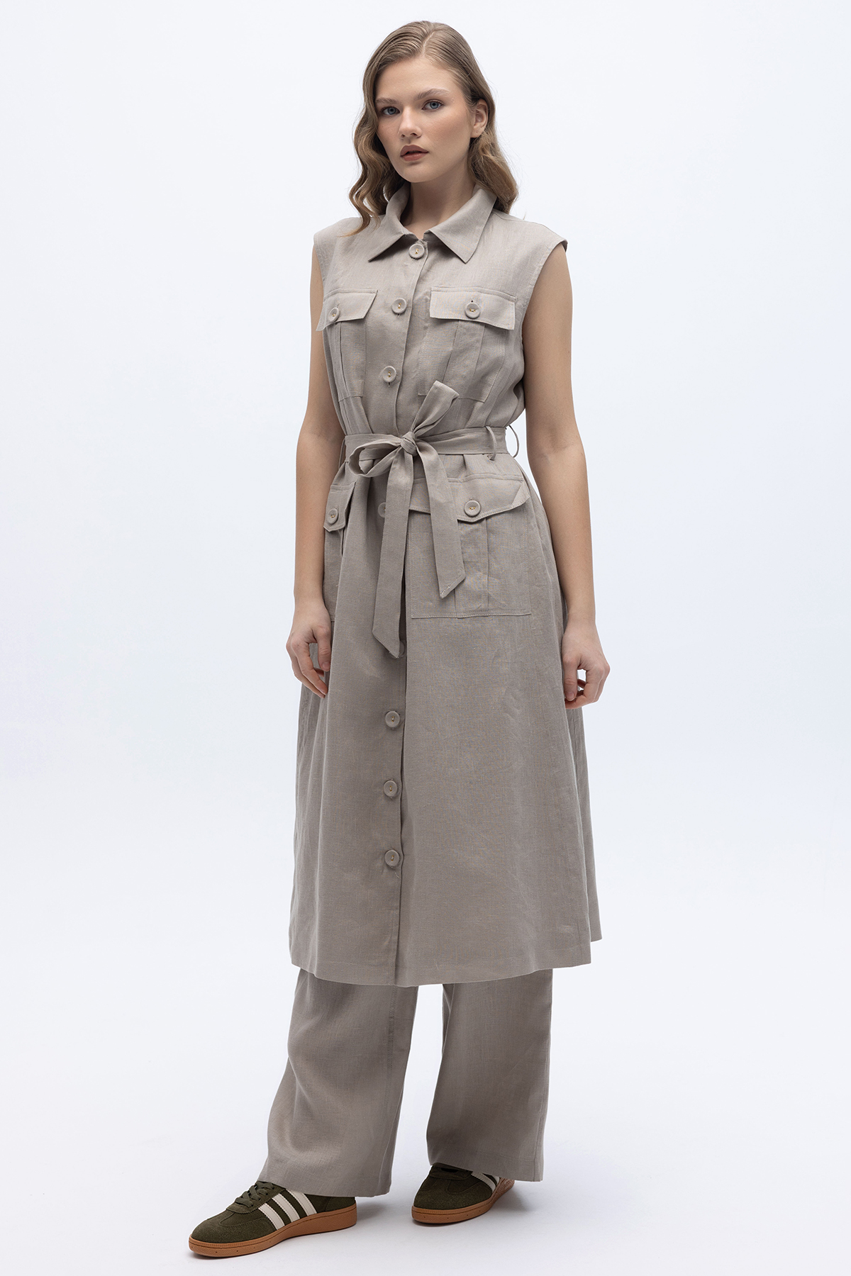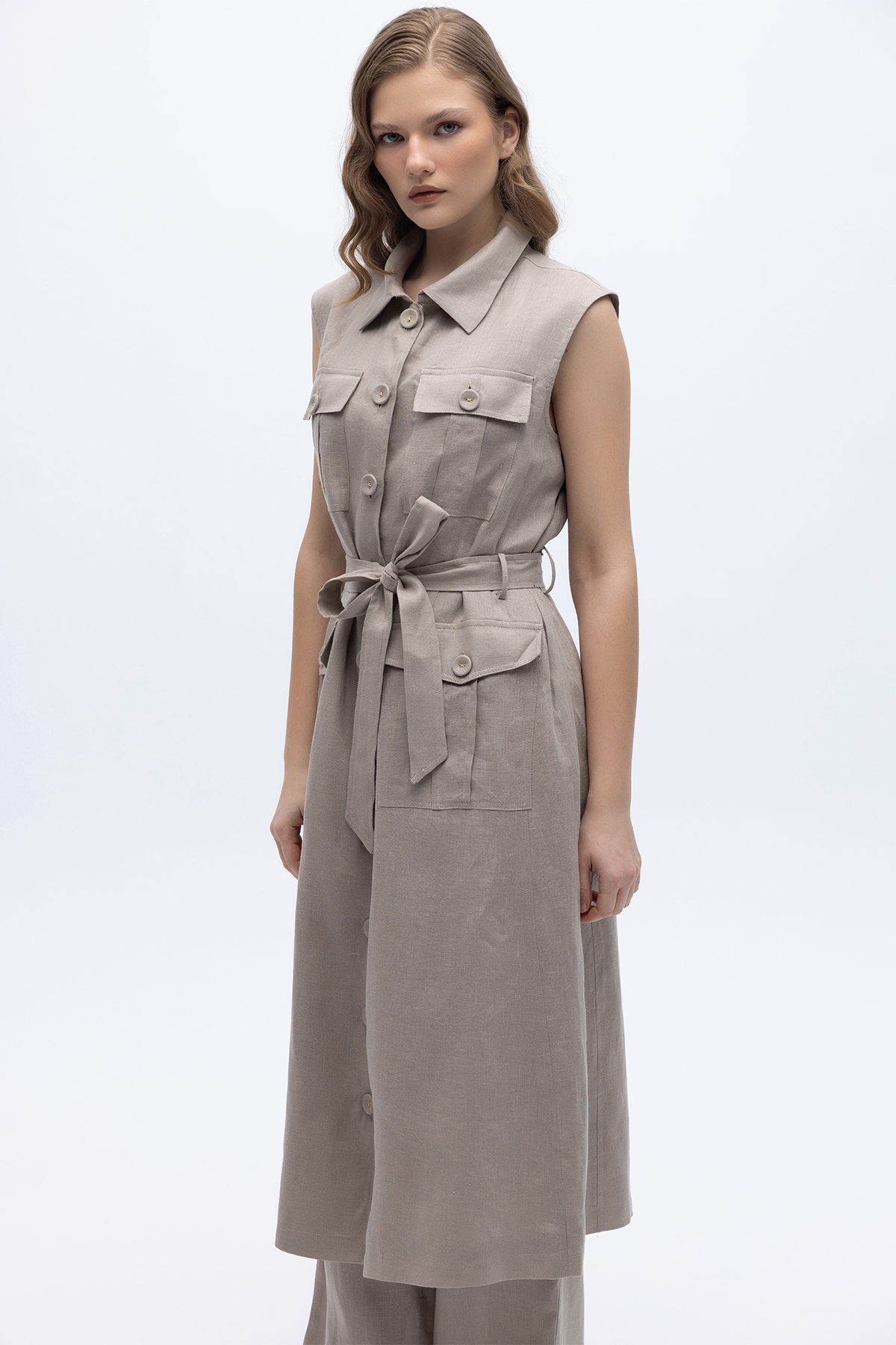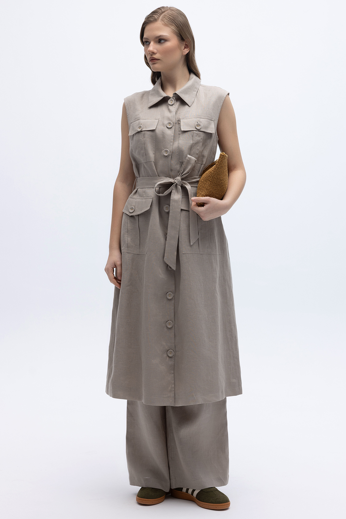 Triko Bantlı Kolsuz Keten Elbise Haki