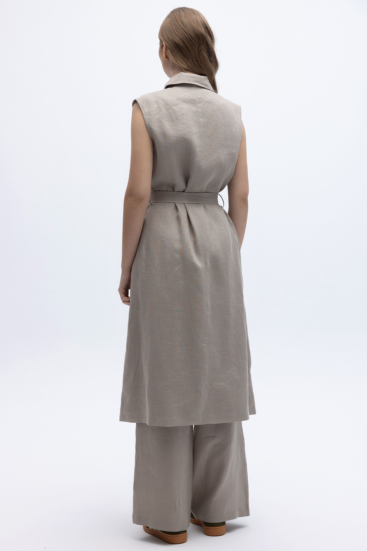 Önü Nervürlü Uzun Keten Kap Kahverengi