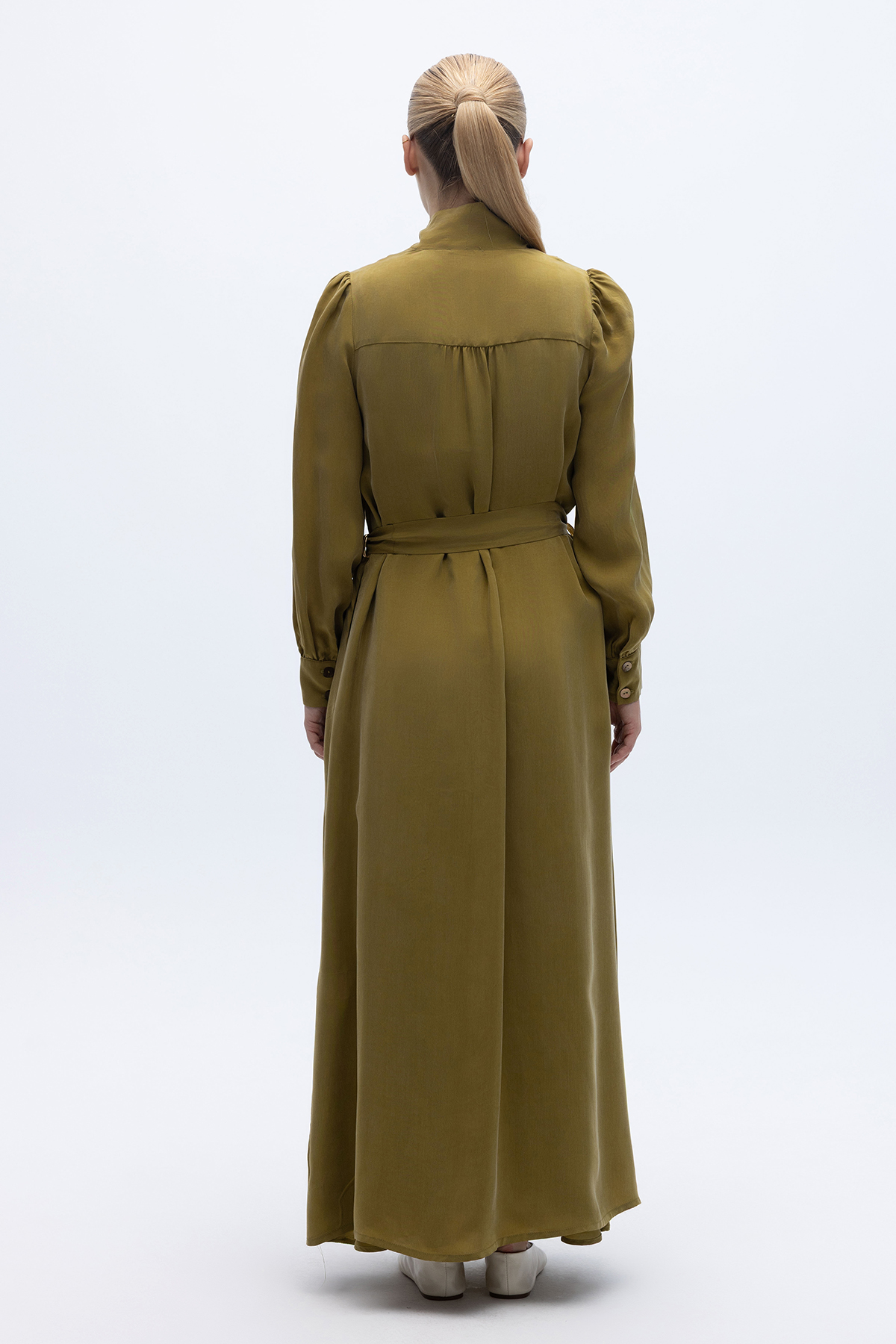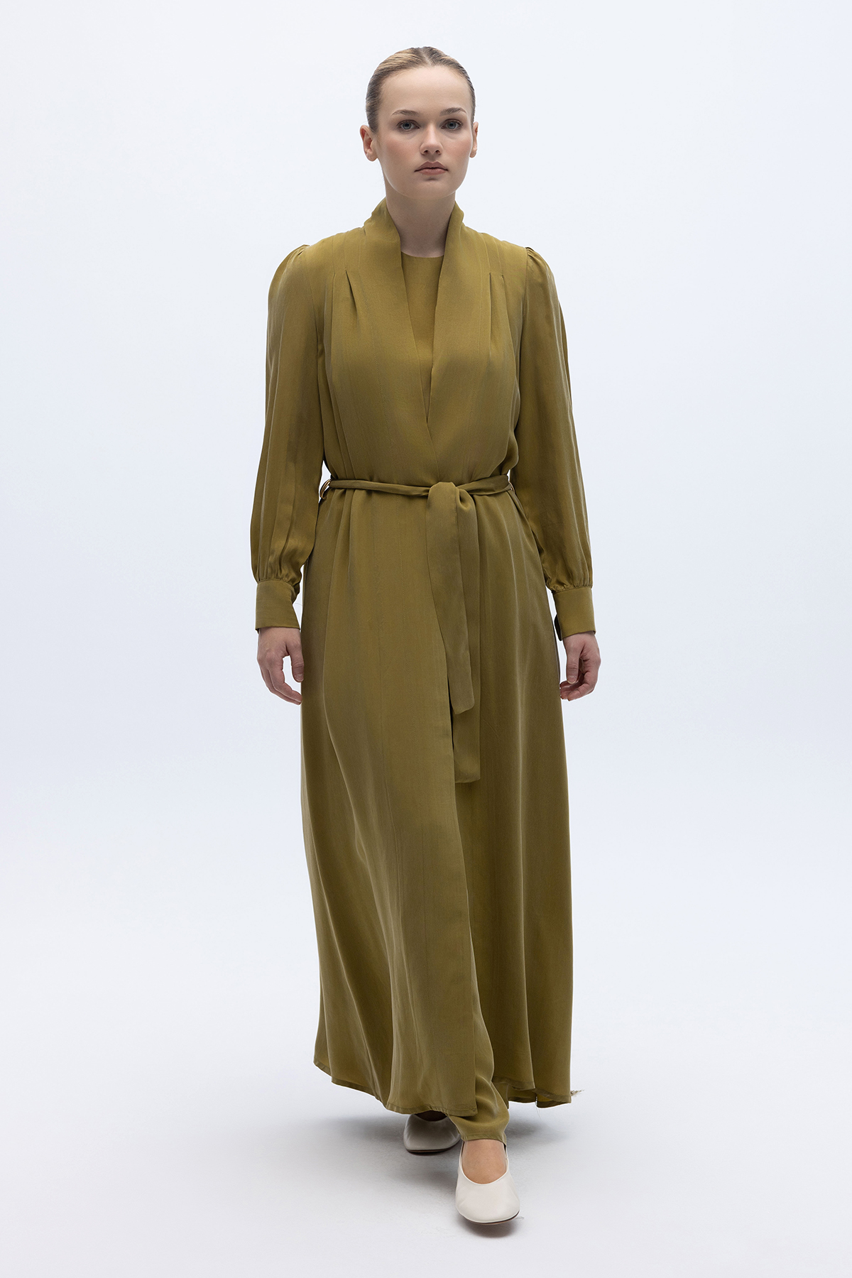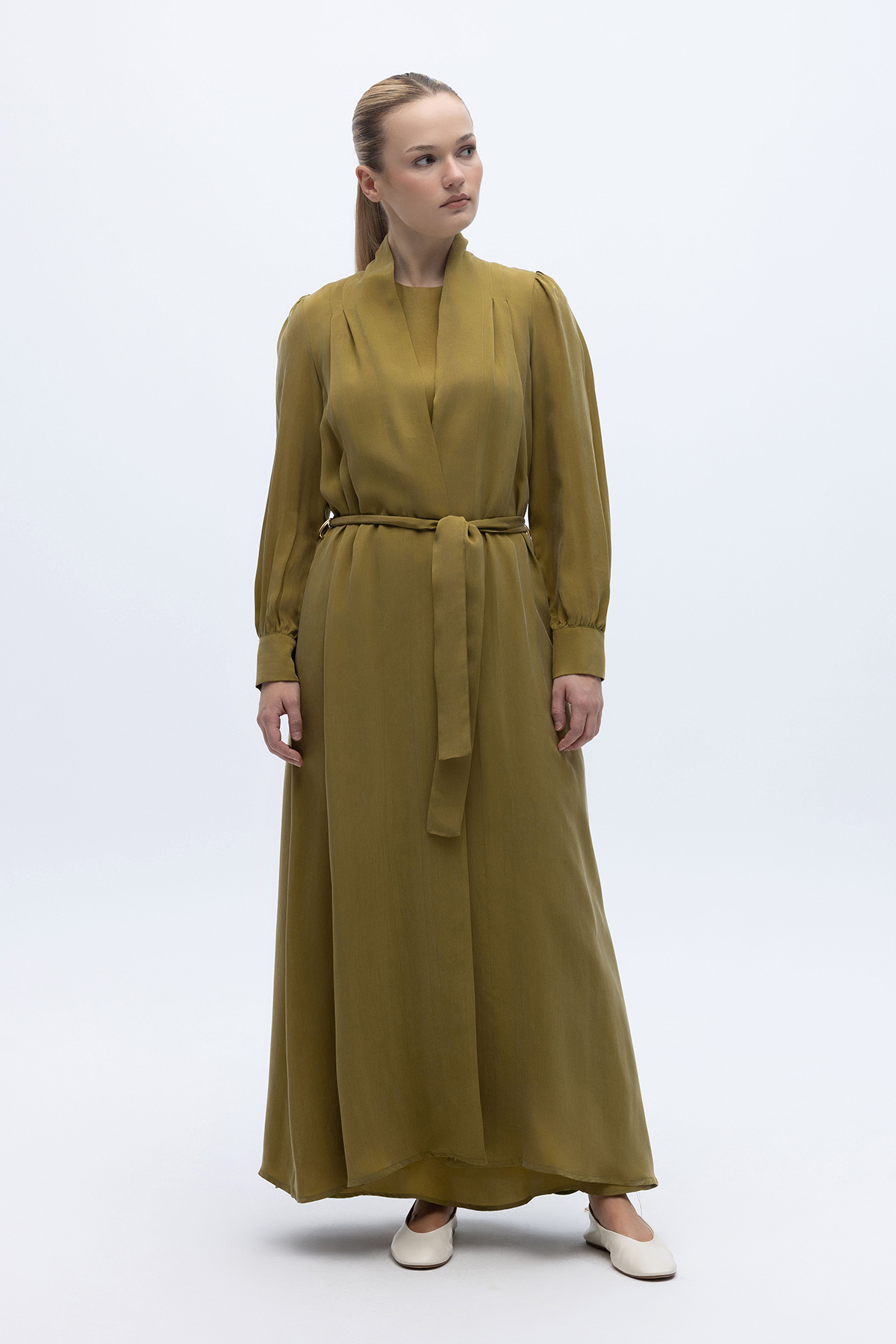 Triko Bantlı Kolsuz Keten Elbise Haki