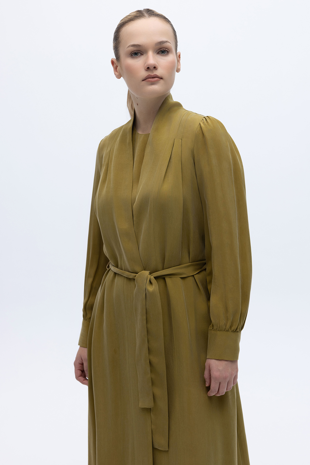 Kemer Tokalı Uzun Cupro Ceket Amber