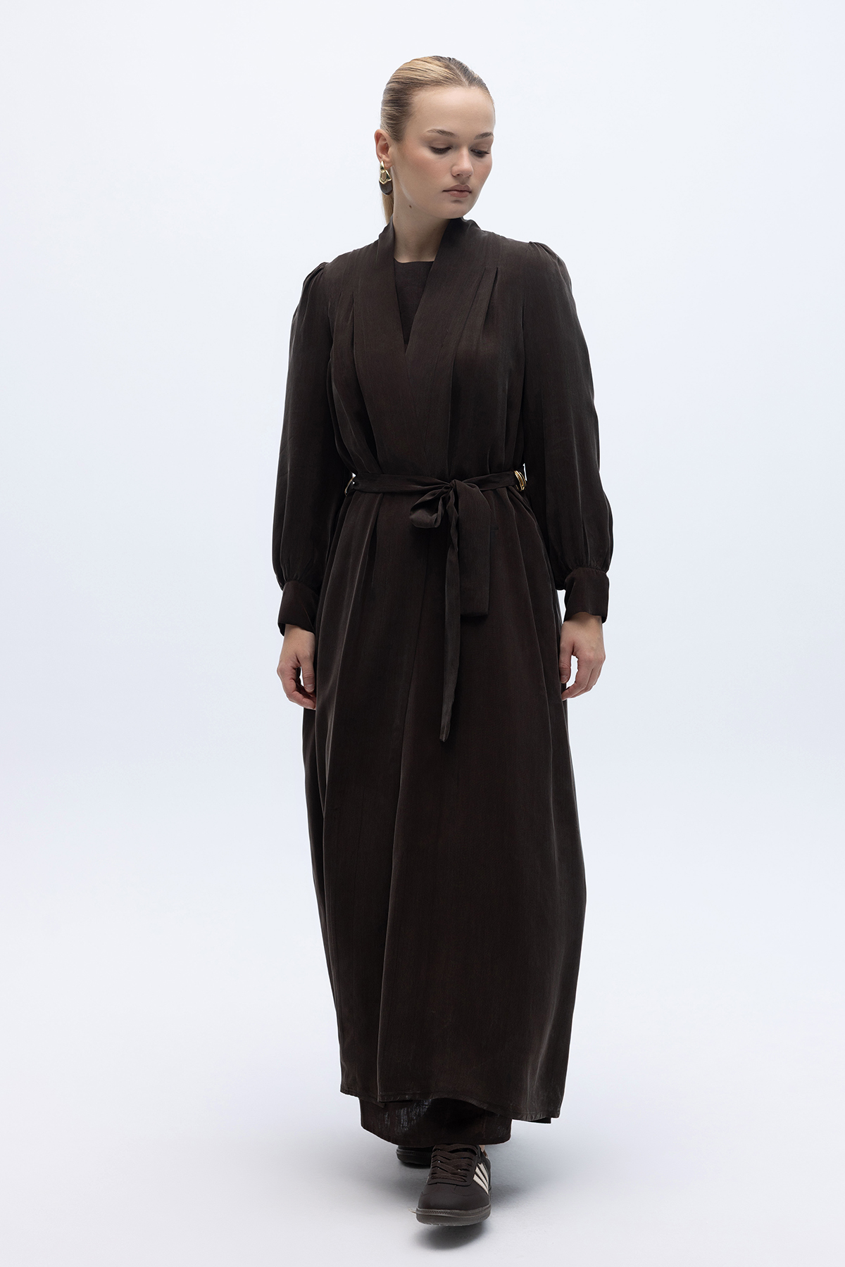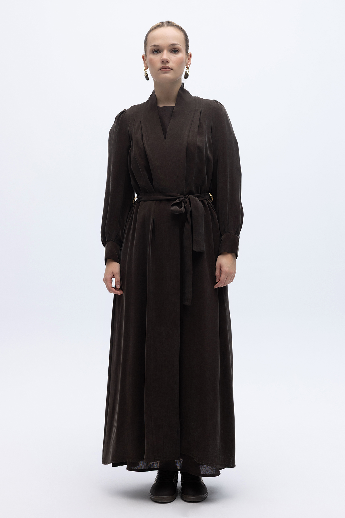 Önü Nervürlü Uzun Keten Kap Kahverengi