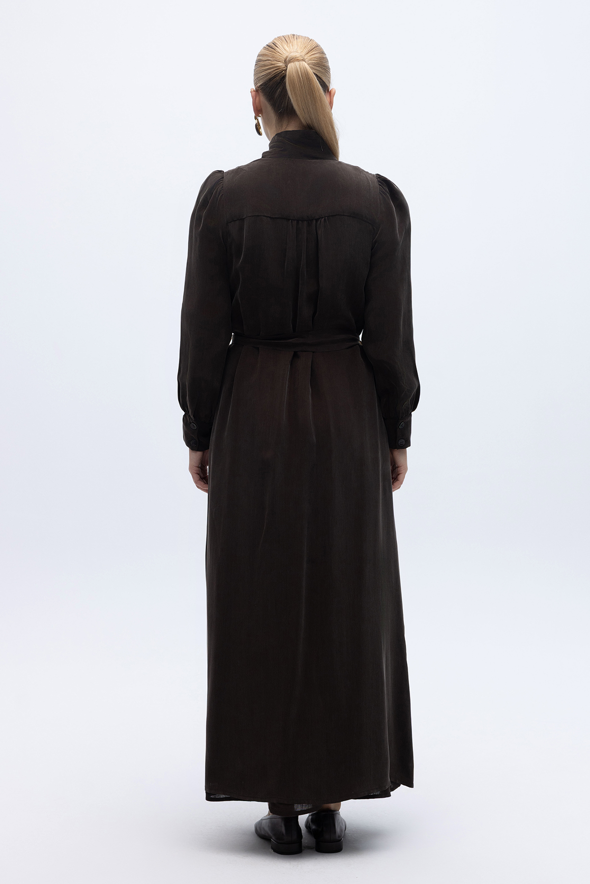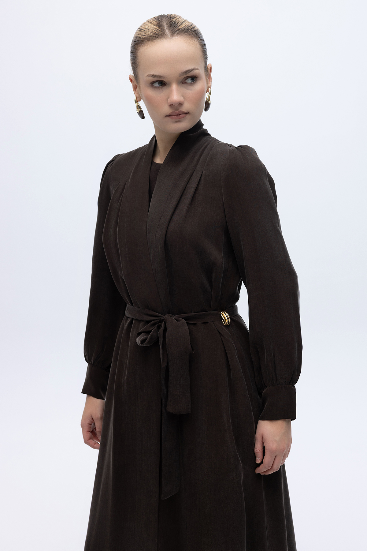 Kemer Tokalı Uzun Cupro Ceket Kahverengi
