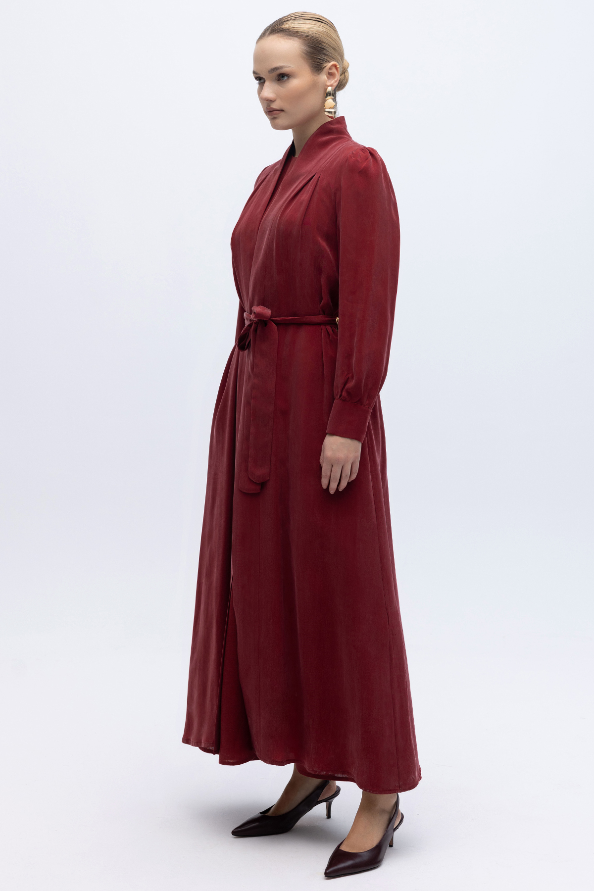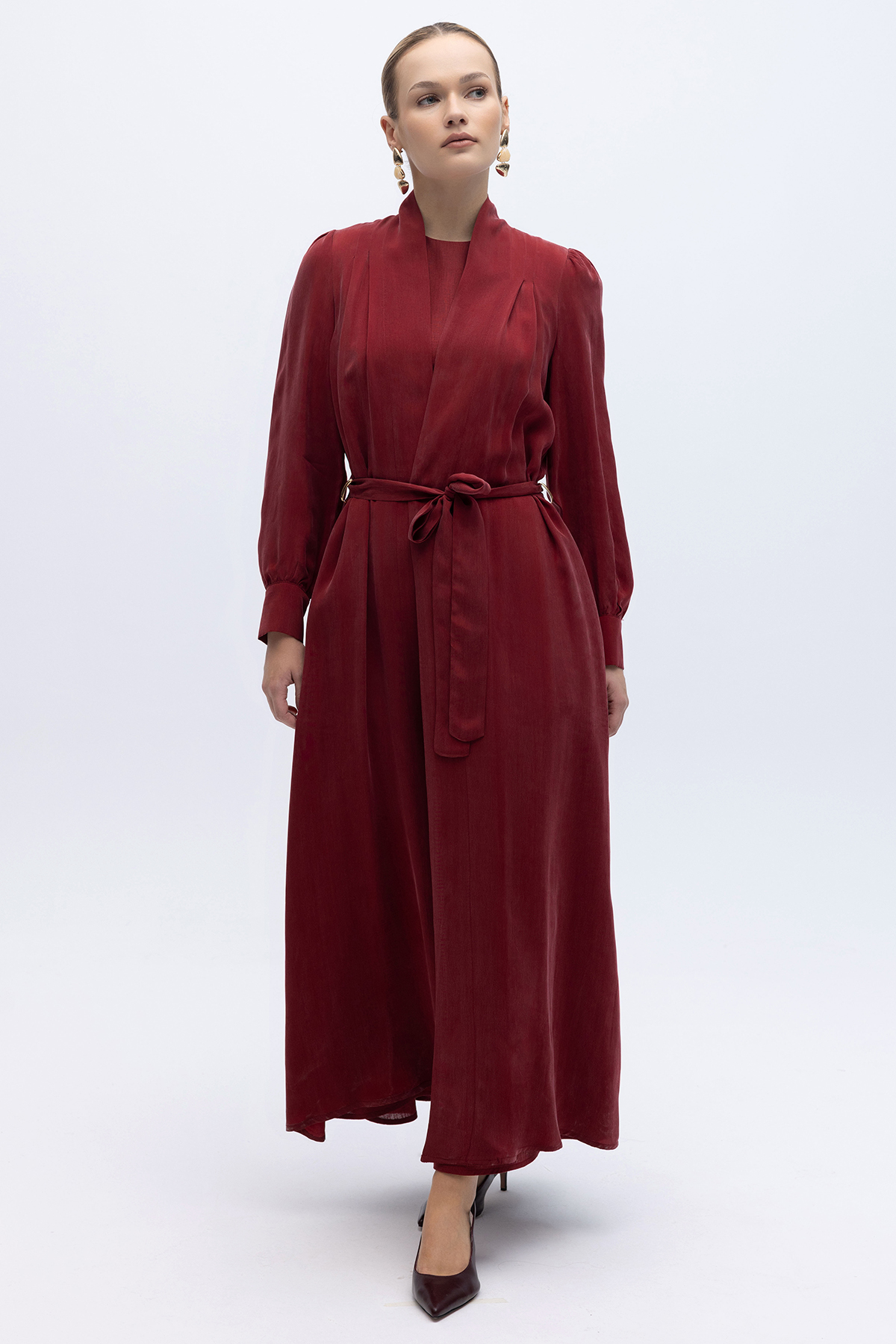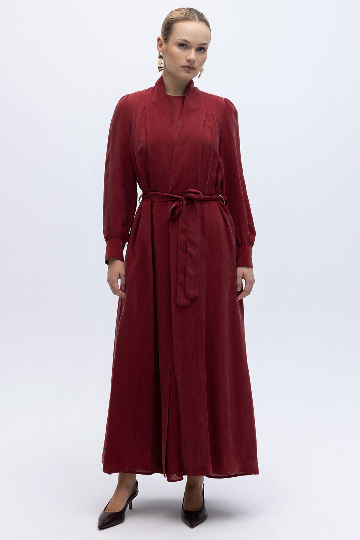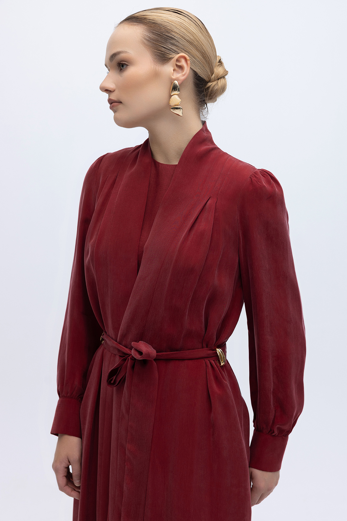 Kemer Tokalı Uzun Cupro Ceket Cherry