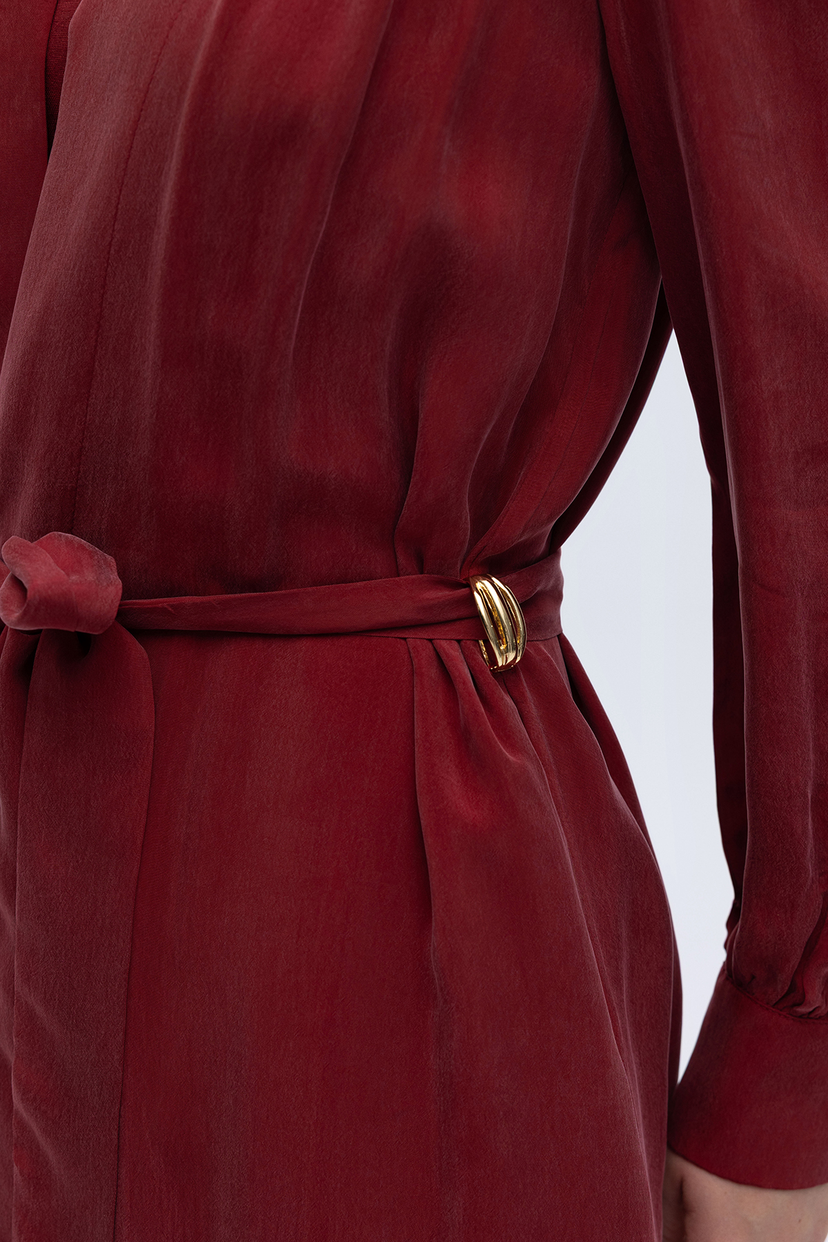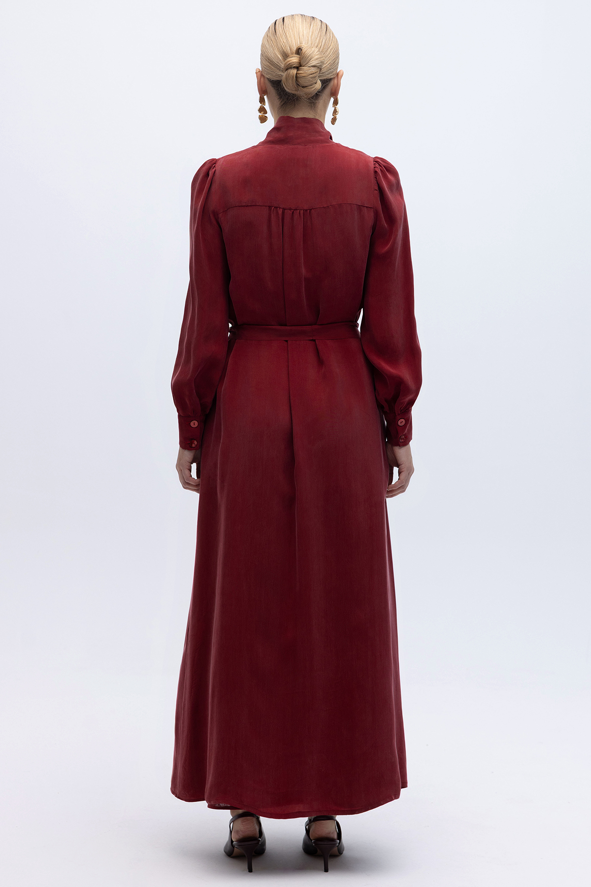 Fırfır Detaylı Uzun Cupro Elbise Cherry