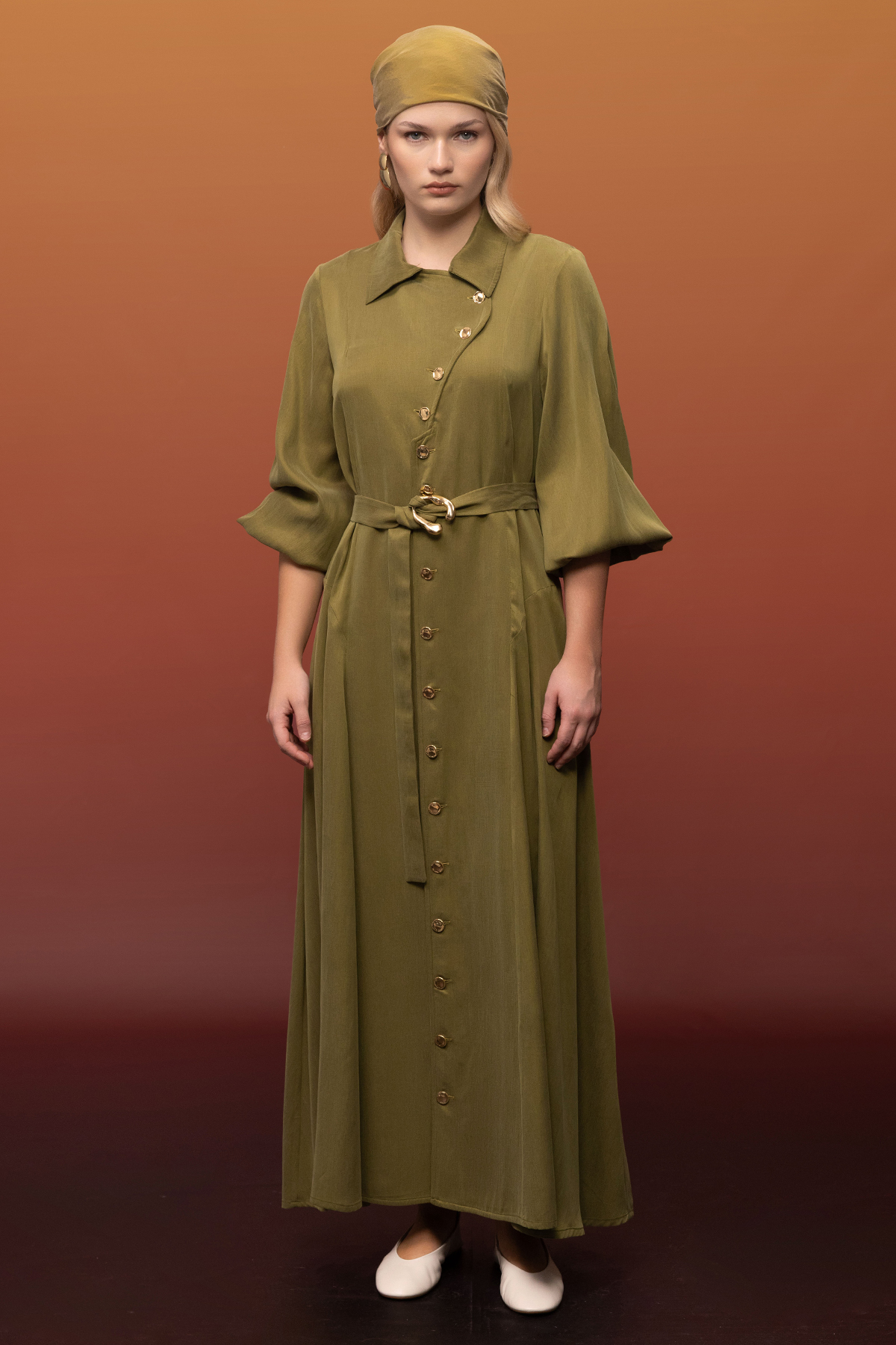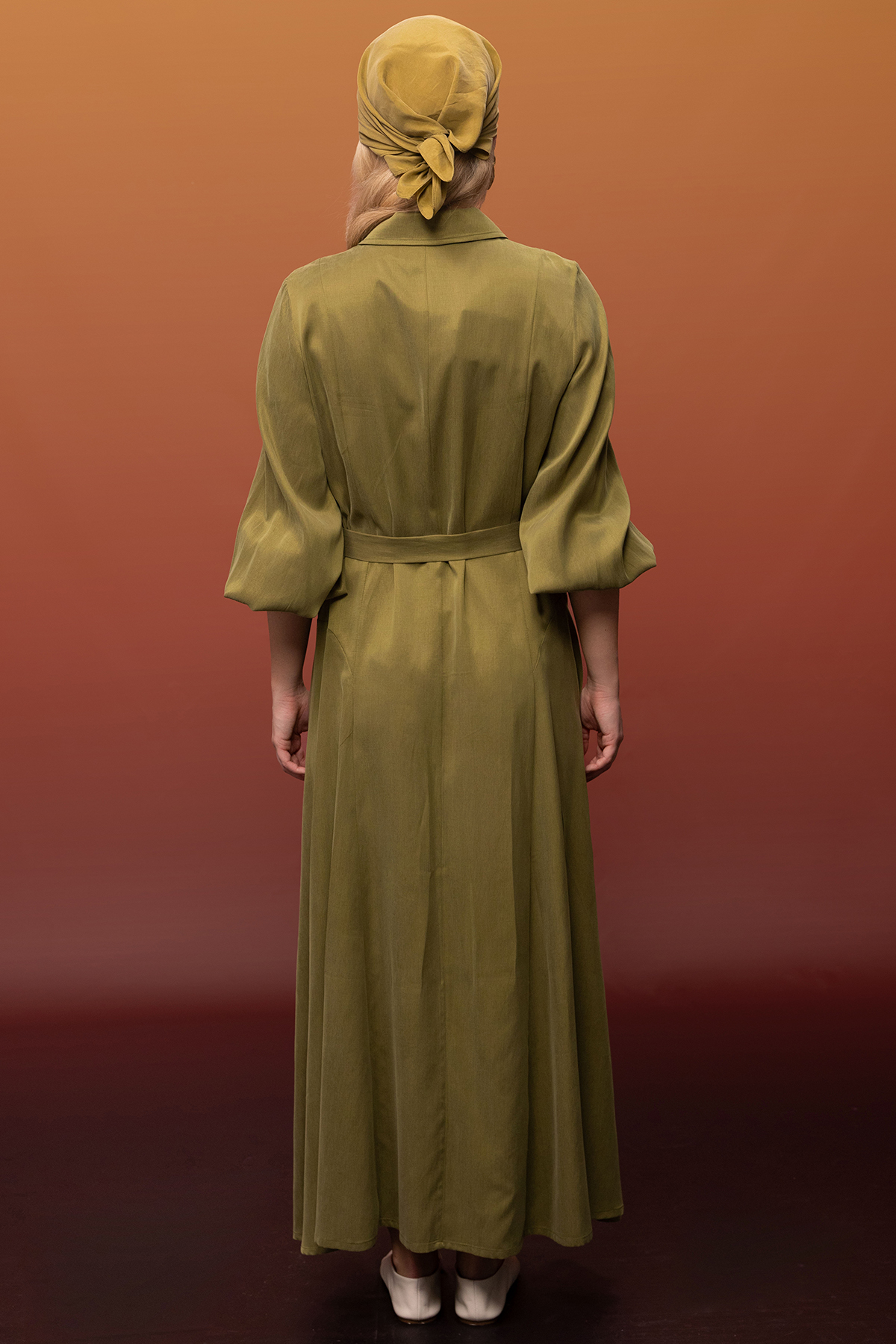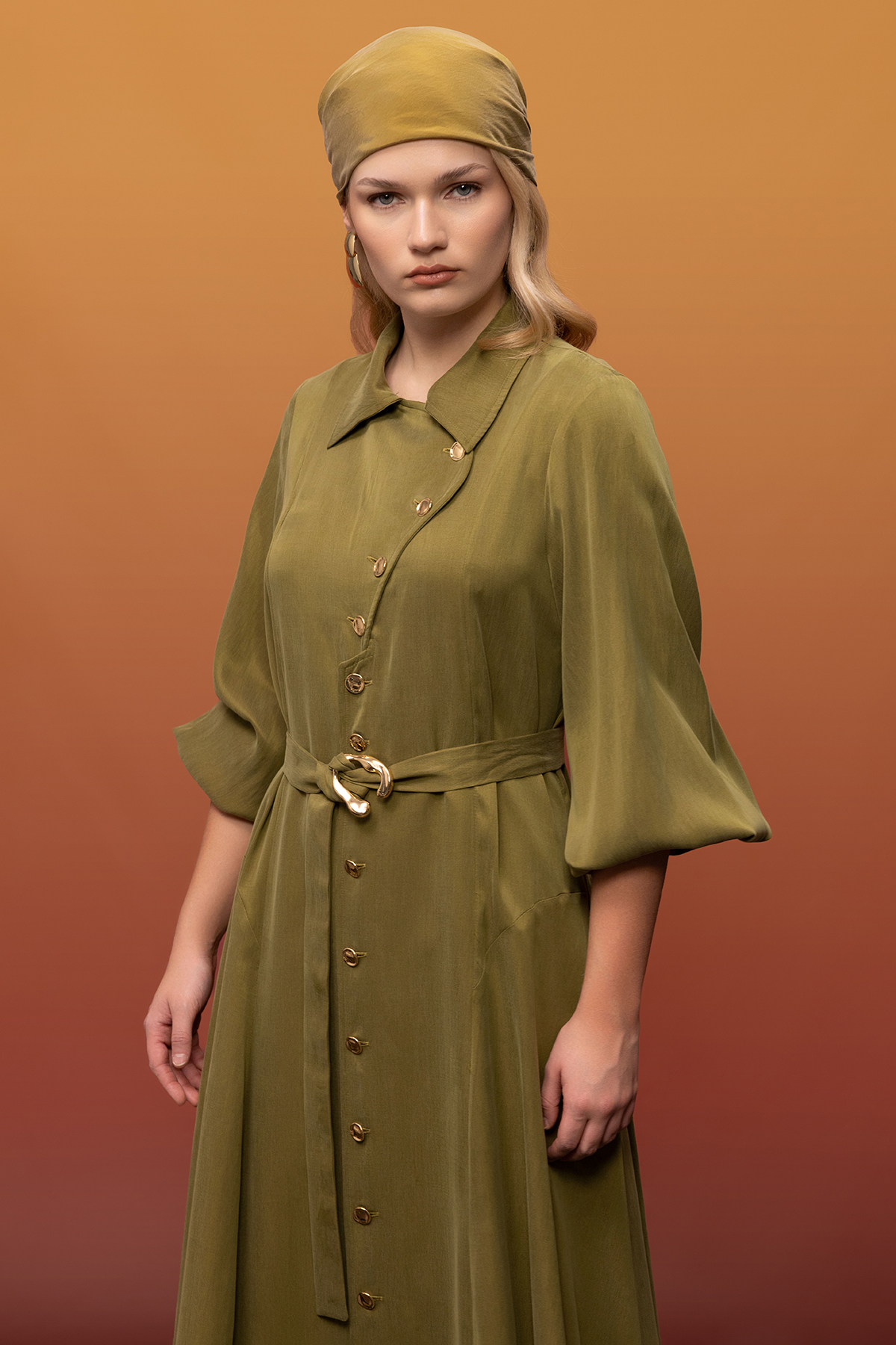 Kemer ve Düğme Detalı Cupro Keten Elbise Olive