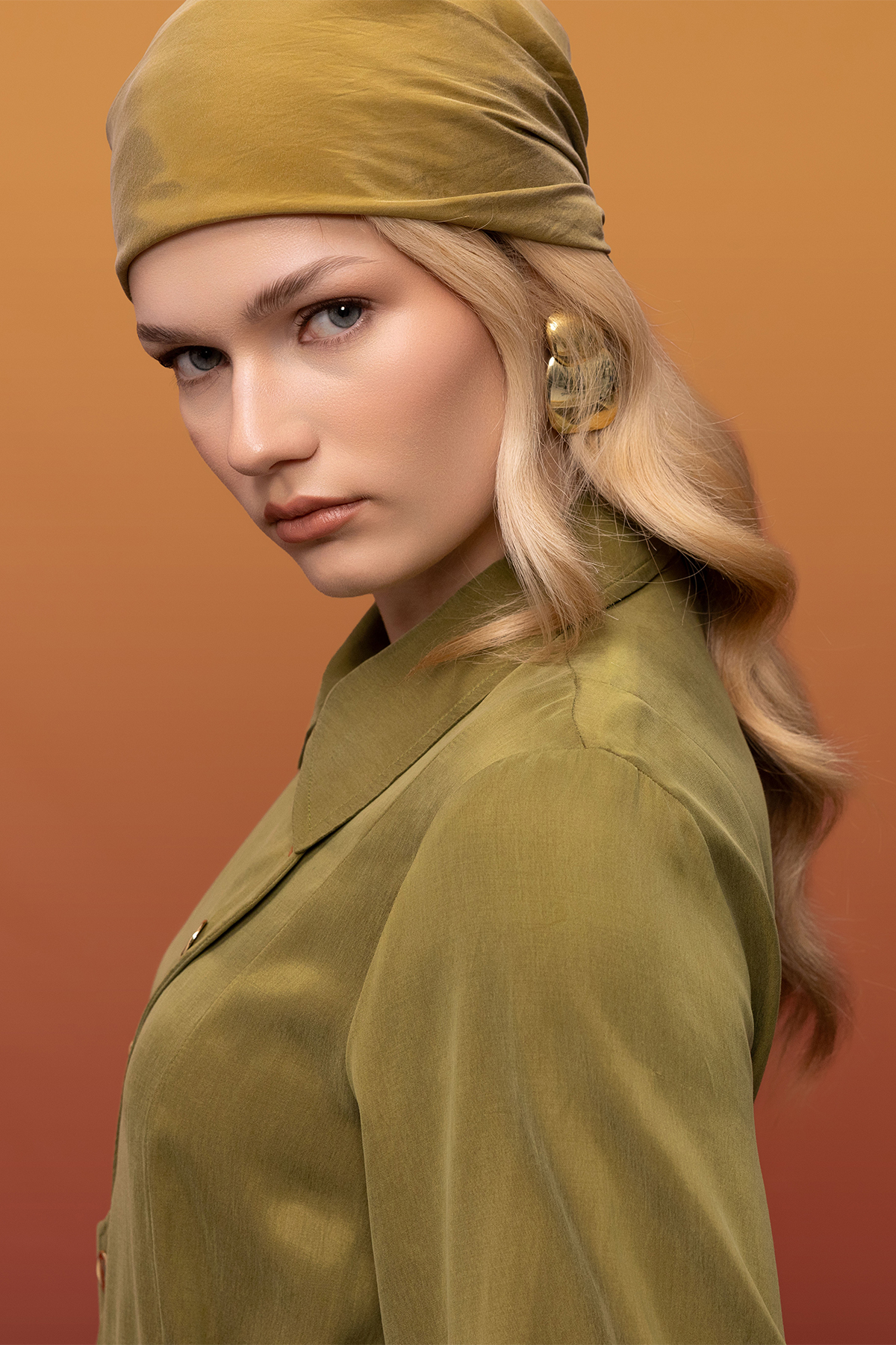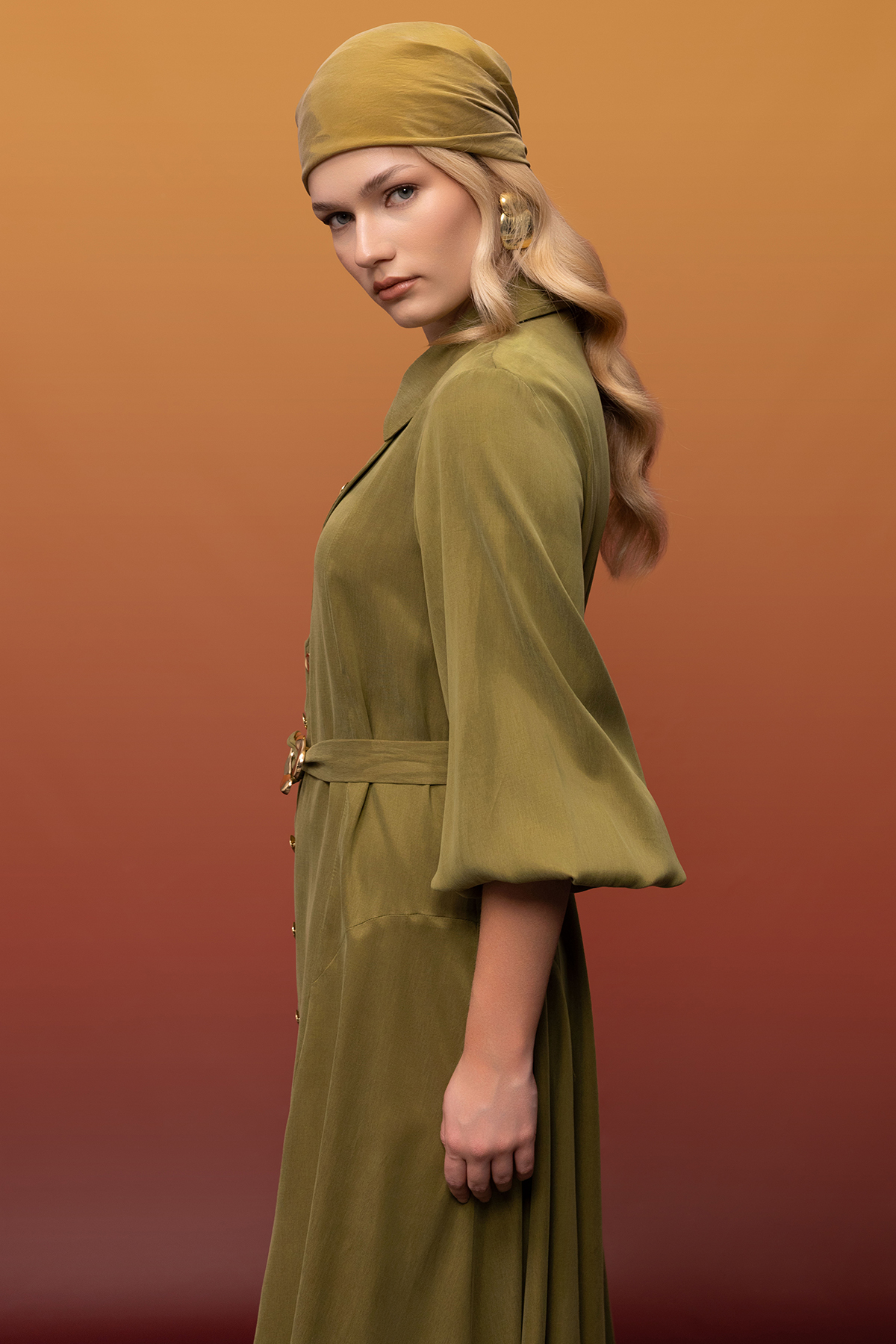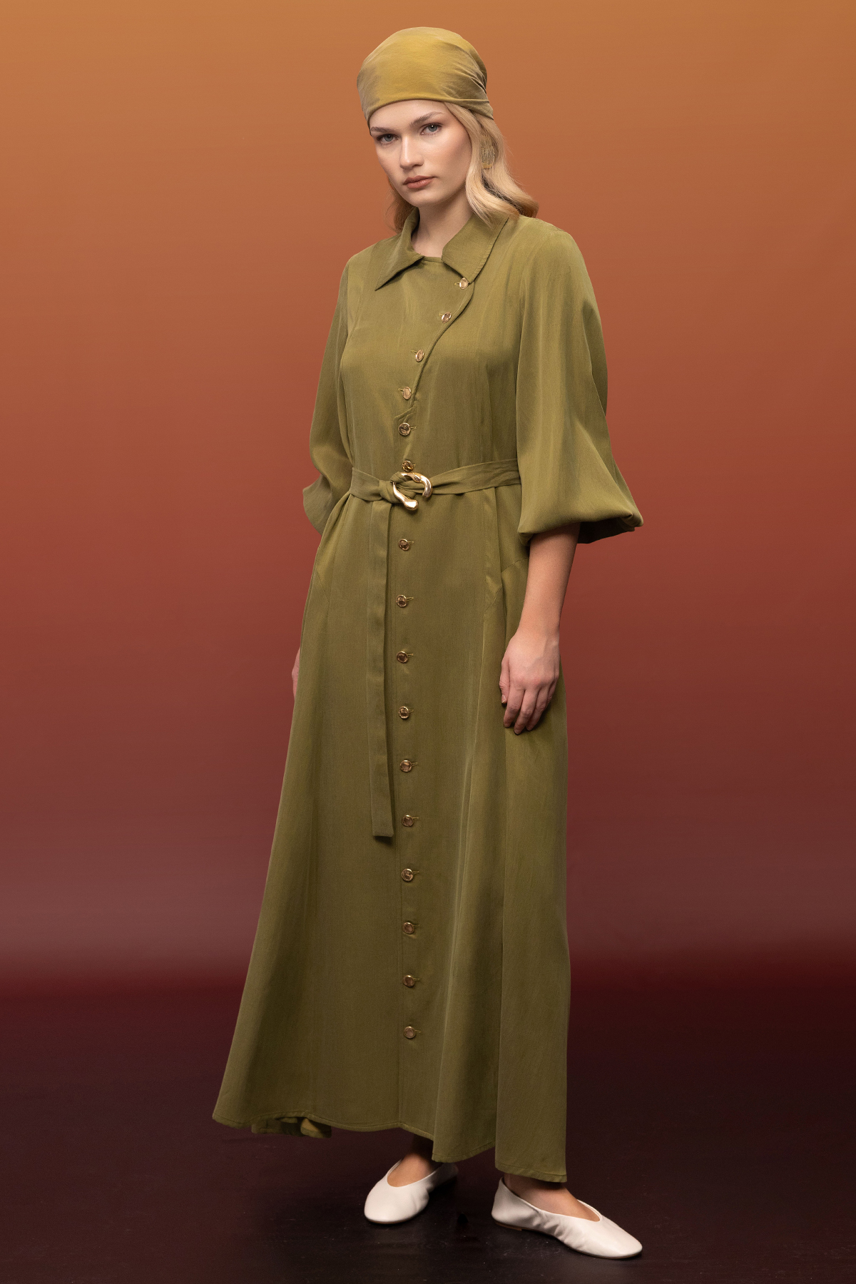 Kemer ve Düğme Detalı Cupro Keten Elbise Olive