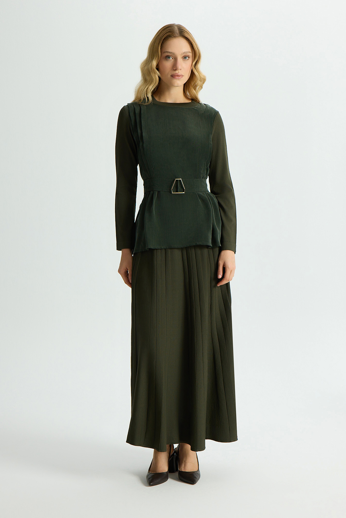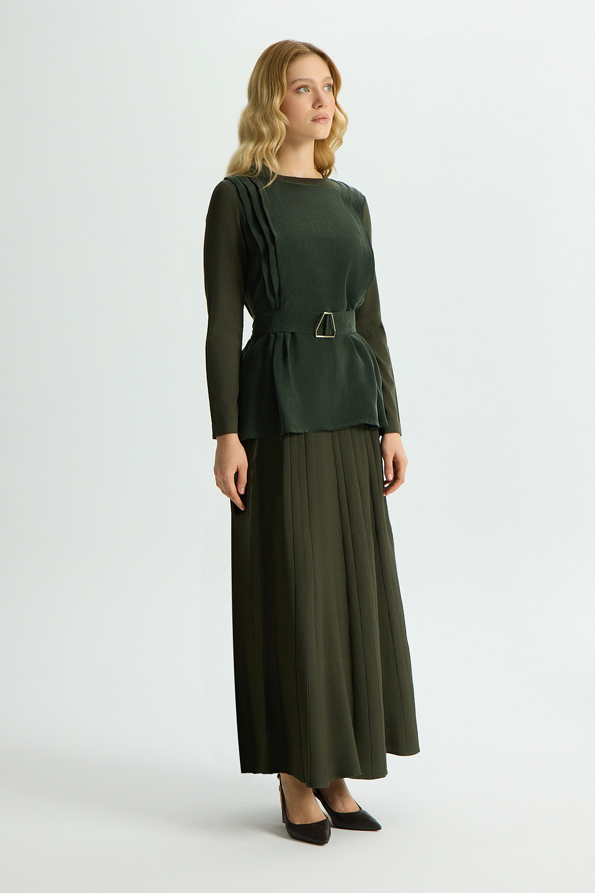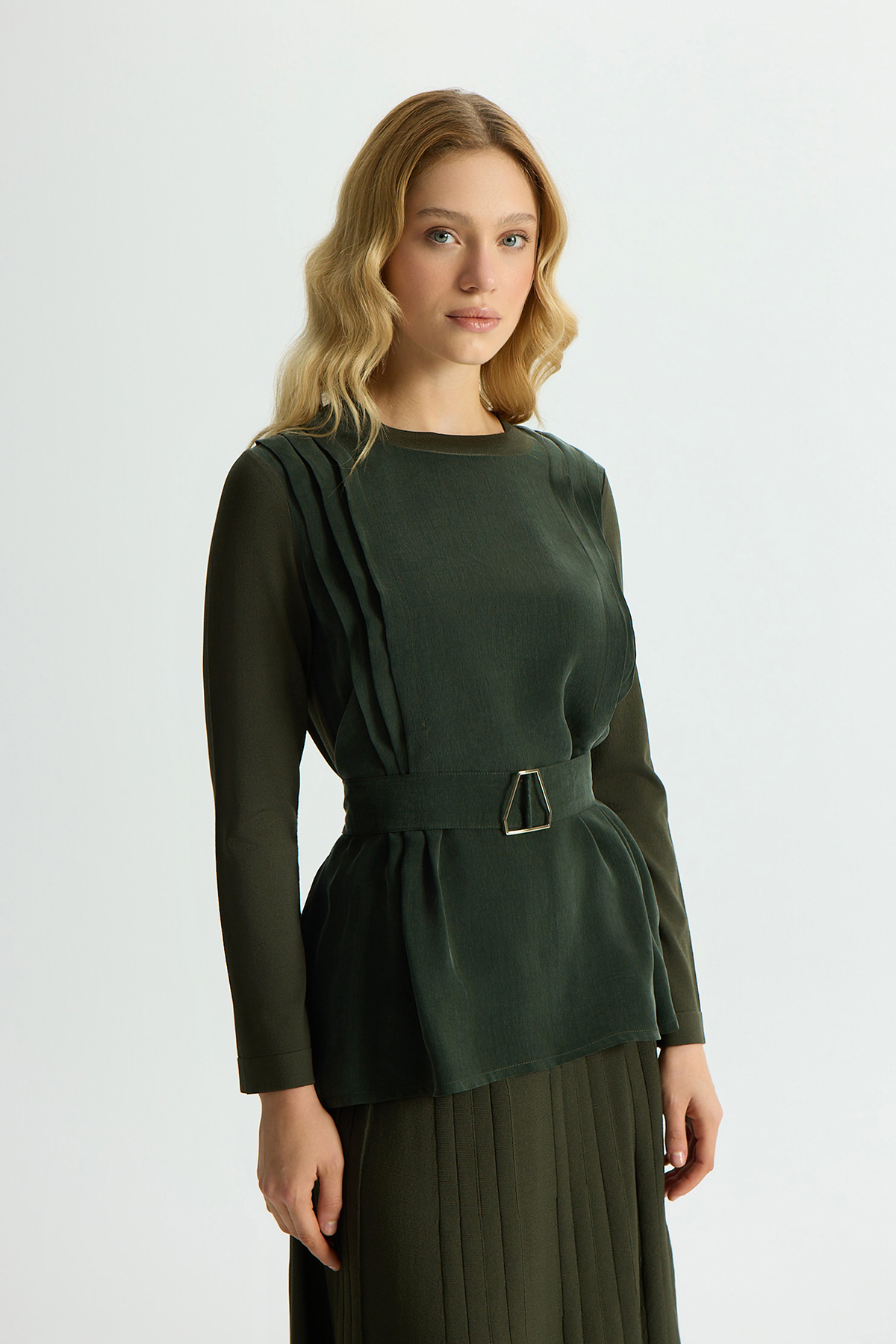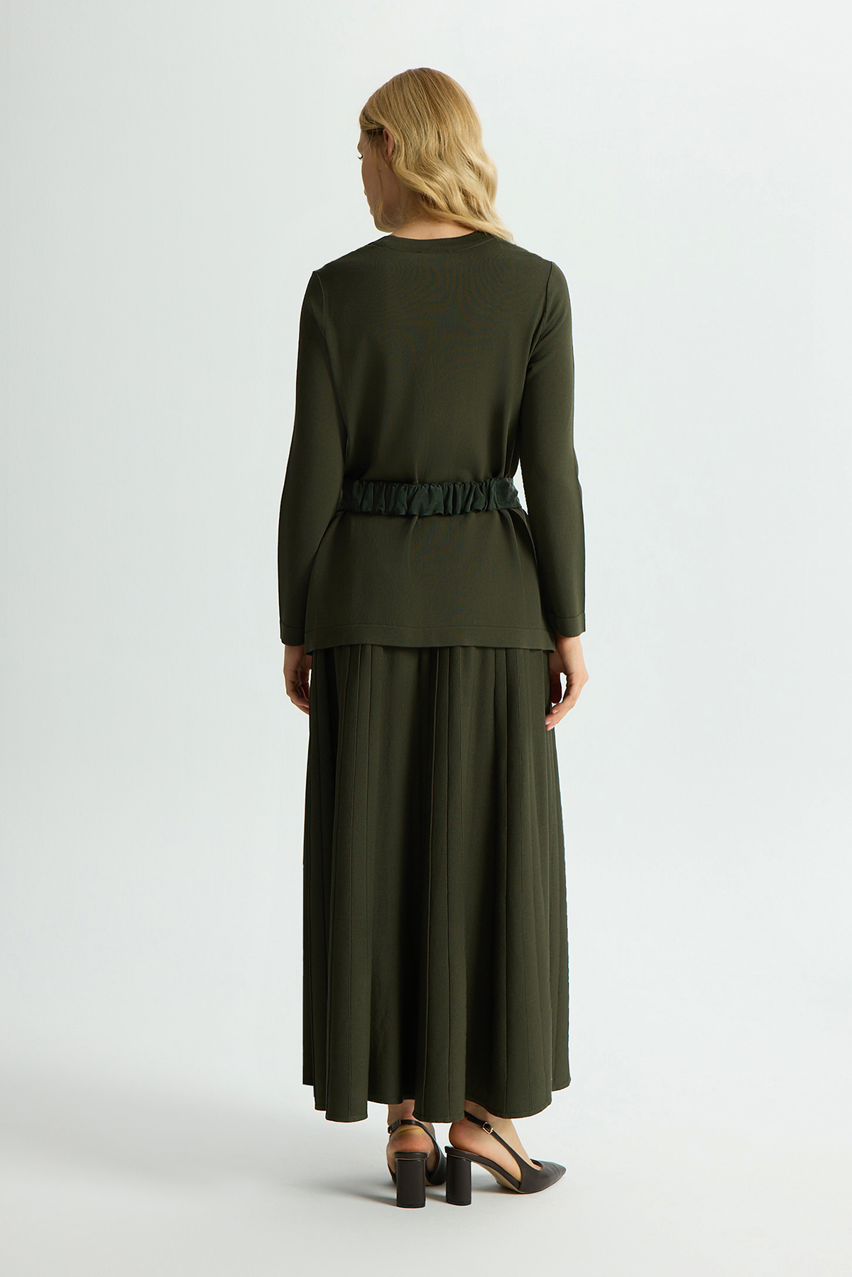 Kemerli Pile Detaylı Cupro Tunik Haki