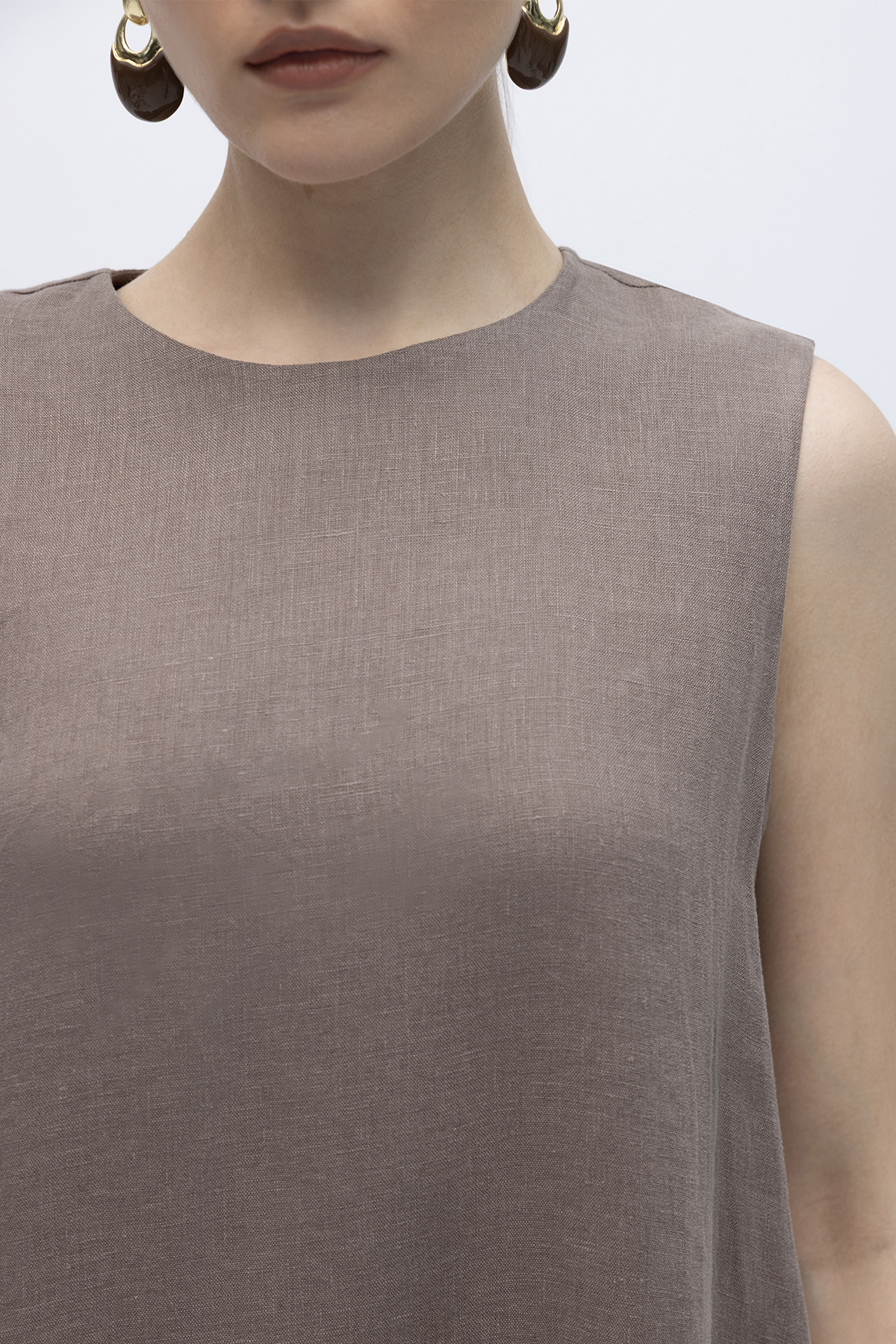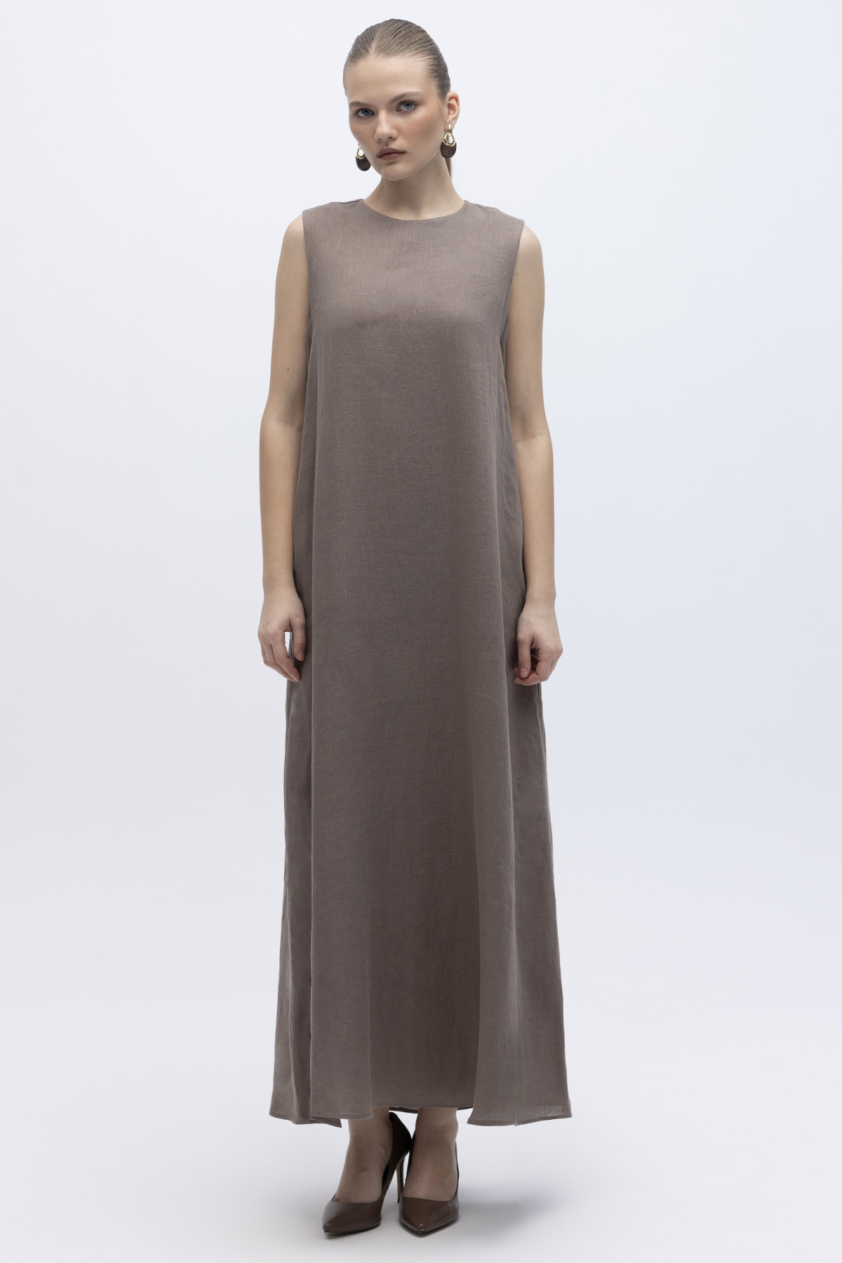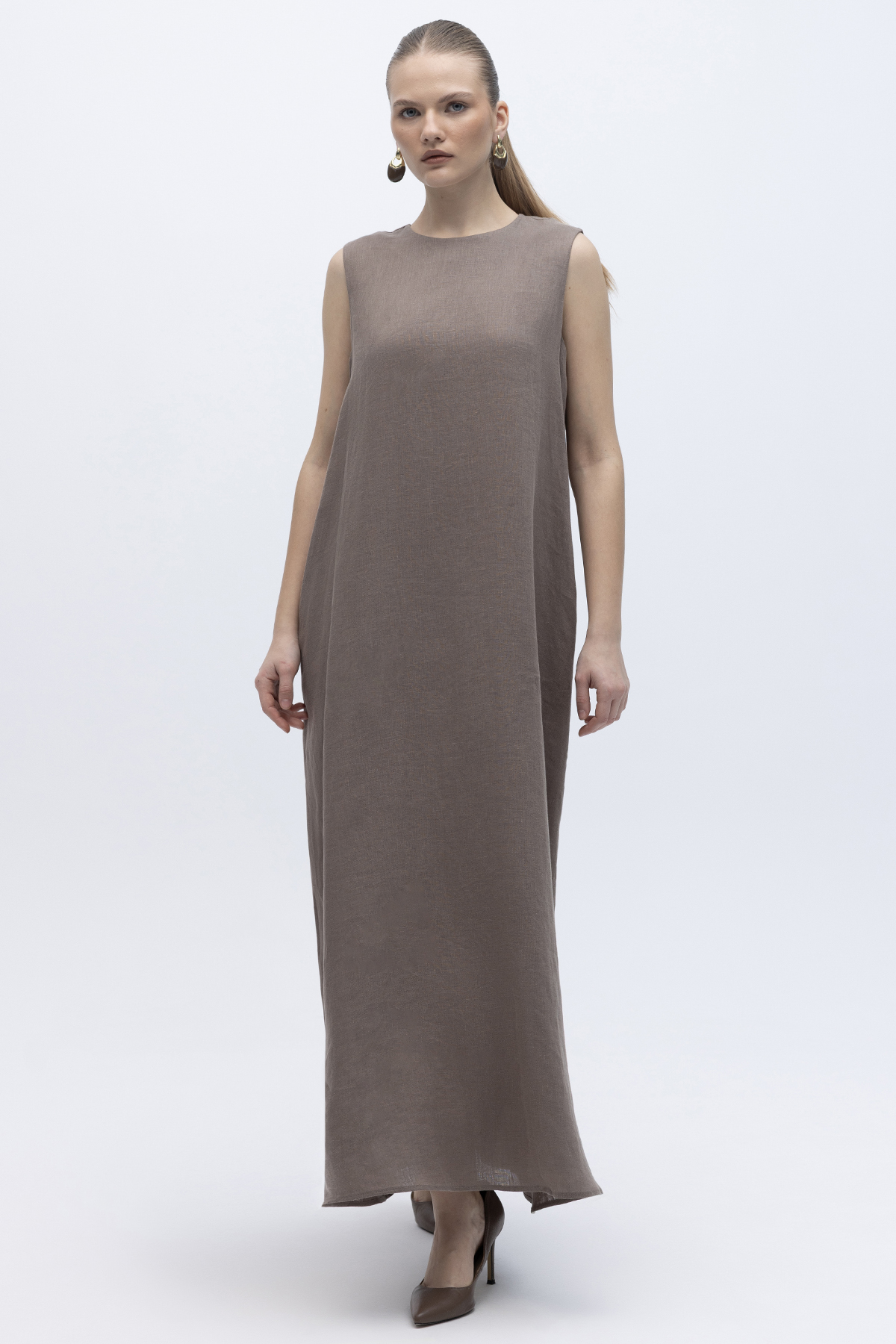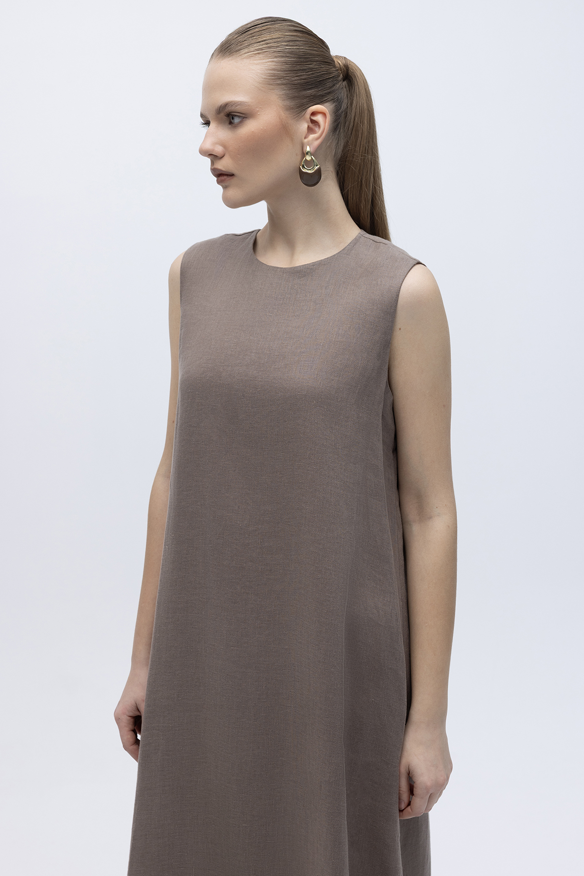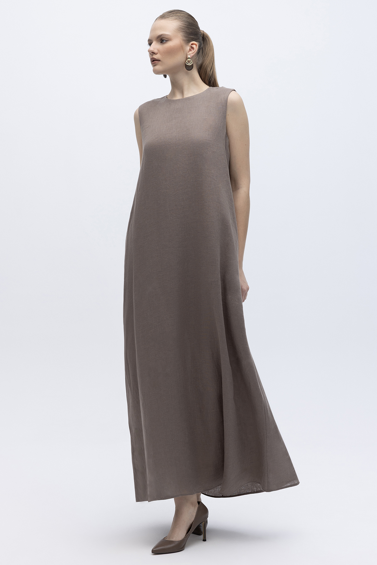 Kolsuz Düz Renk Keten Elbise Mink