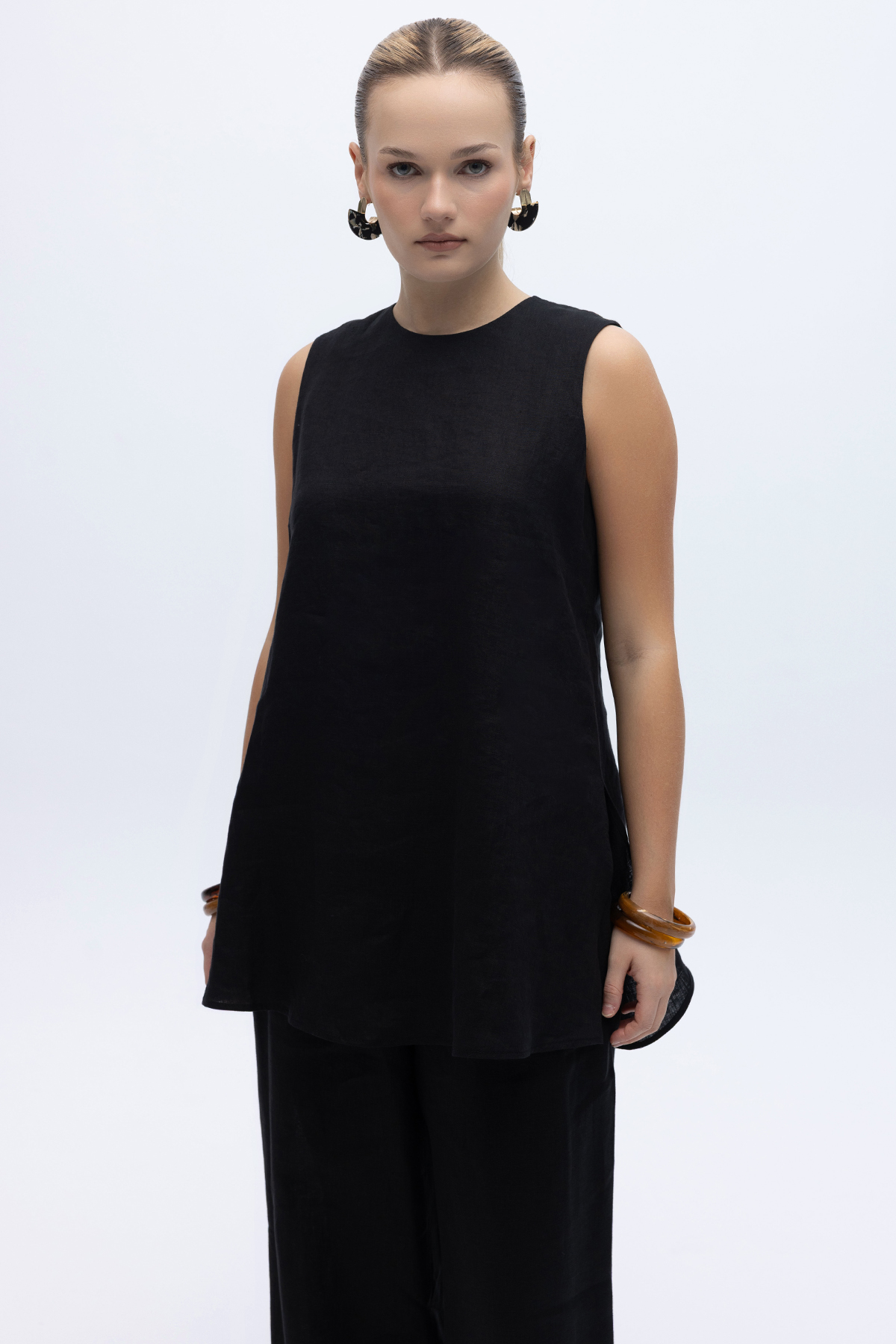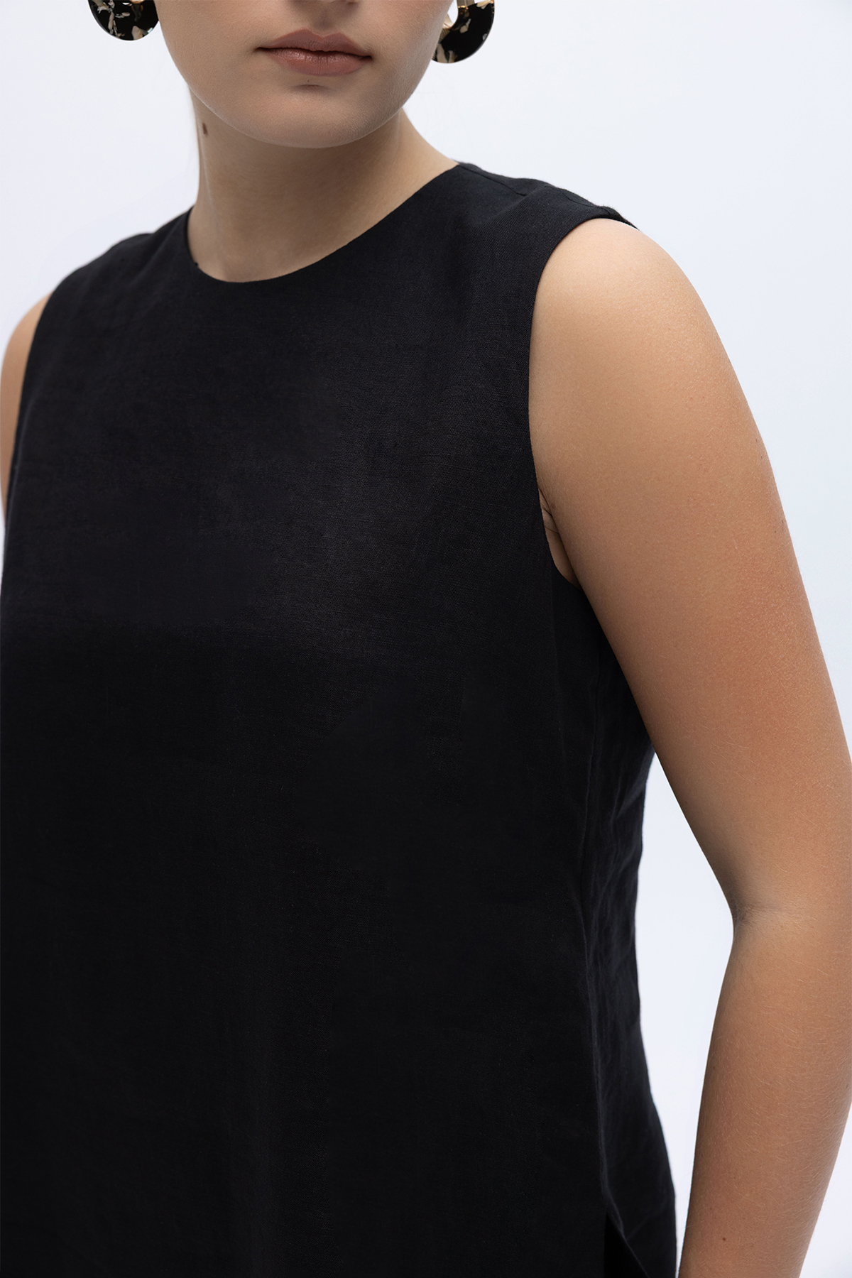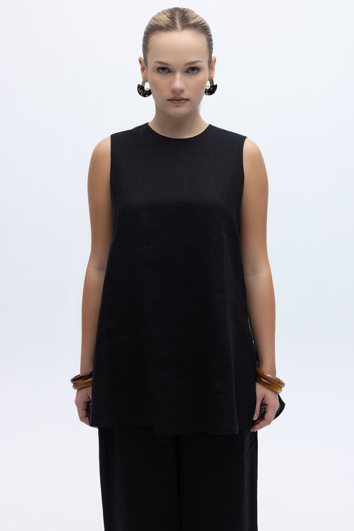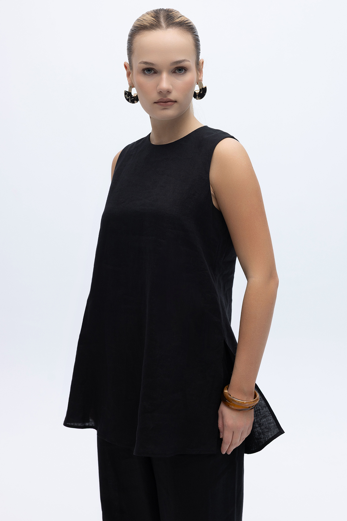 Kolsuz Düz Renk Keten Tunik Siyah