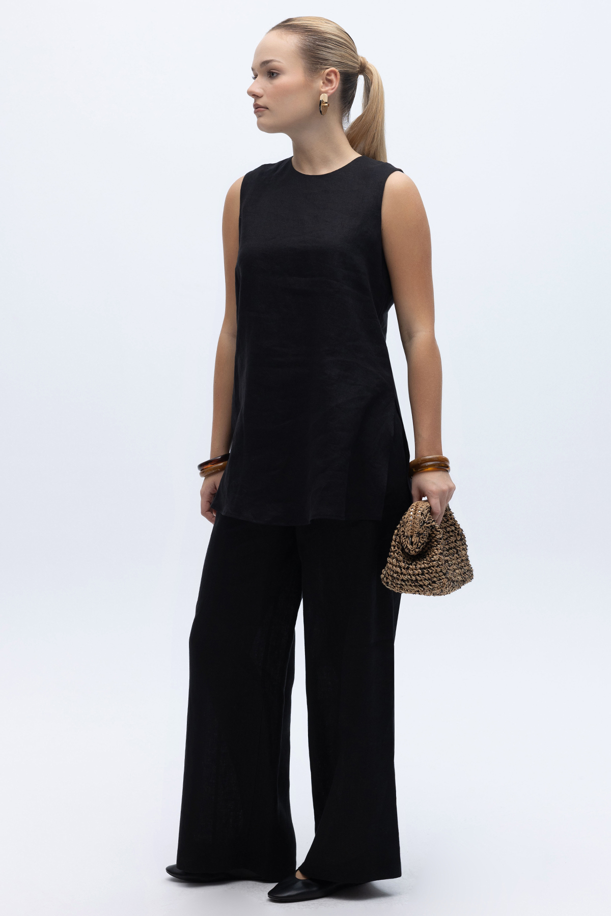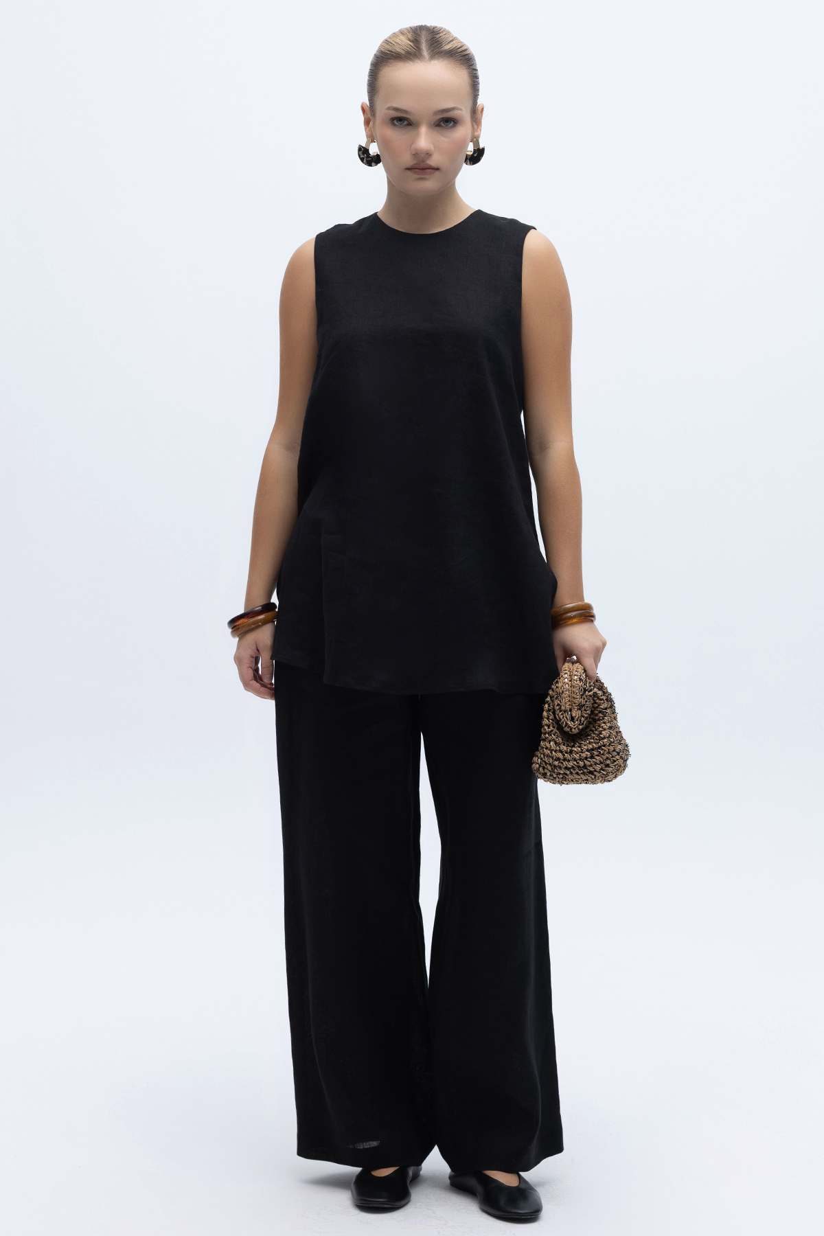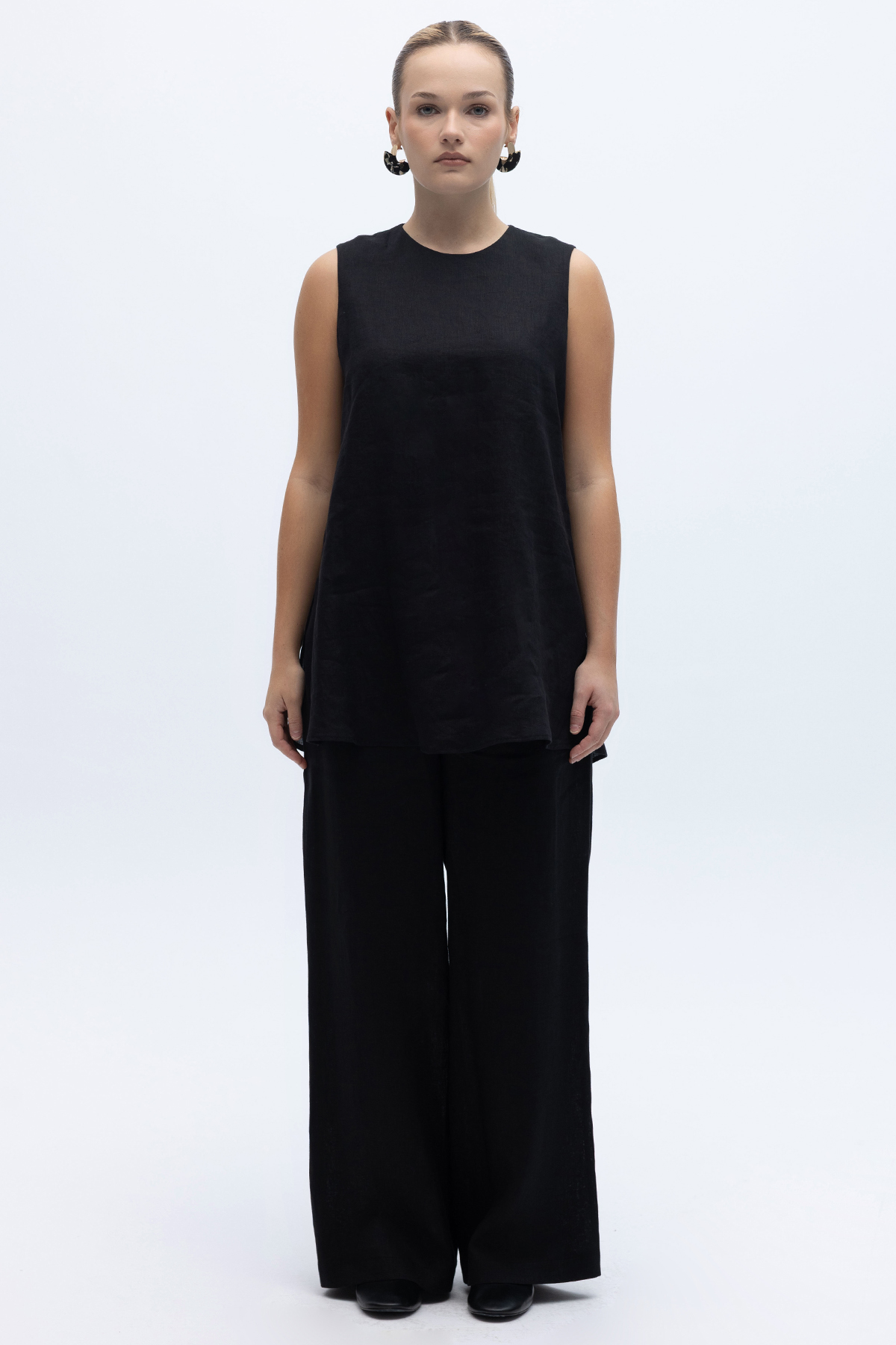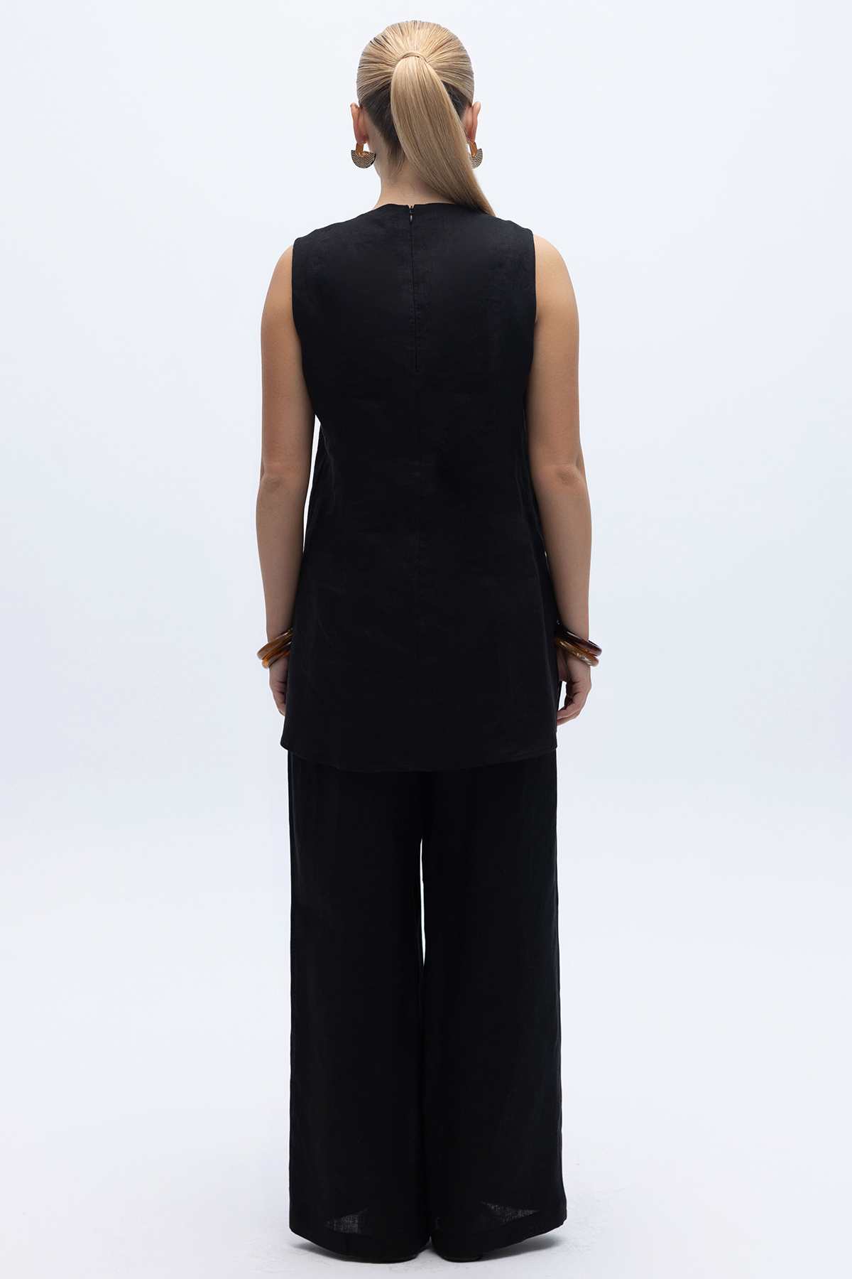 Kolsuz Düz Renk Keten Tunik Siyah