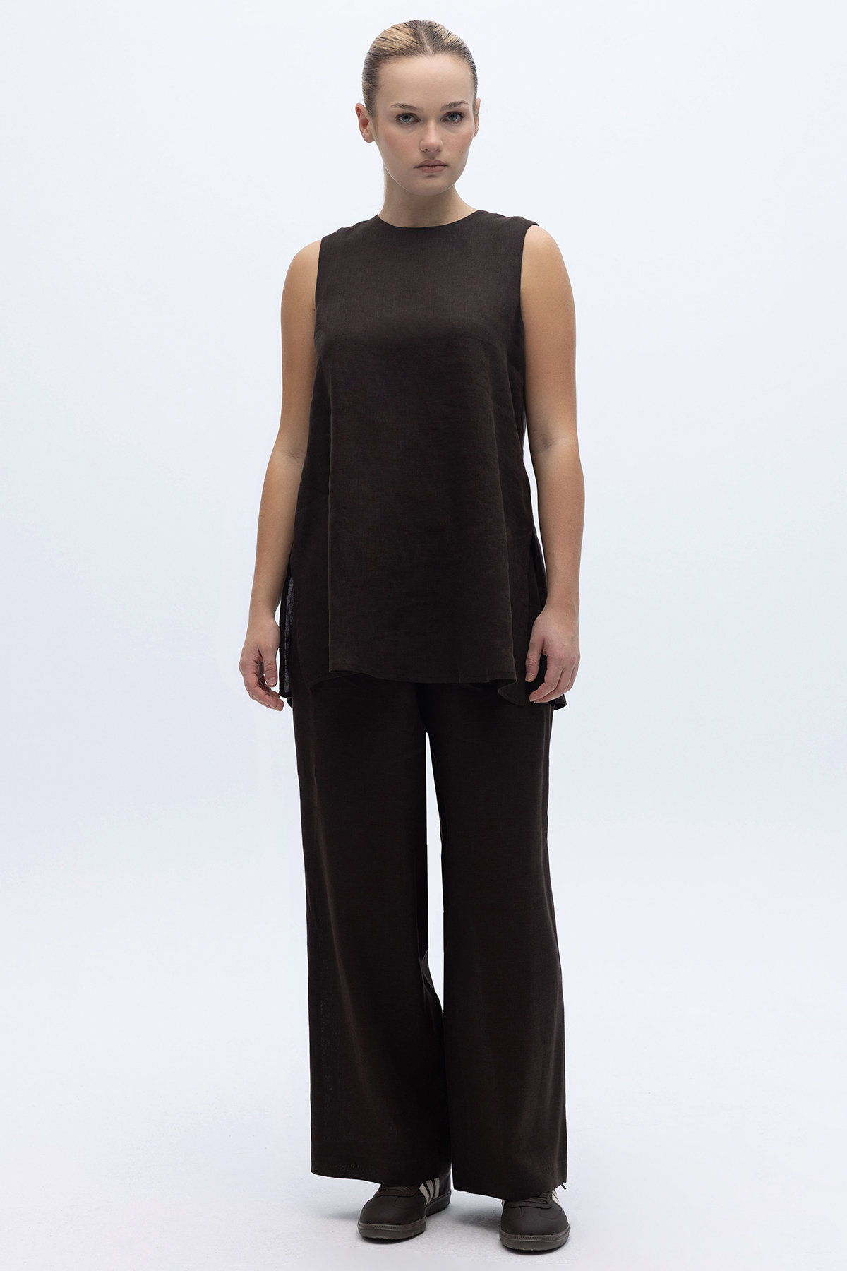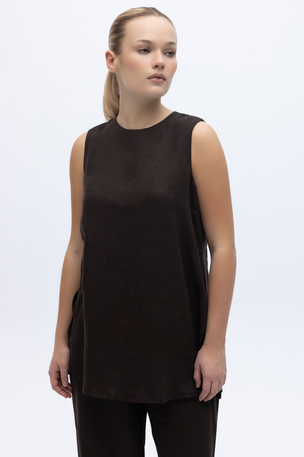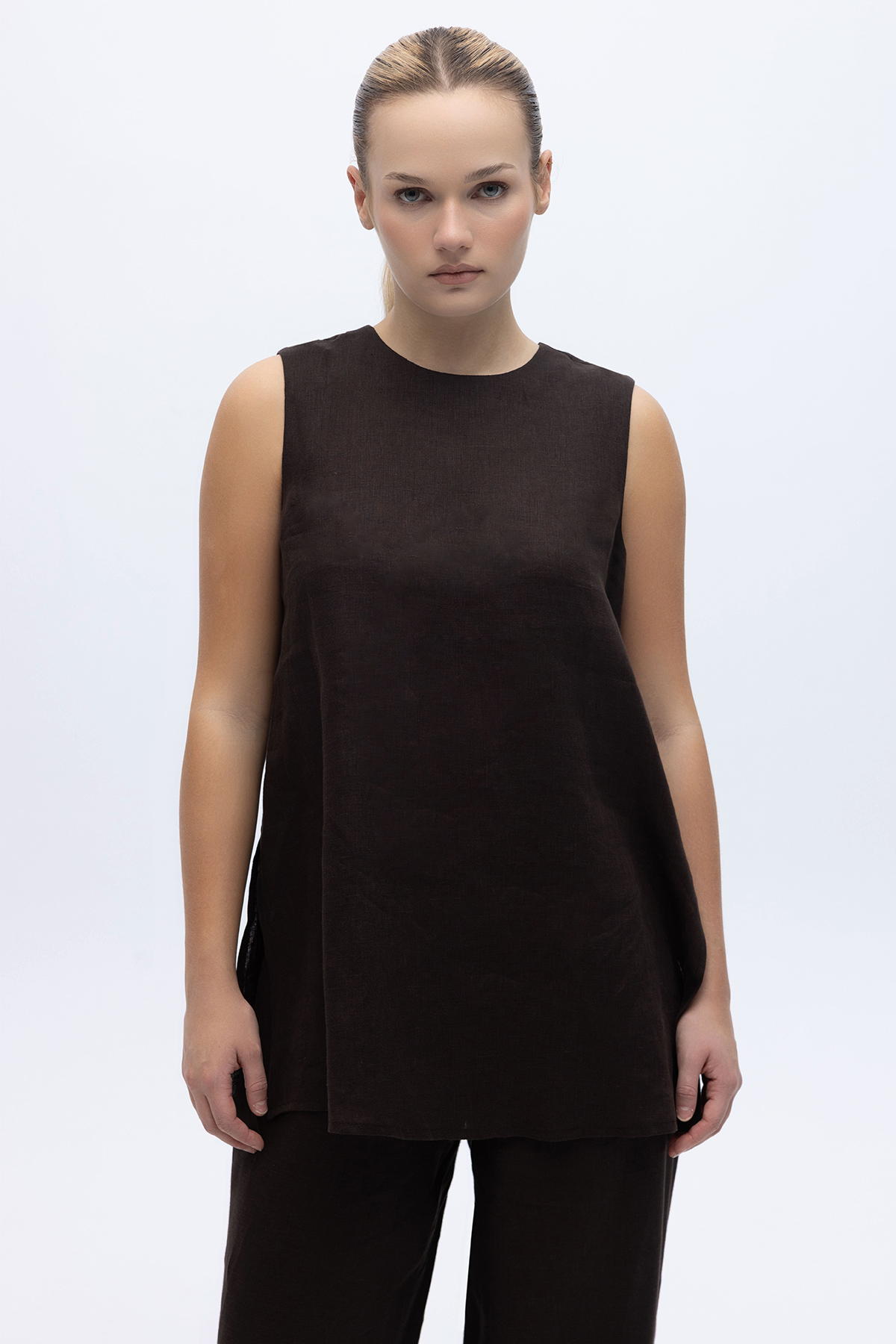 Kolsuz Düz Renk Keten Tunik Kahverengi