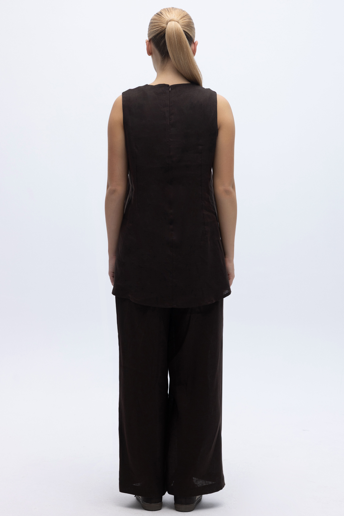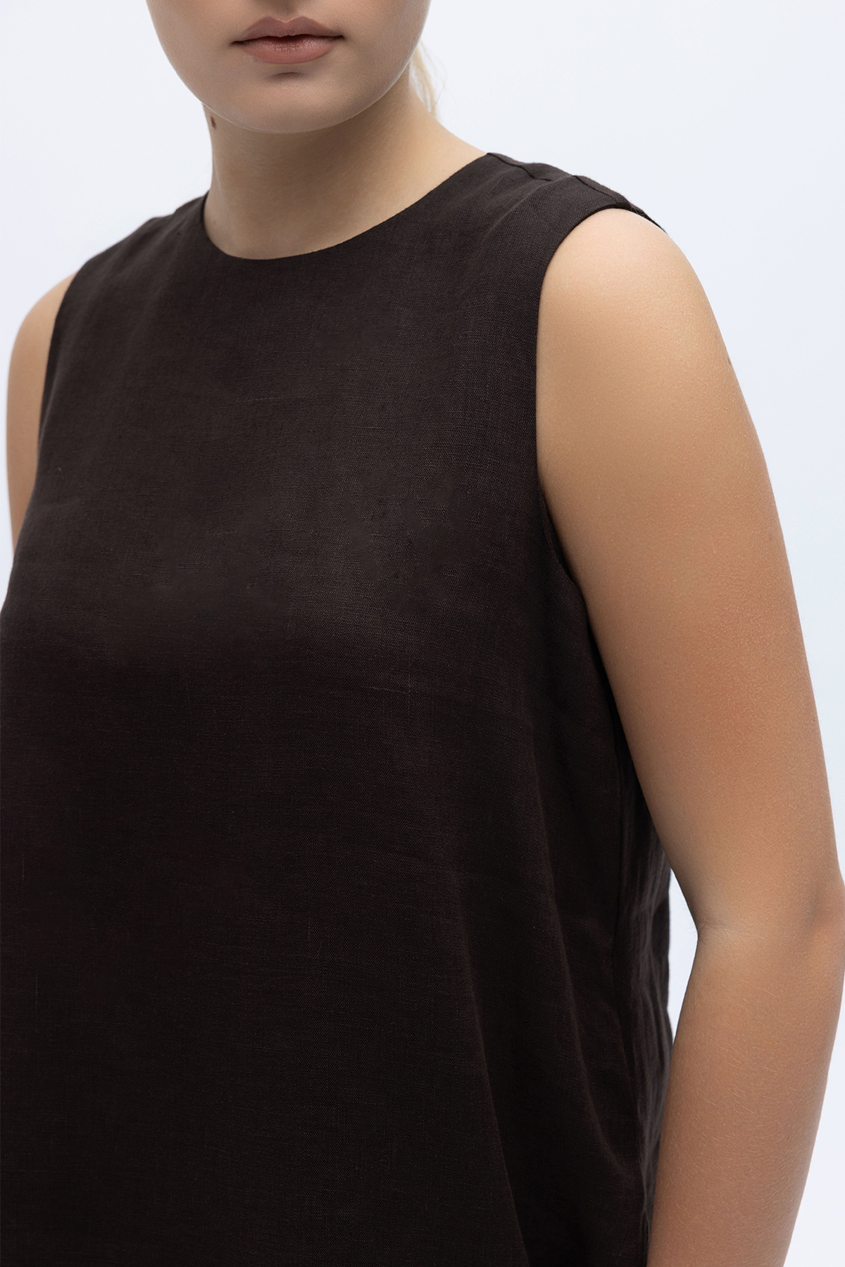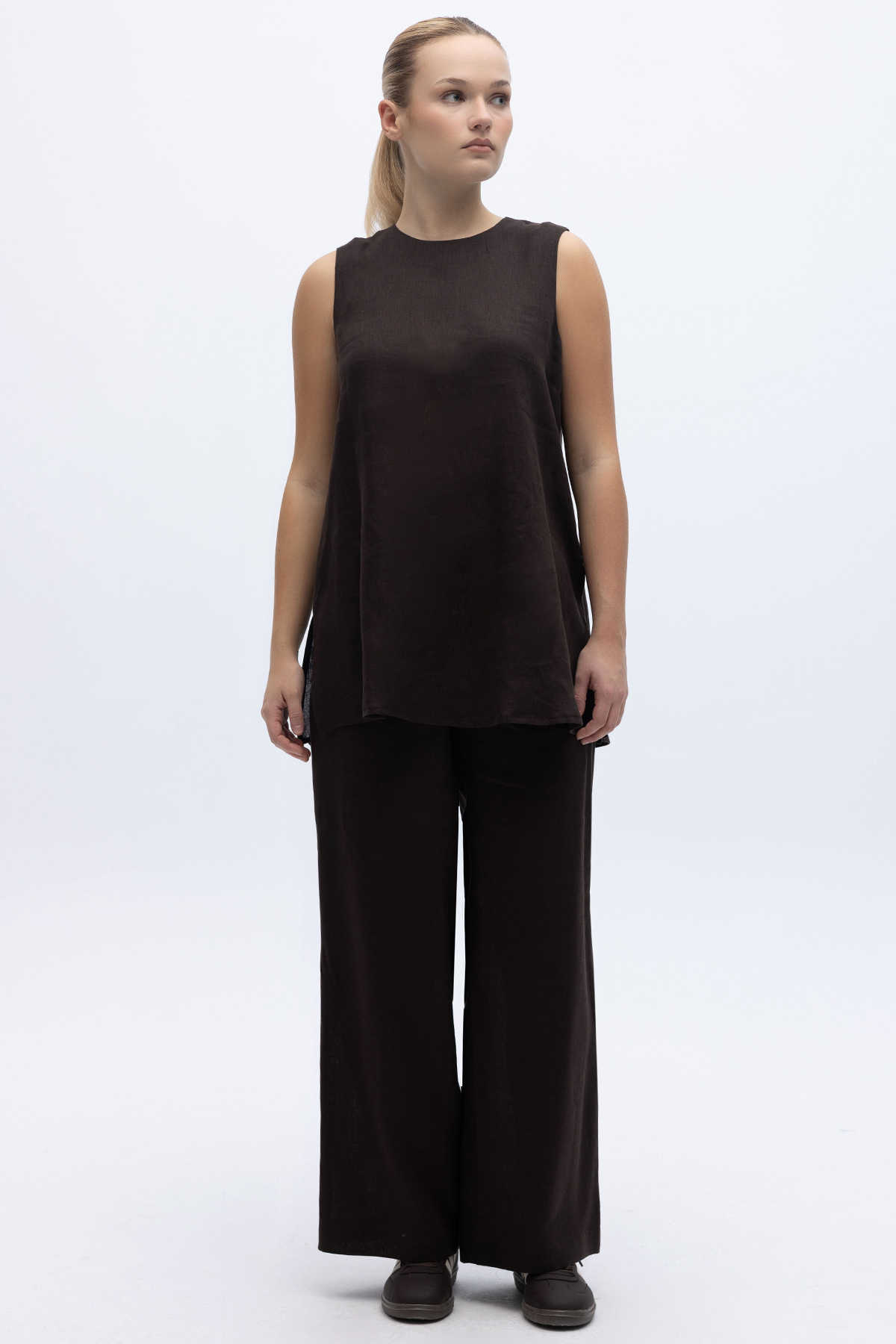 Kolsuz Düz Renk Keten Tunik Kahverengi