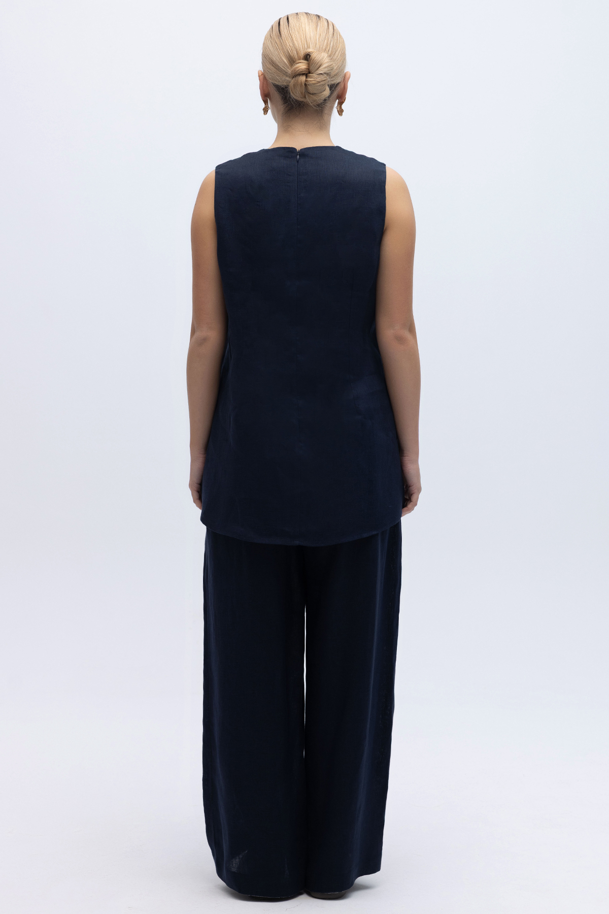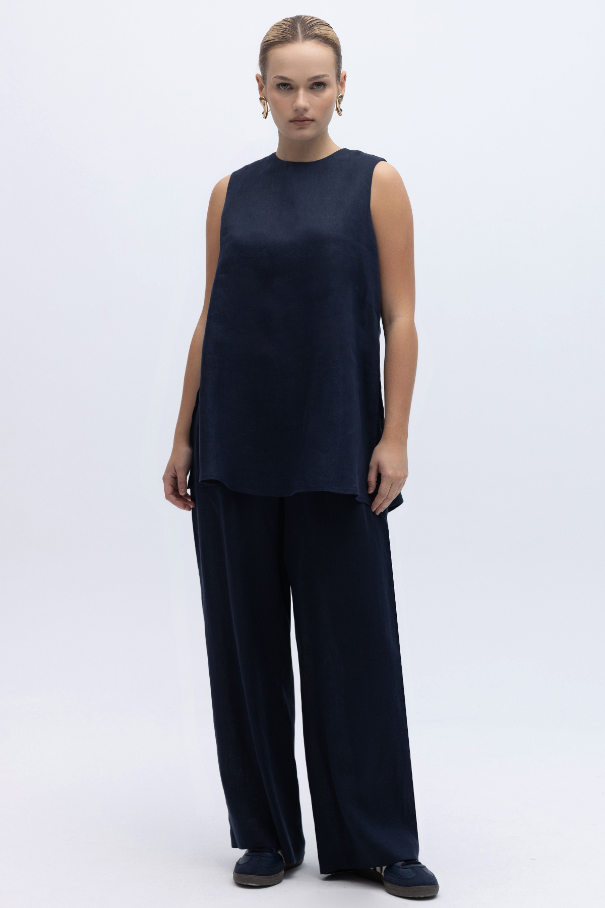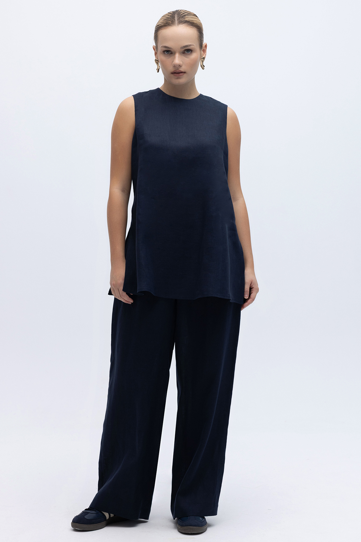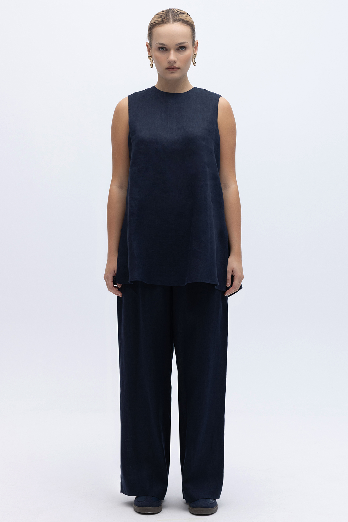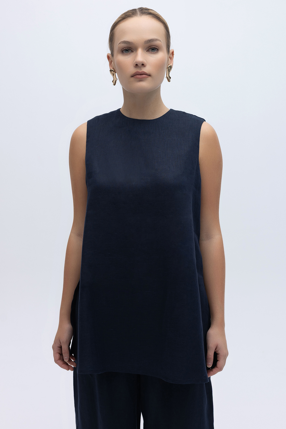 Kolsuz Düz Renk Keten Tunik Lacivert