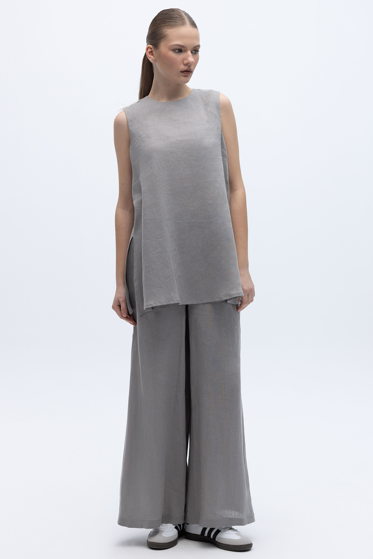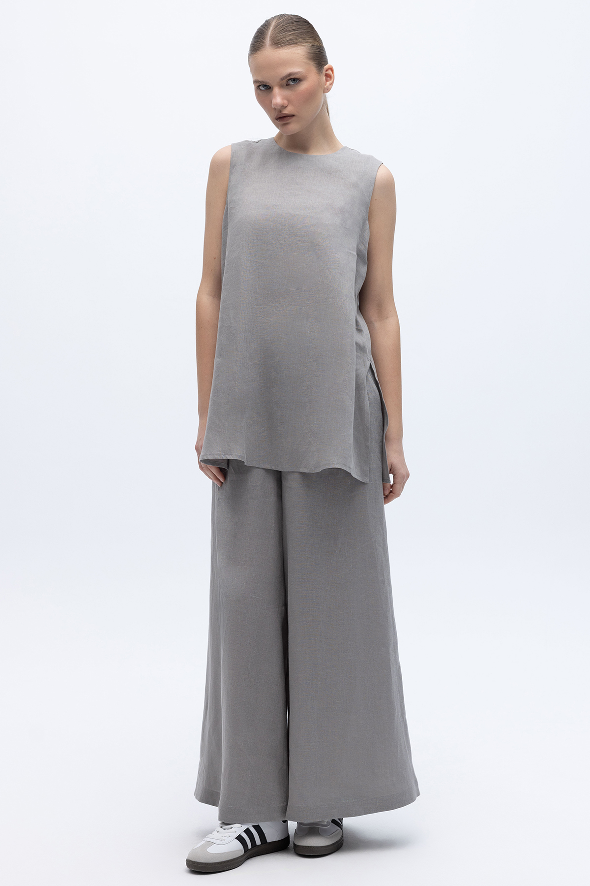 Yanları Düğmeli Düz Renk Keten Etek Cherry