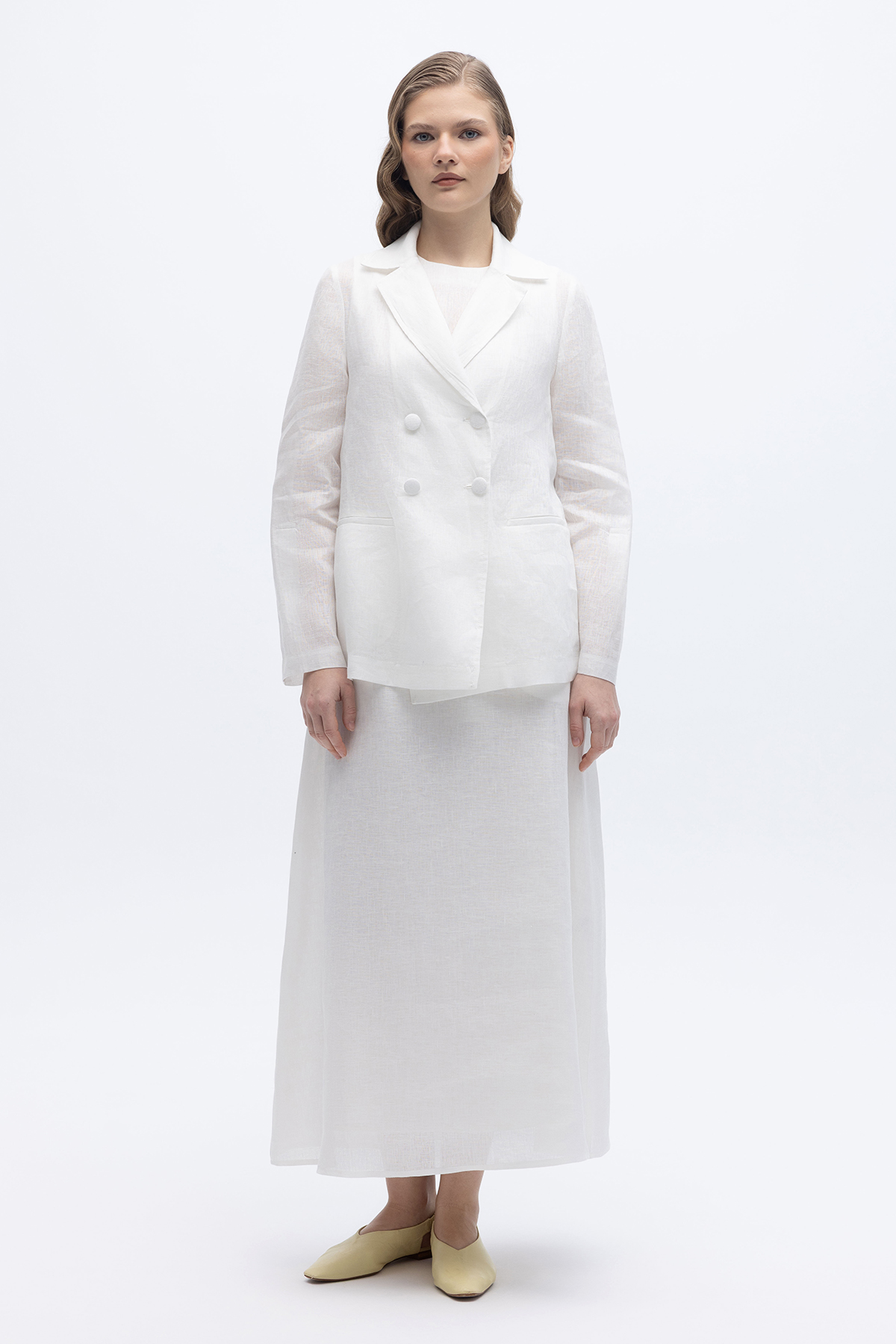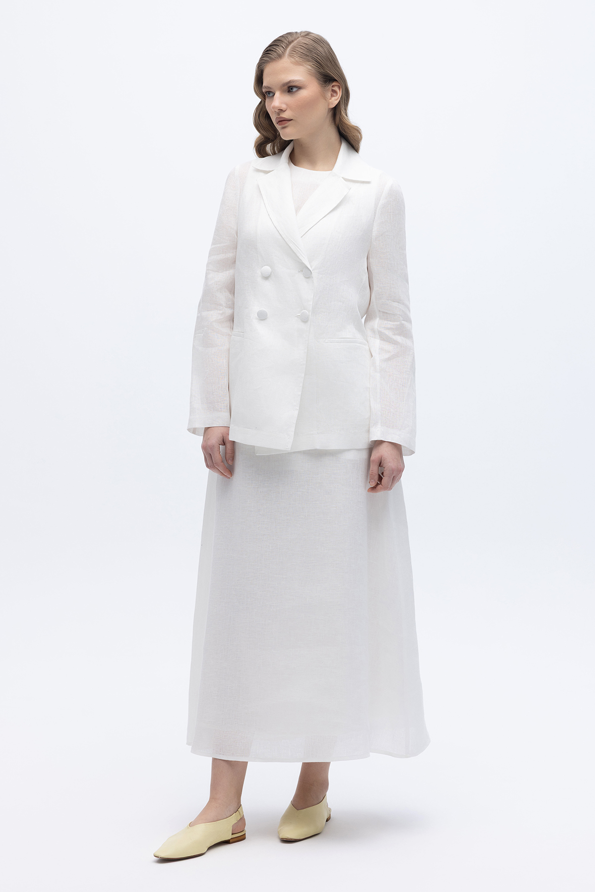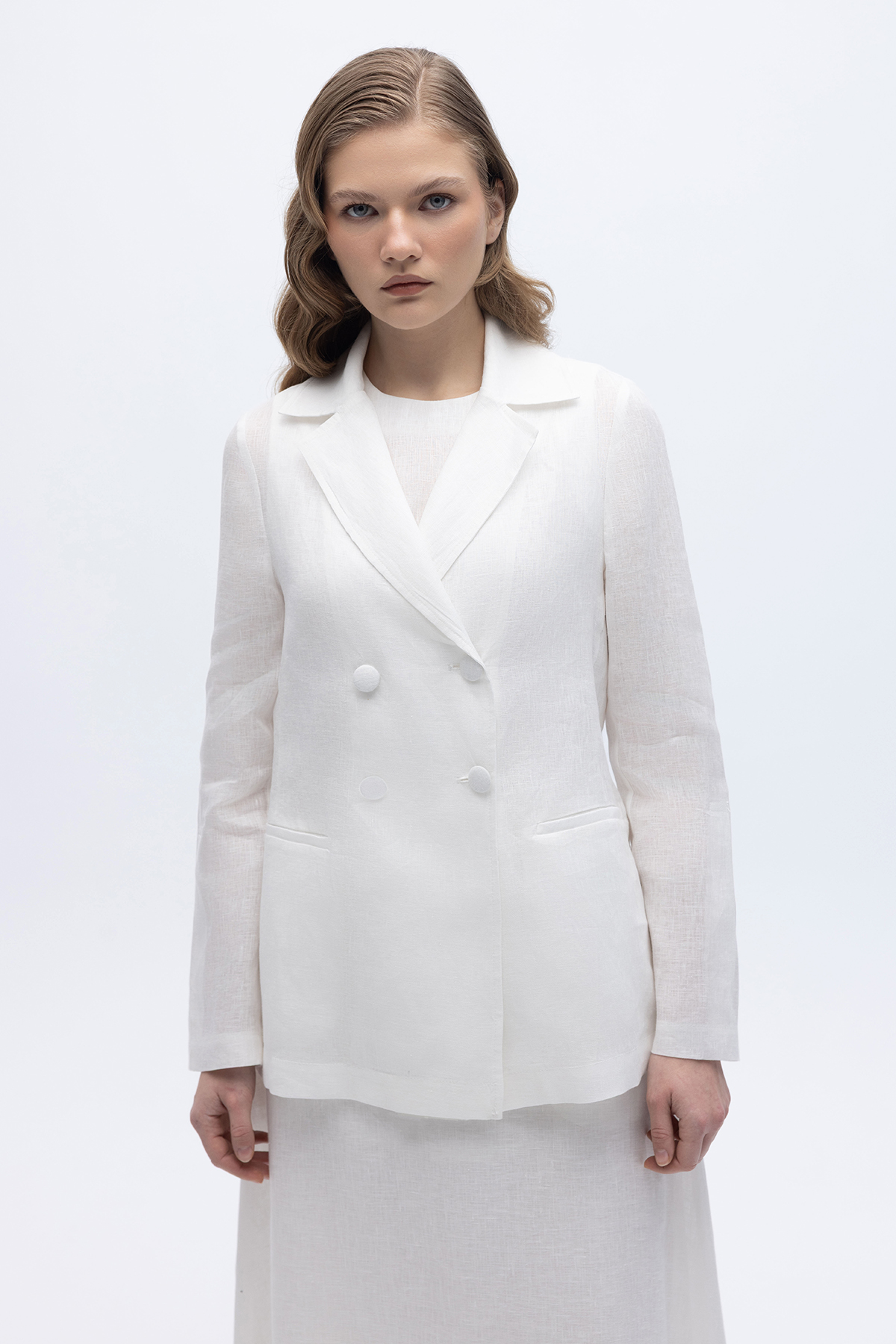 Kruvaze Kesim Keten Ceket Ekru