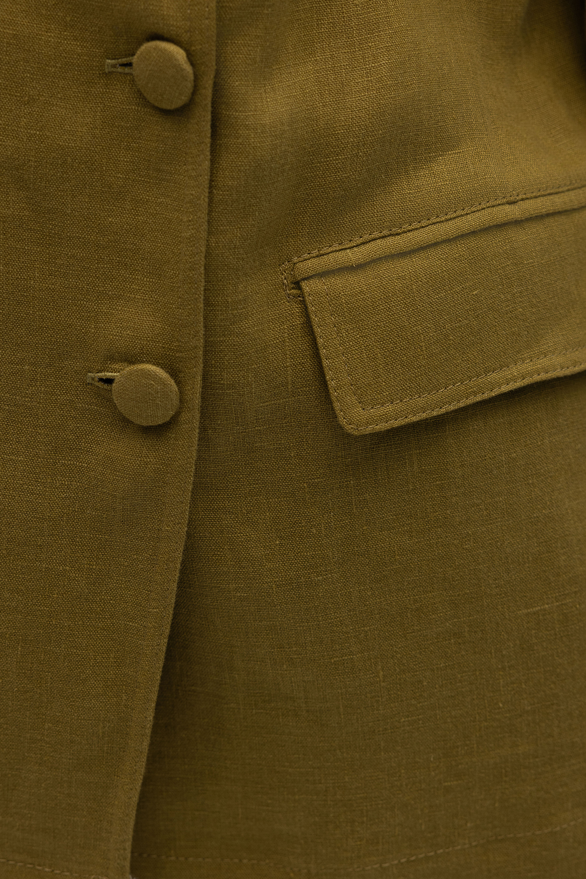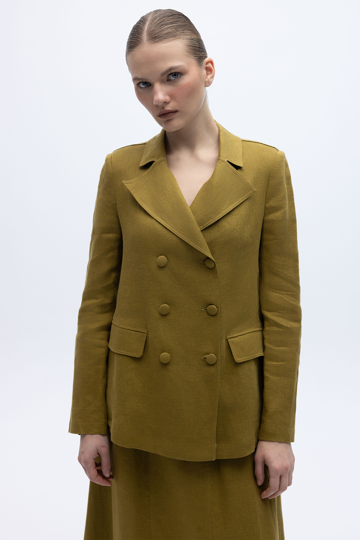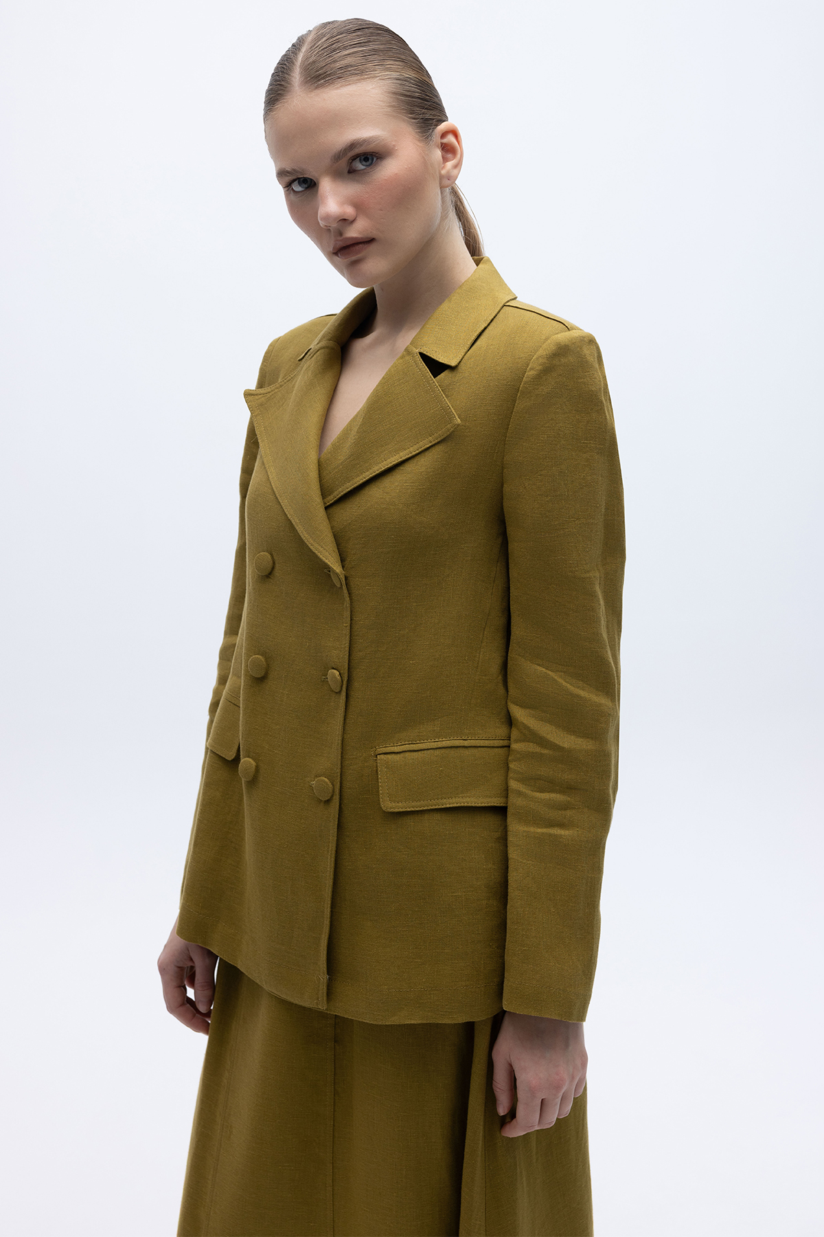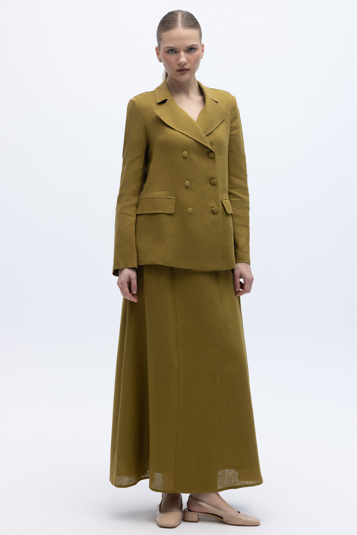 Kruvaze Kesim Keten Uzun Ceket Amber