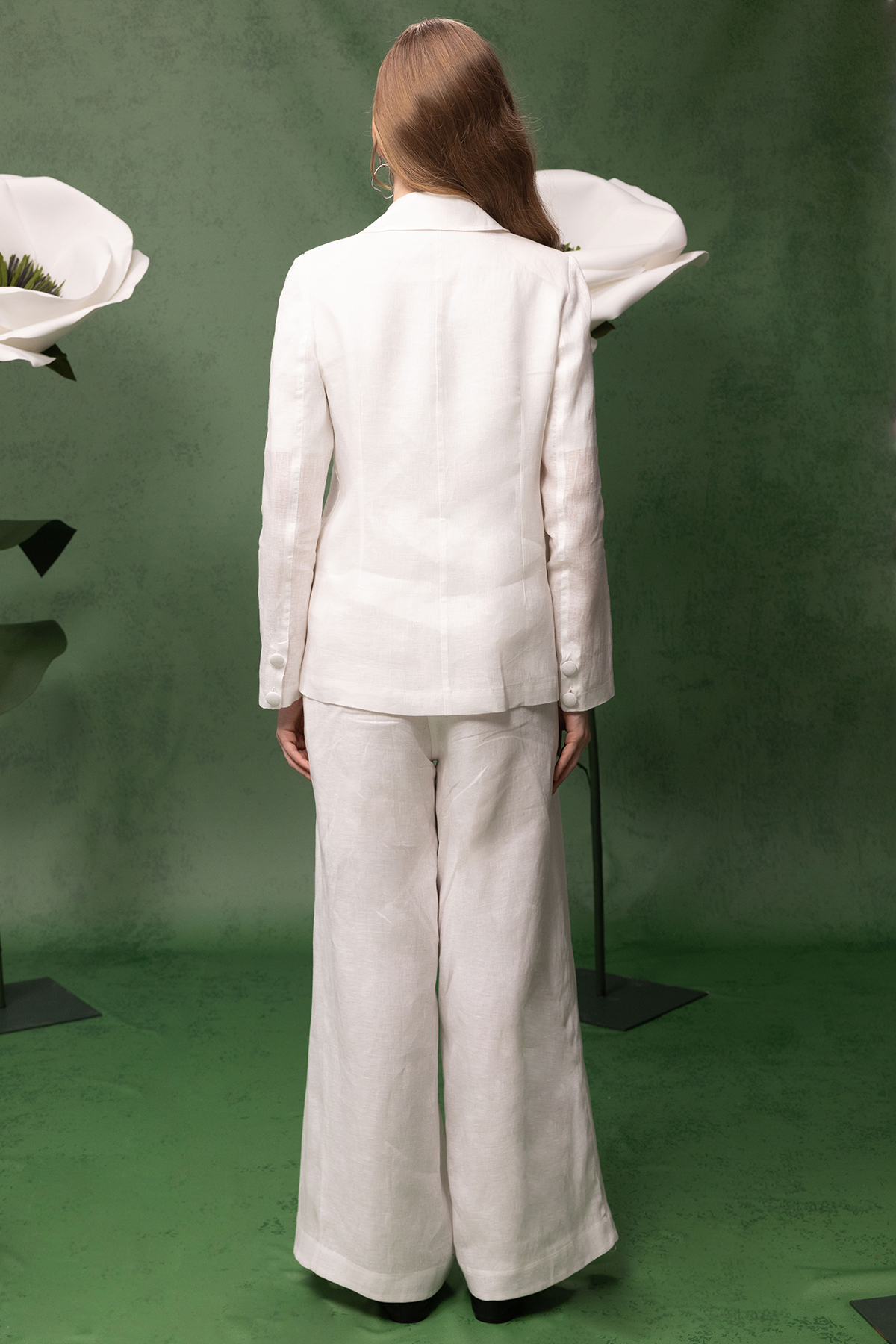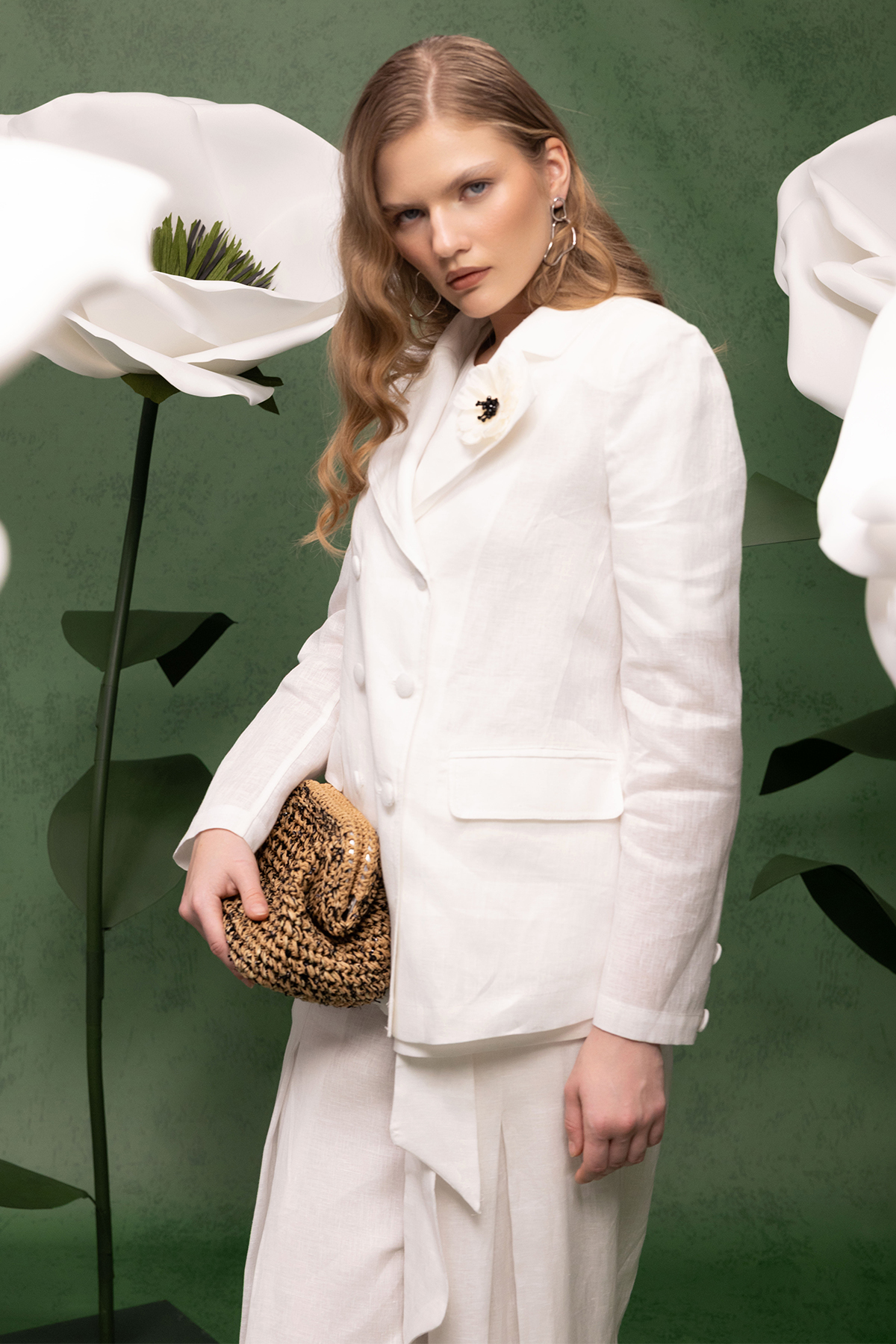 Kruvaze Kesim Keten Uzun Ceket Ekru