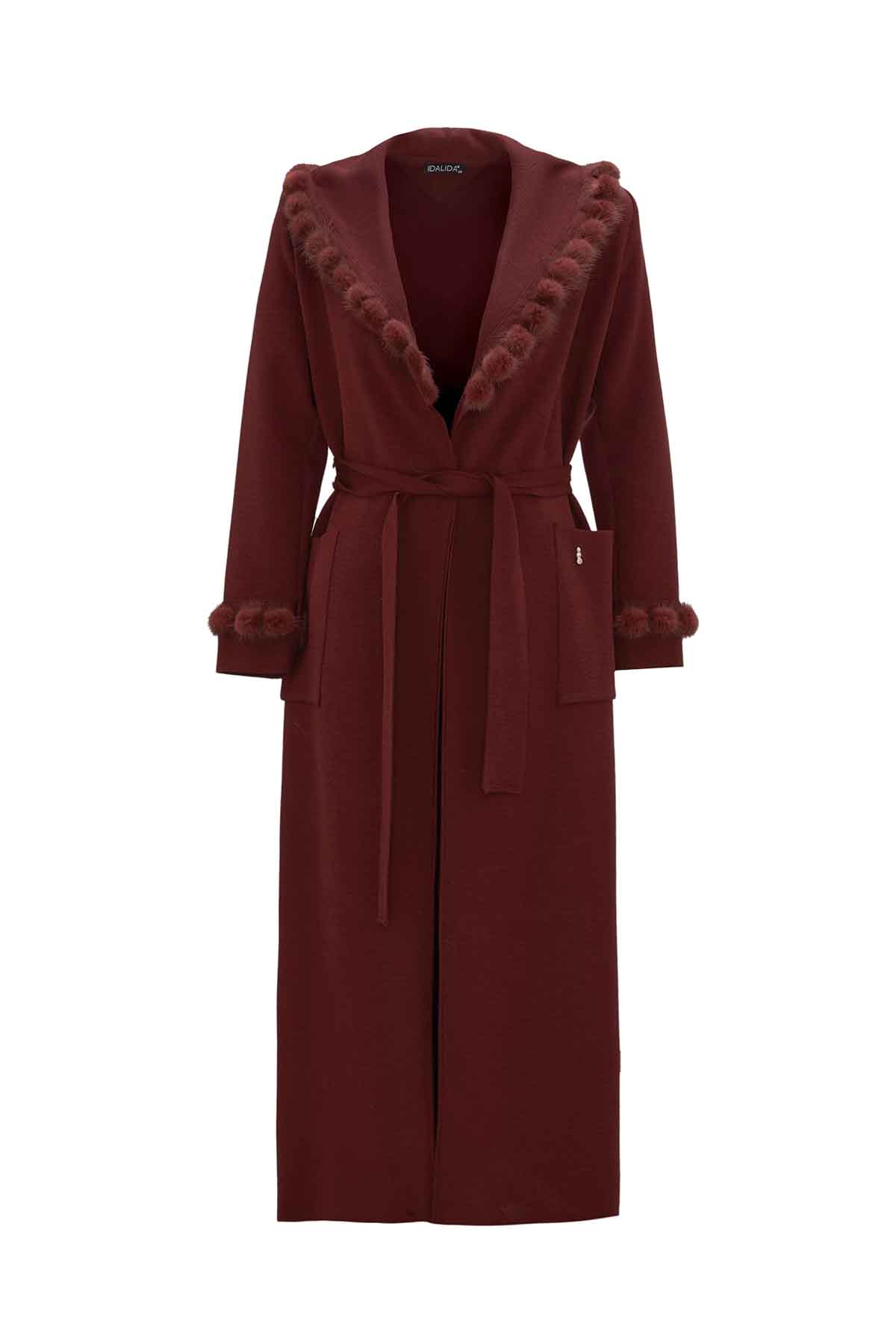 The Long Cardigan with Pom-Pom Fur Detail in Burgundy blends elegance and comfort with its soft knit texture and stylish fur accents. The rich burgundy shade adds a bold yet refined touch, making it suitable for everyday outfits as well as more polished looks. A perfect layering piece for cooler seasons.