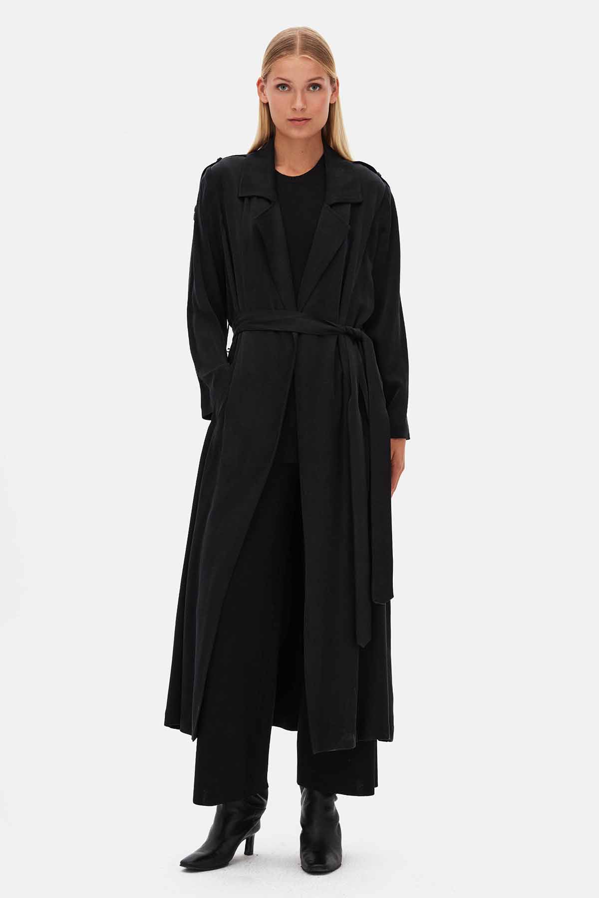 Featuring soft, lightweight fabric, this coat provides comfort and style. Its plain black tone pairs effortlessly with various outfits