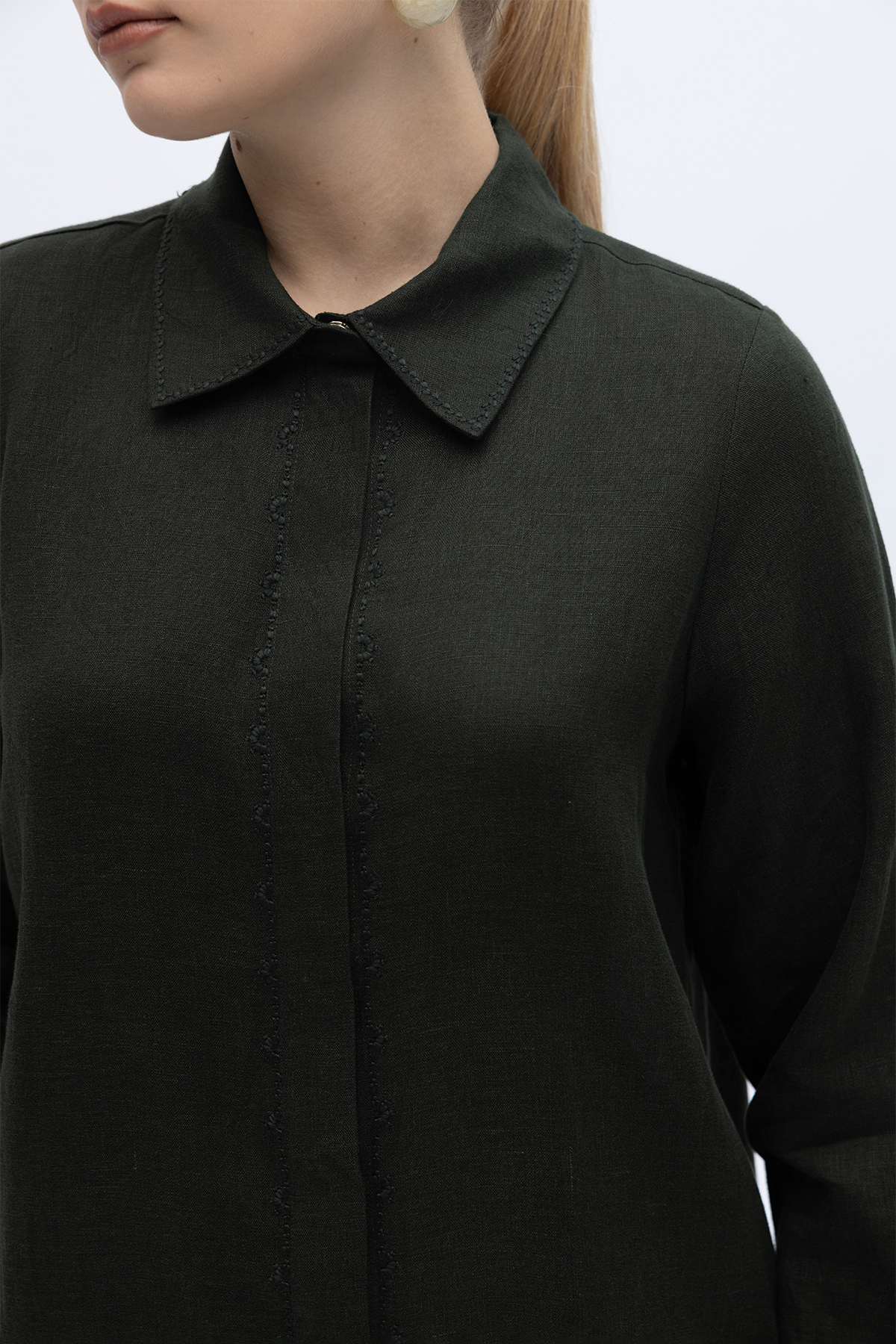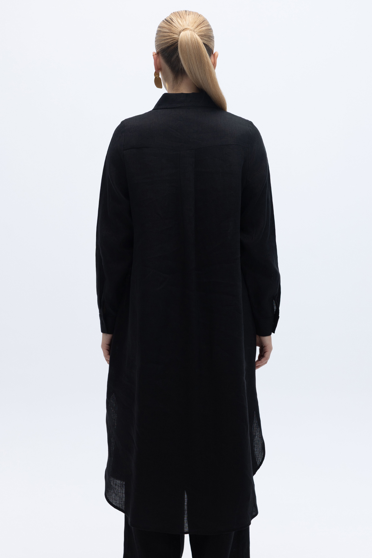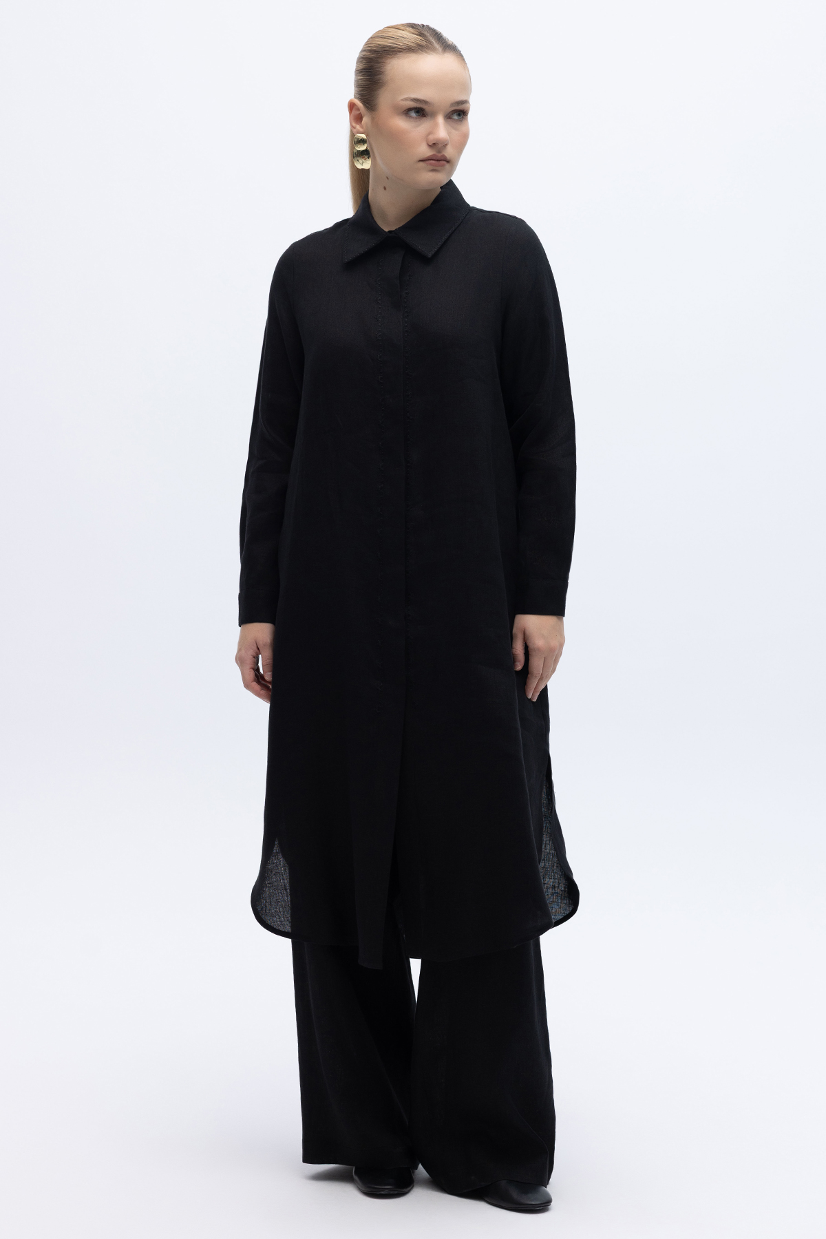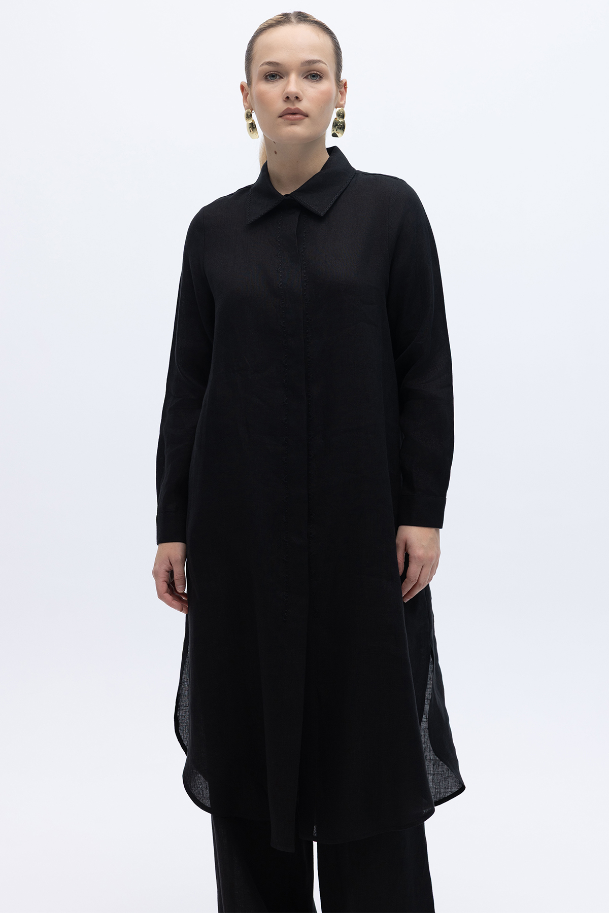 Minimal Nakışlı Uzun Keten Gömlek Siyah