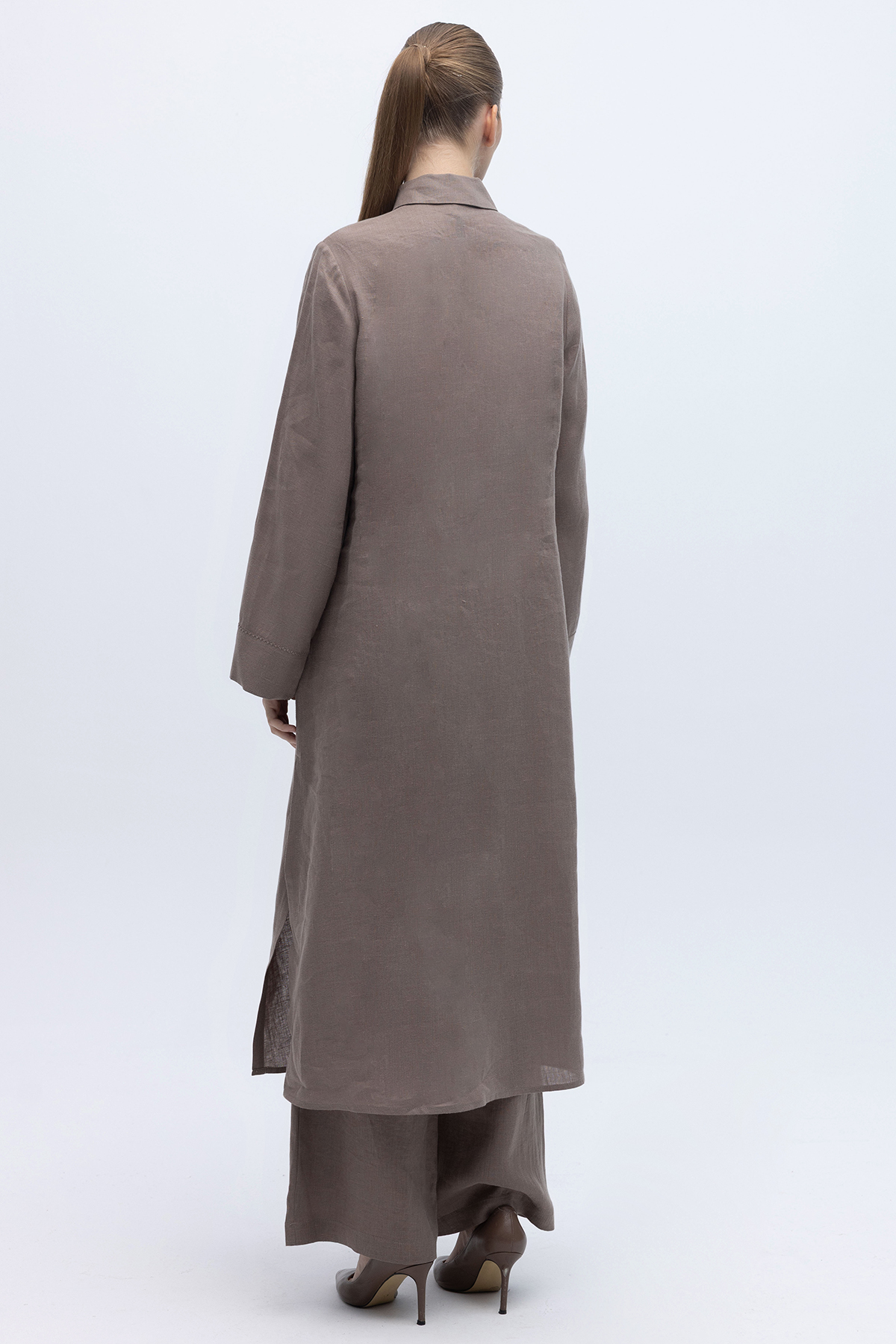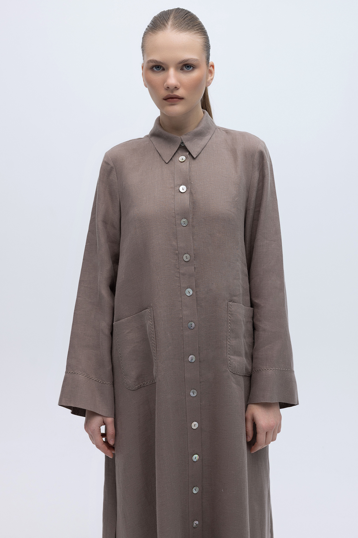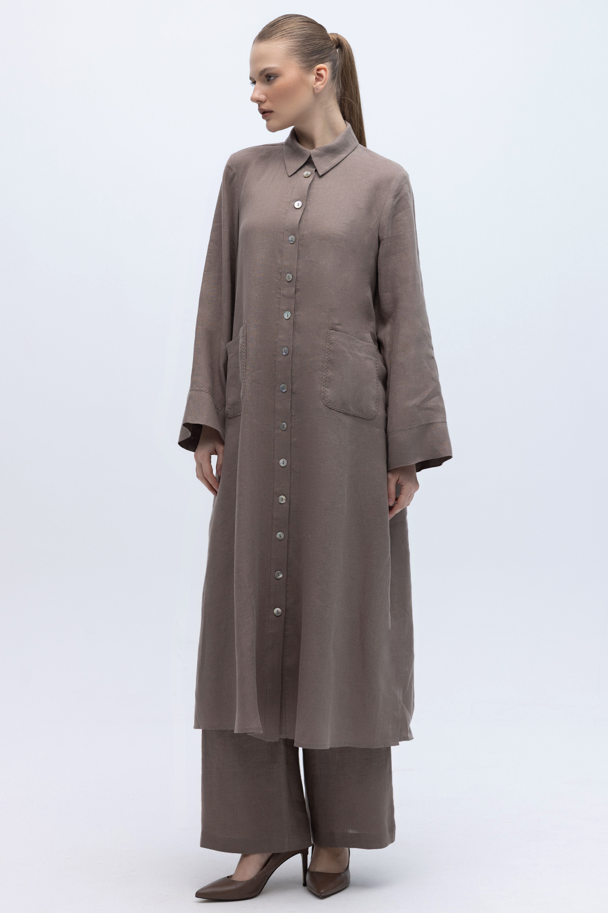 Nakış Detaylı Düğmeli Uzun Kap Mink