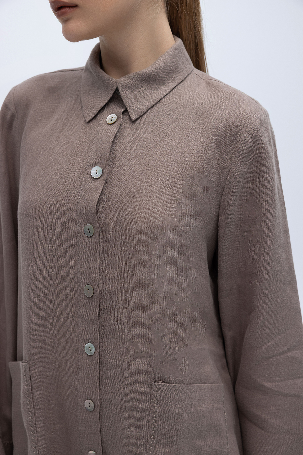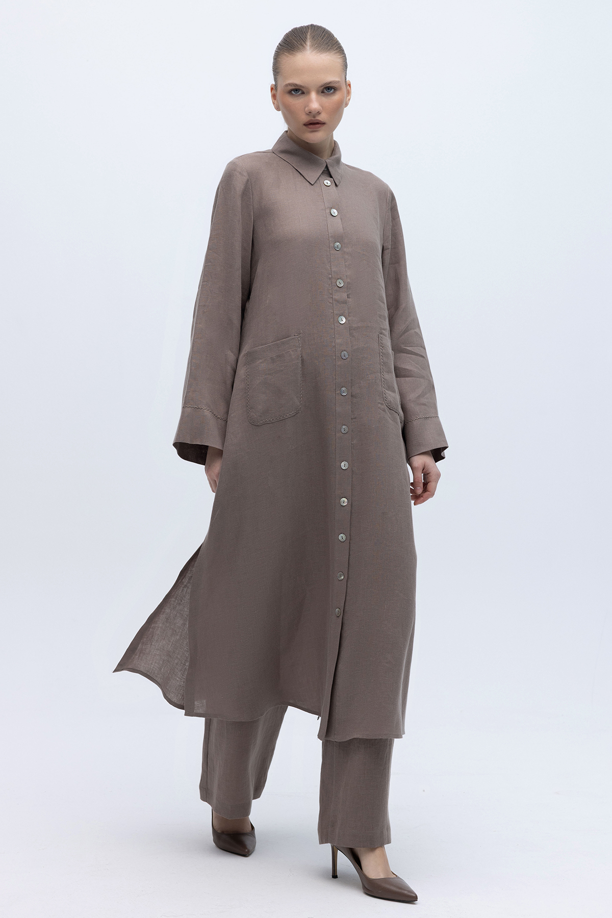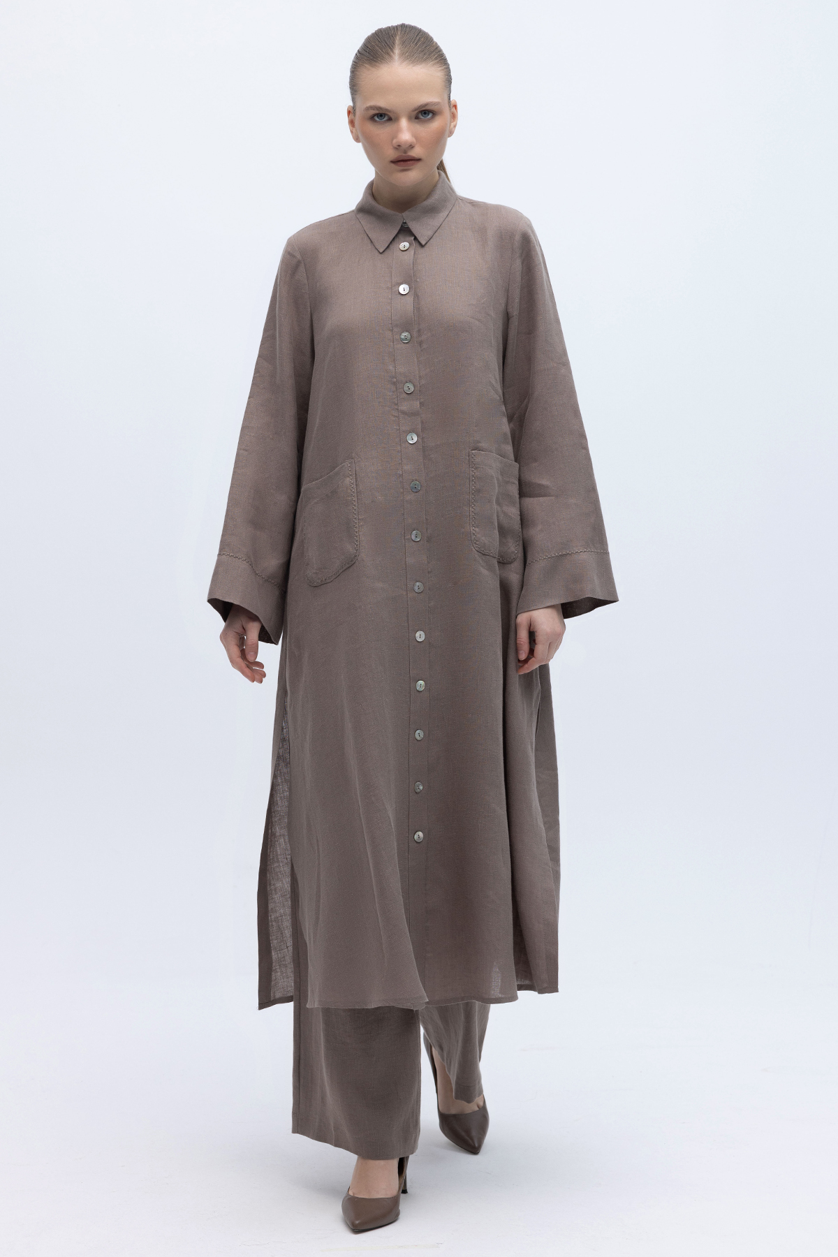 Nakış Detaylı Düğmeli Uzun Kap Mink