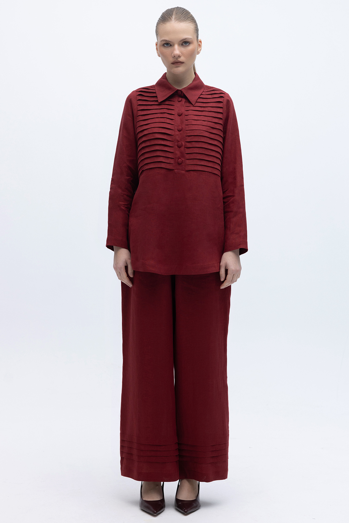 Nervürlü Bol Paça Keten Pantolon Cherry