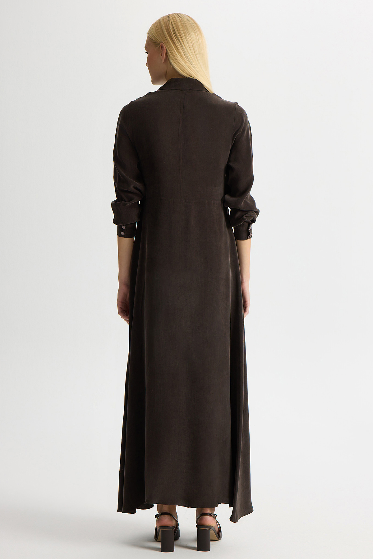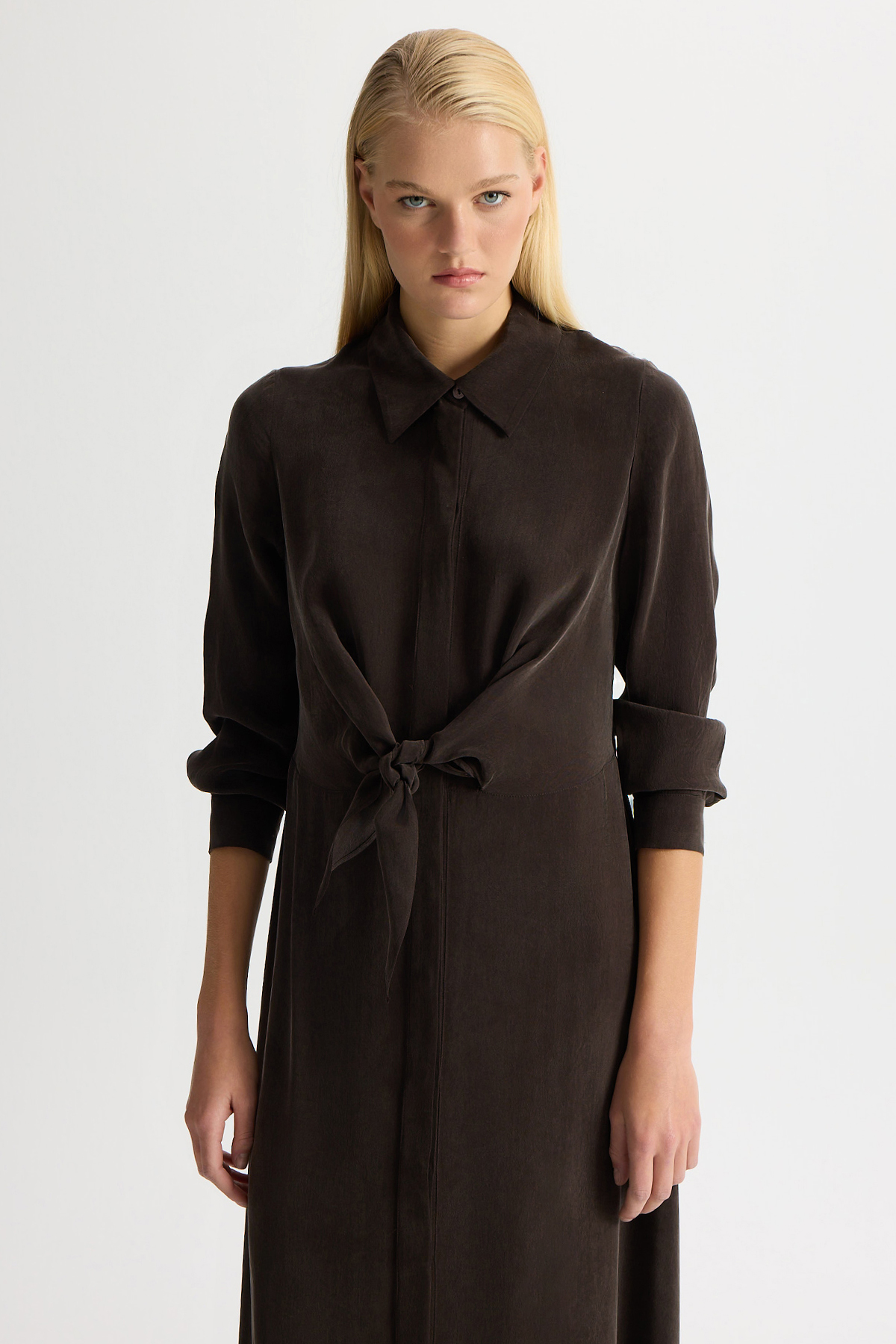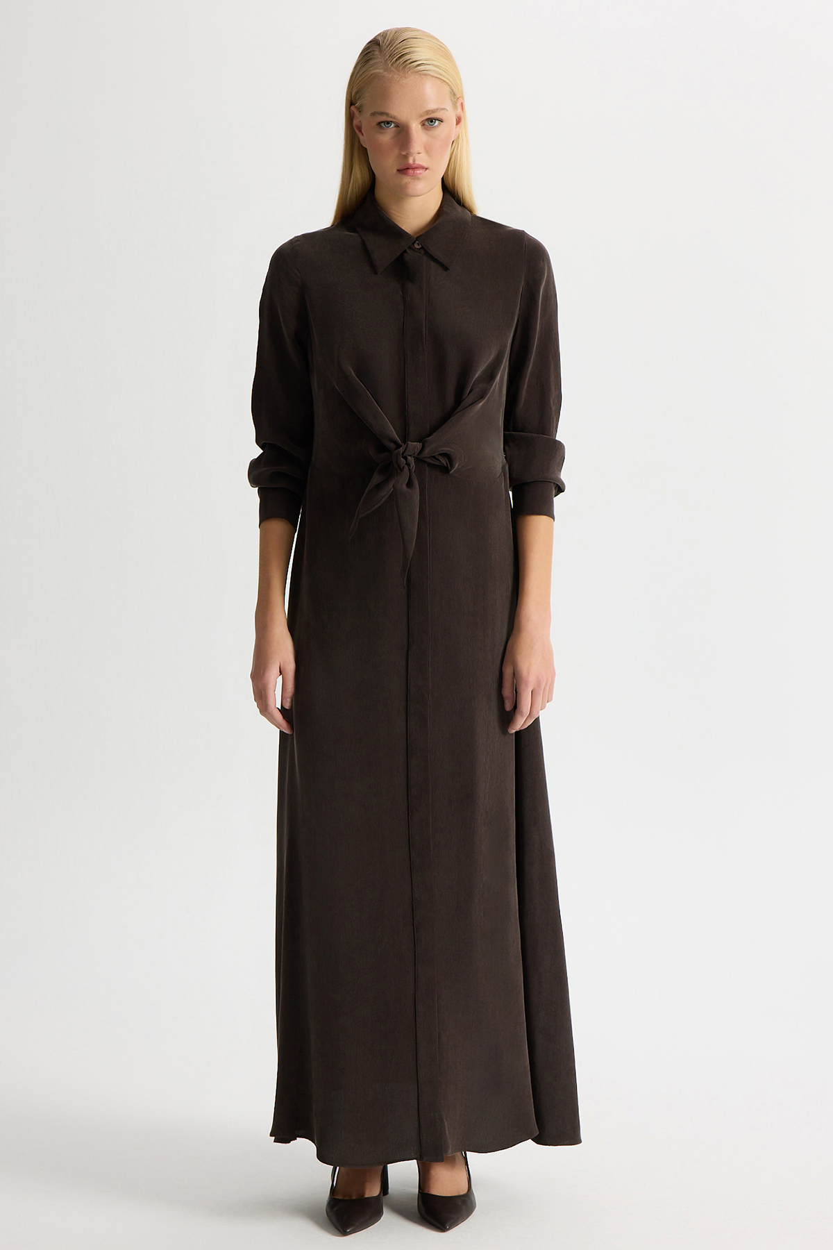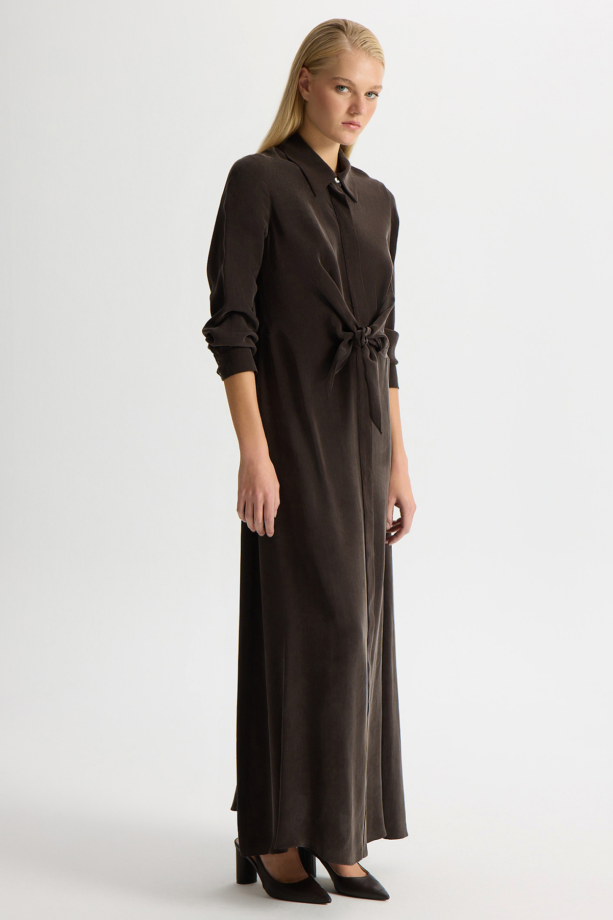 Ön Kısmı Bağlama Detaylı Cupro Elbise Kahverengi