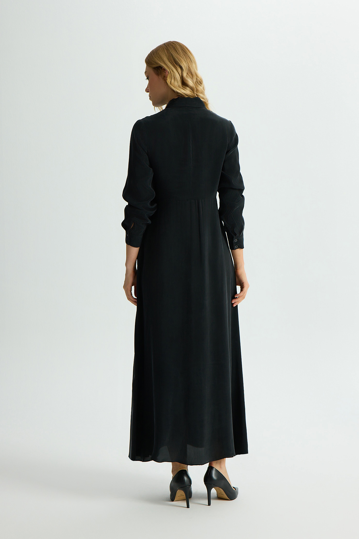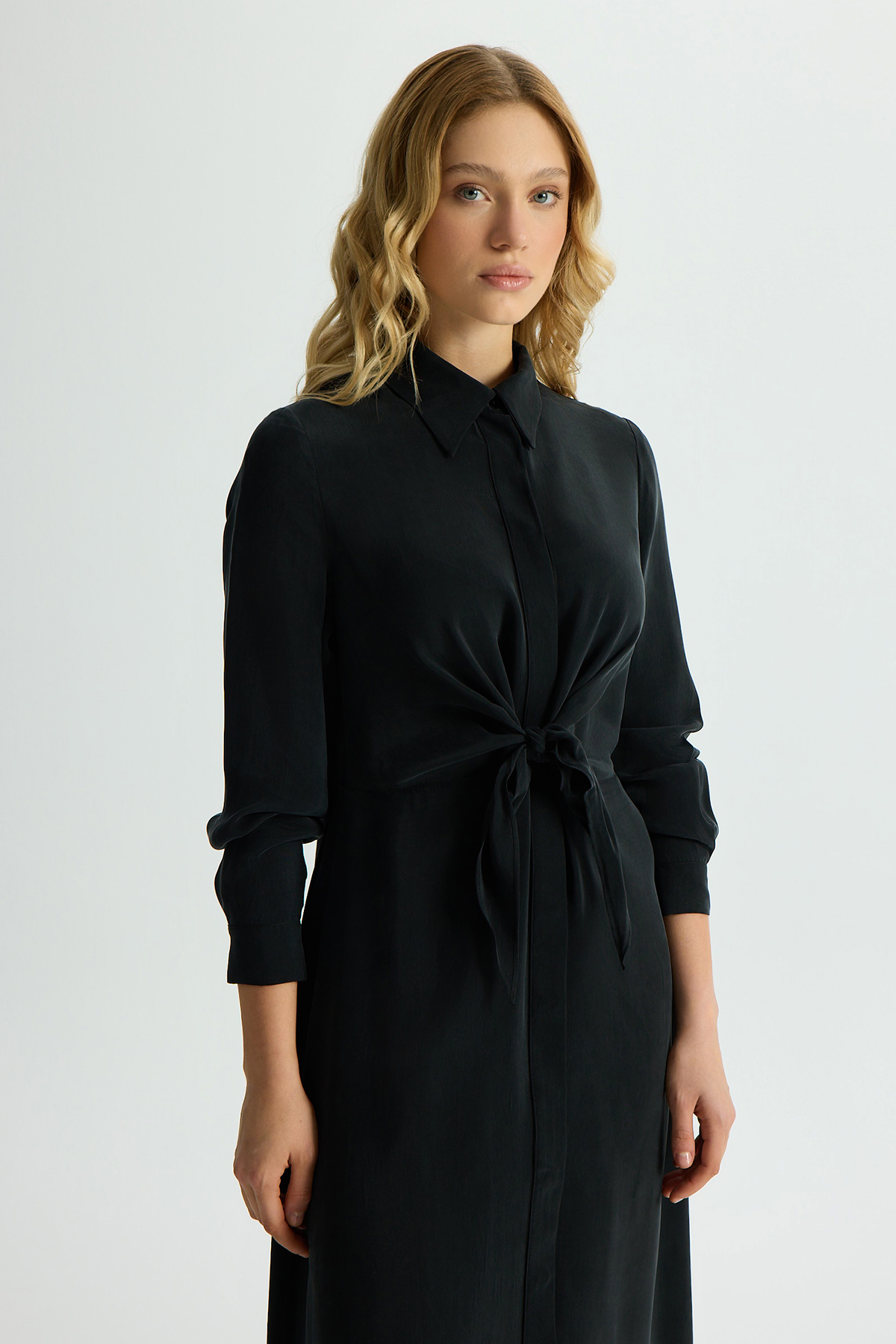 Ön Kısmı Bağlama Detaylı Cupro Elbise Siyah