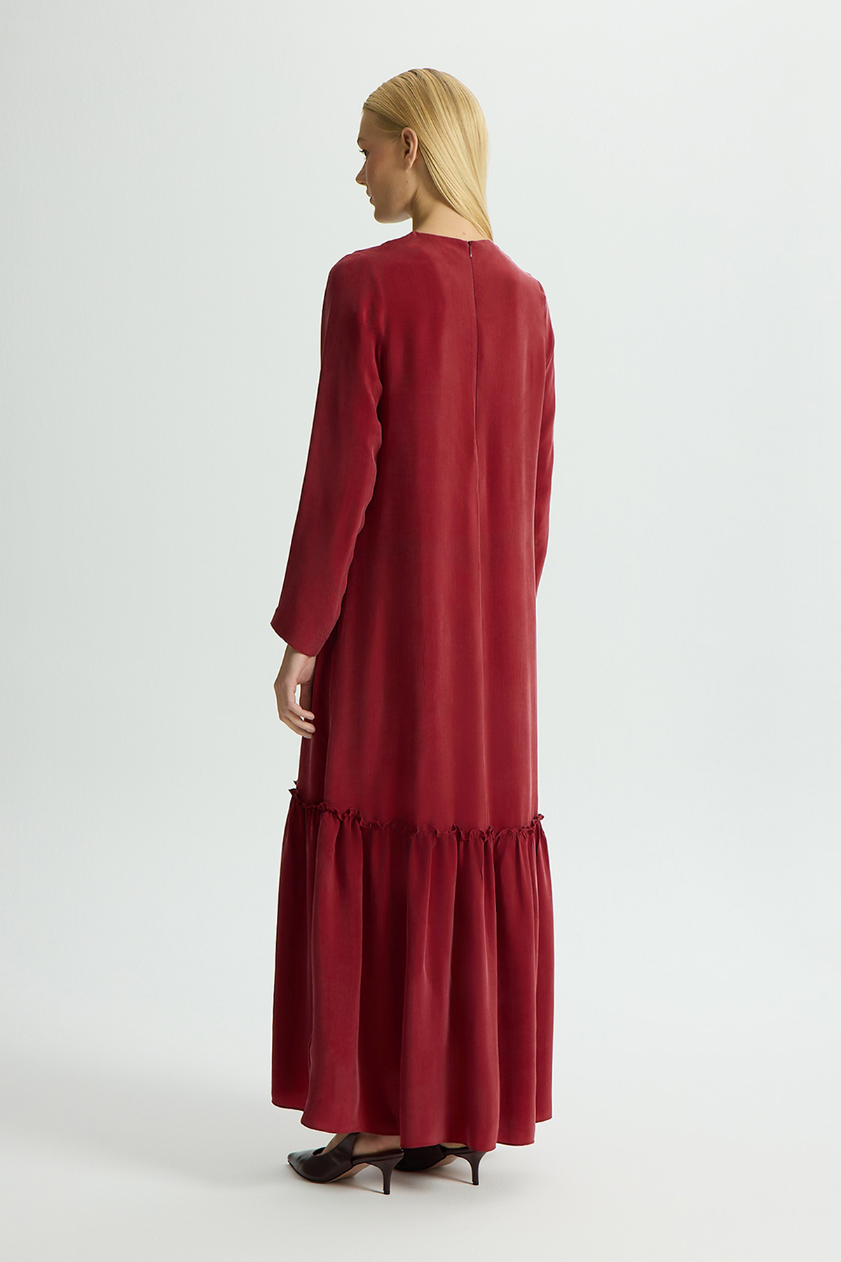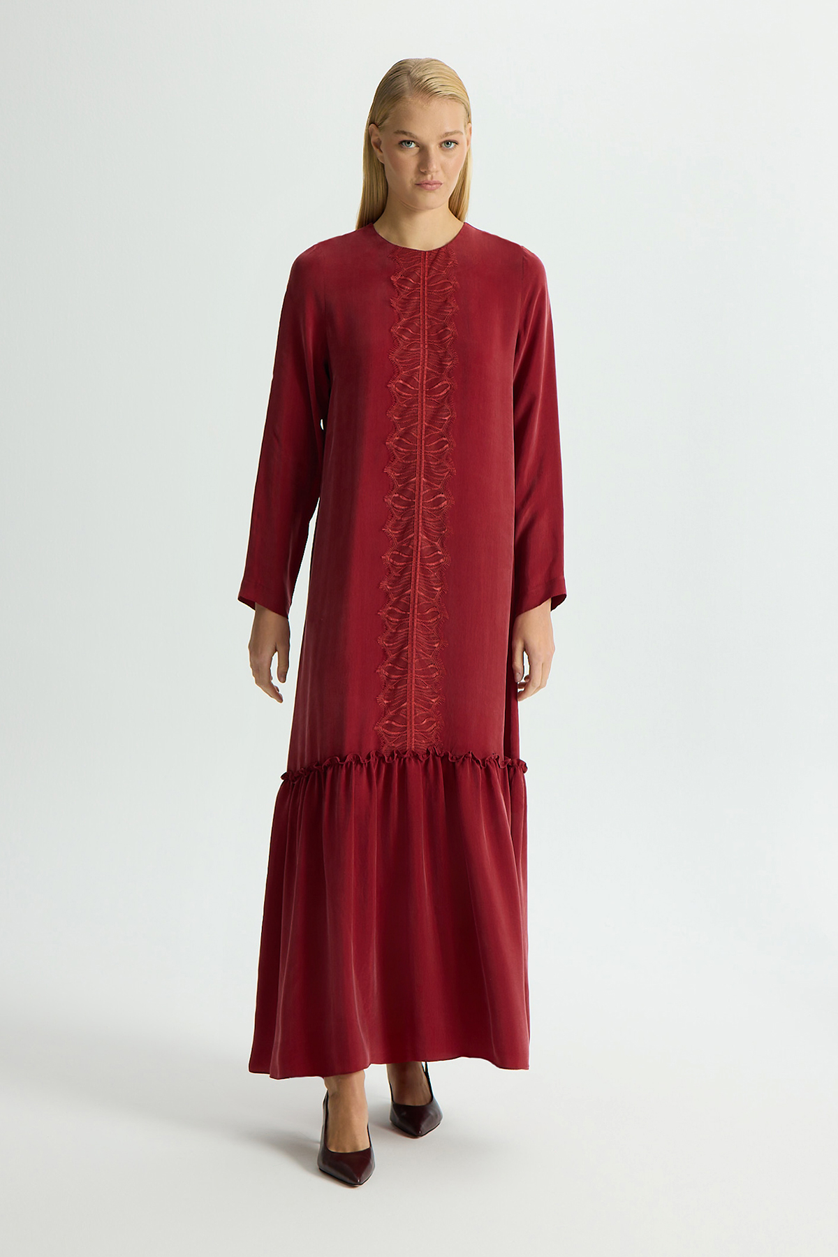 Önü Dantelli Cupro Elbise Cherry