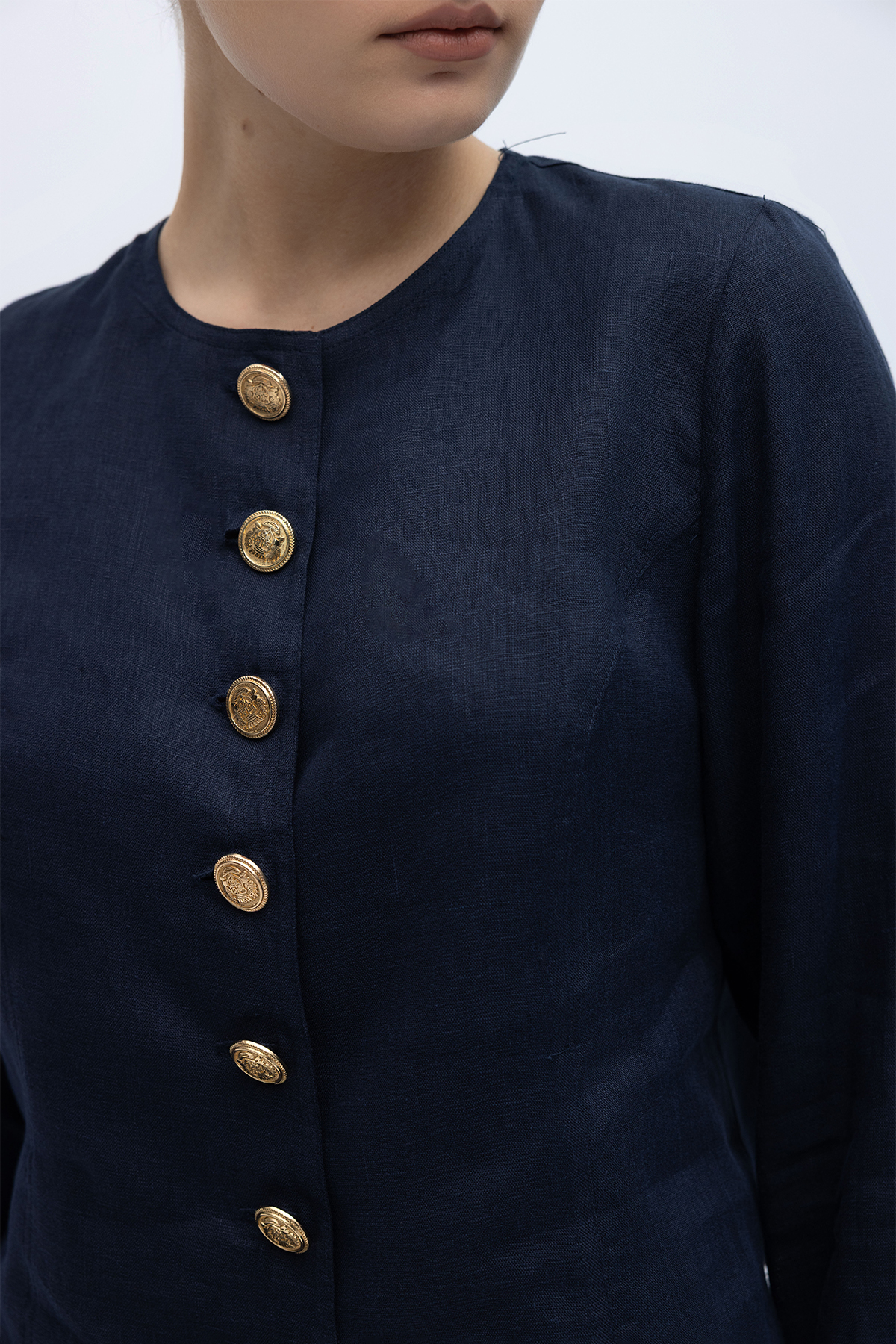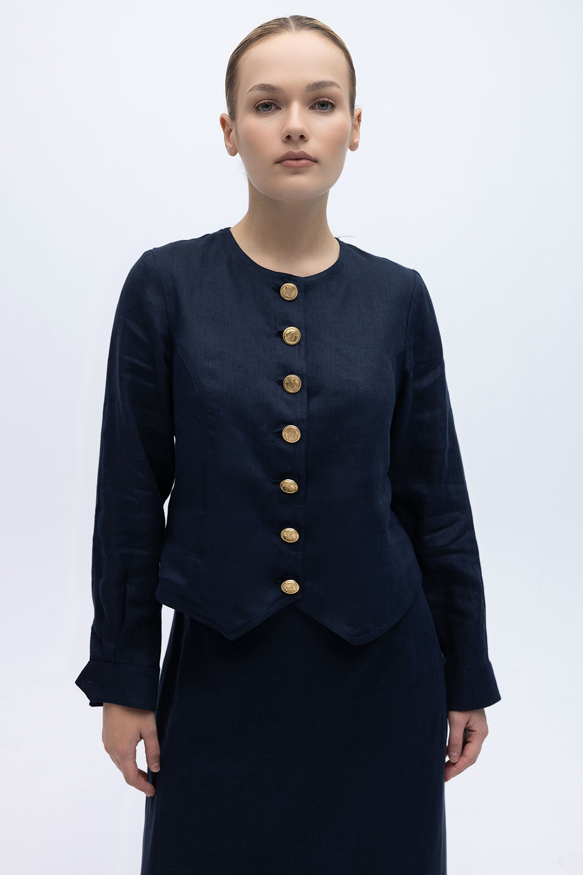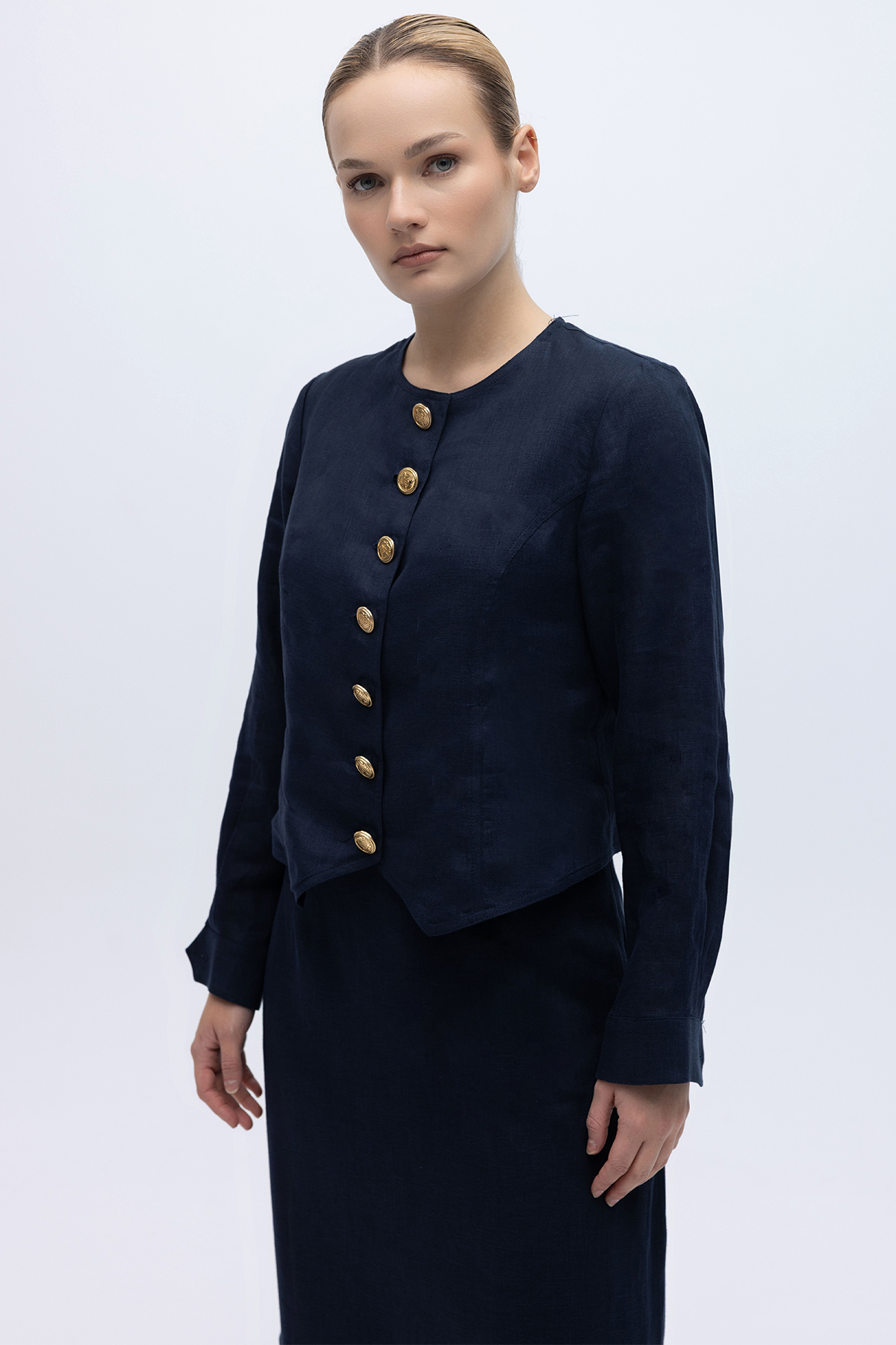 Önü Düğmeli Kısa Keten Ceket Siyah