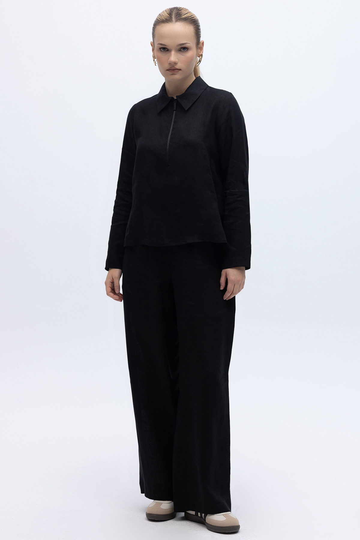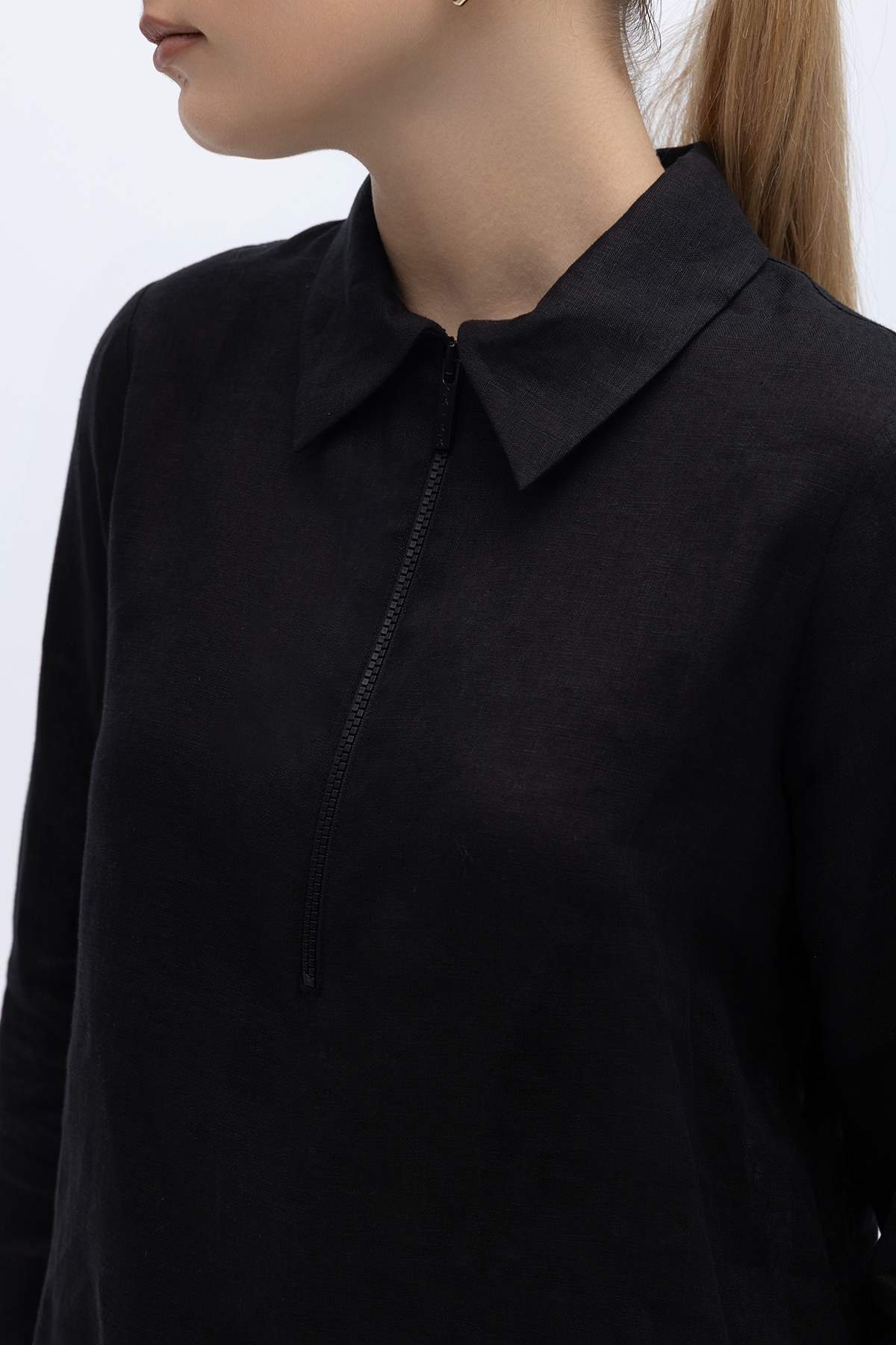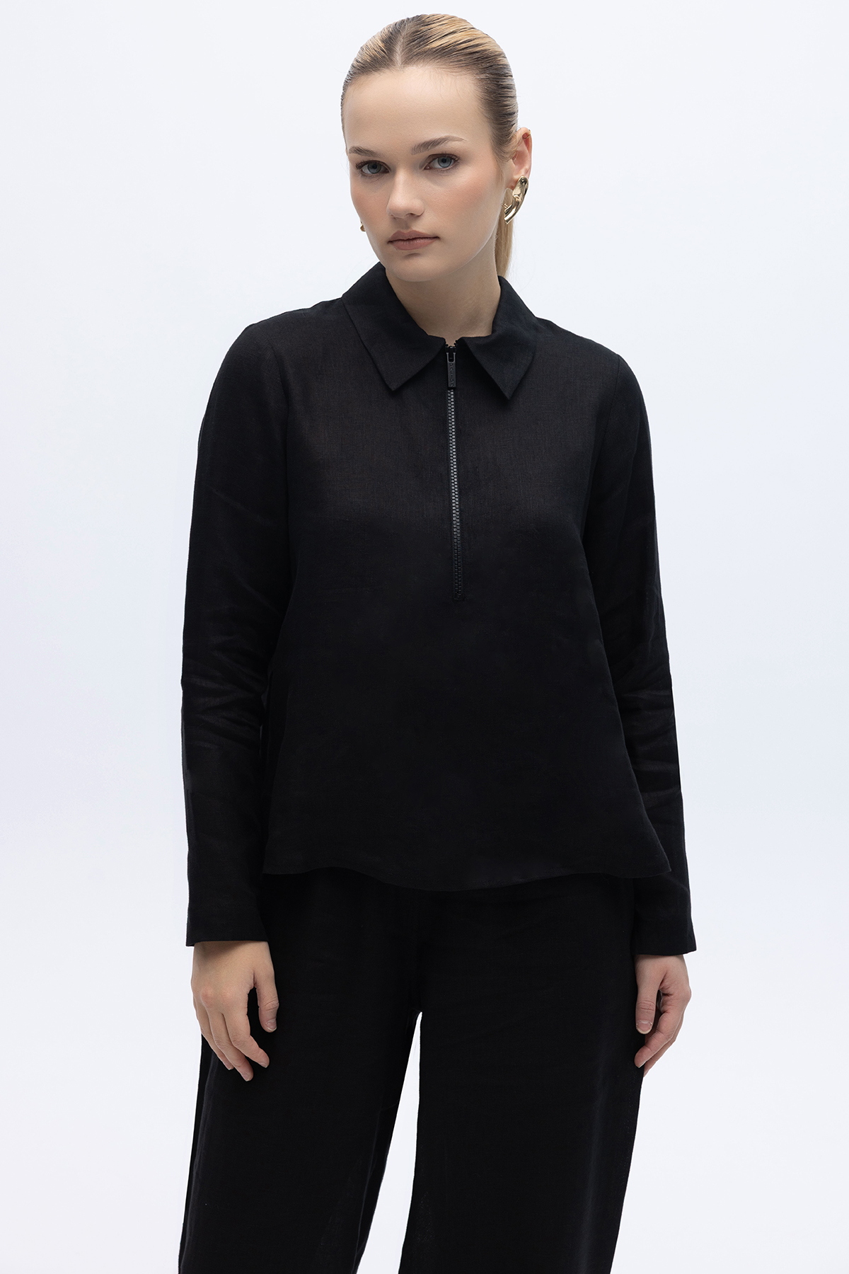 Önü Fermuarlı Keten Gömlek Siyah