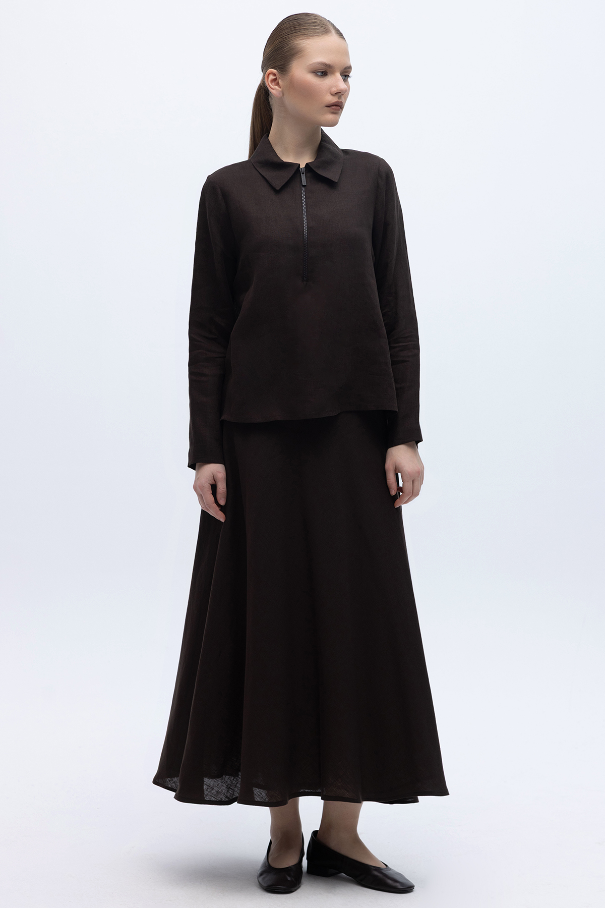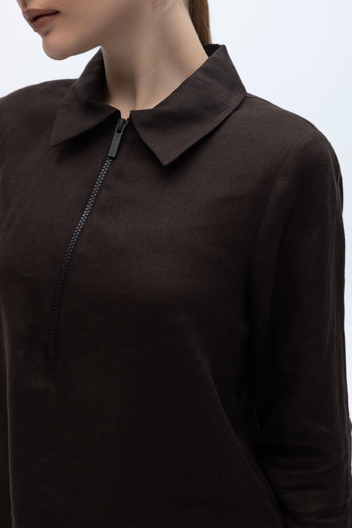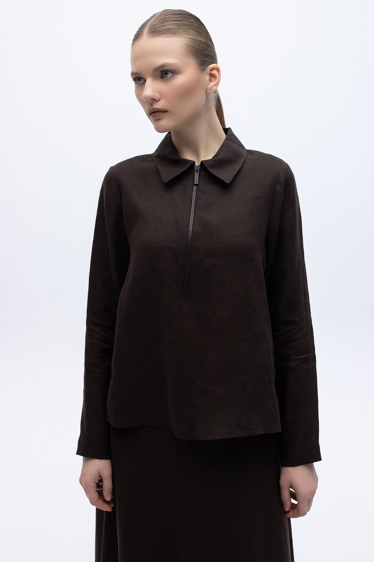 Önü Fermuarlı Keten Gömlek Kahverengi