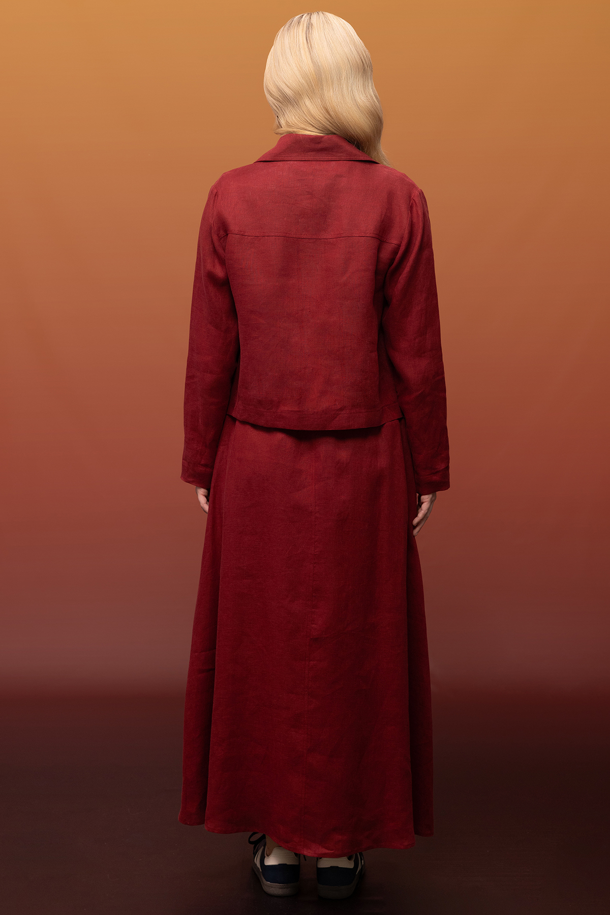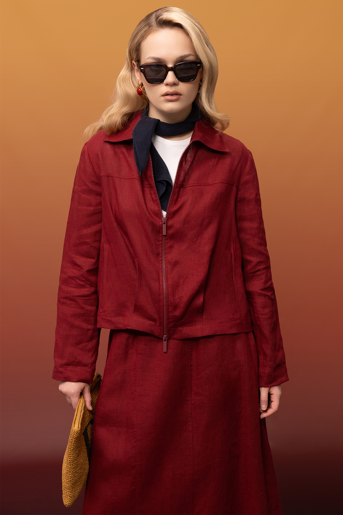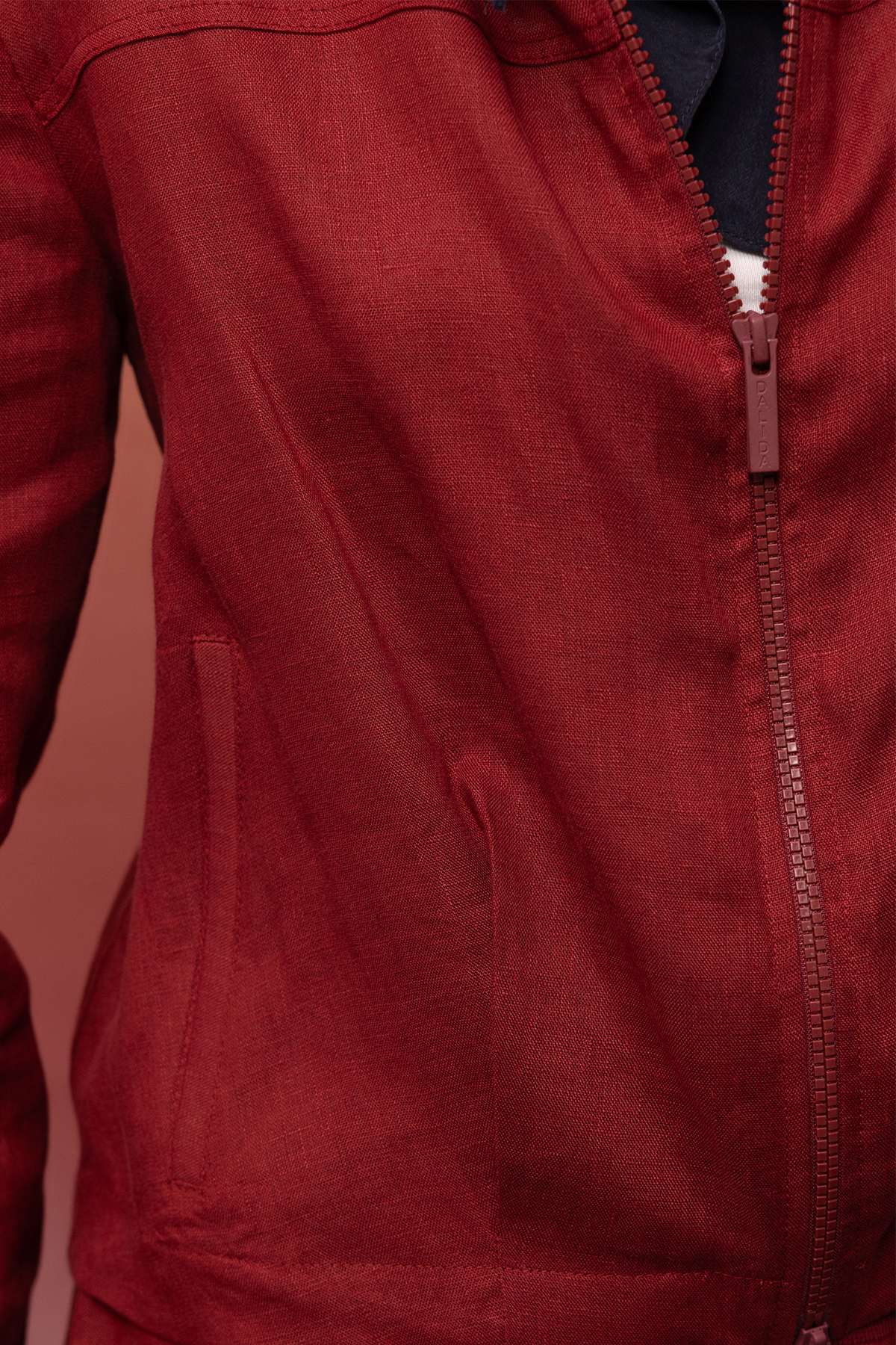 Önü Fermuarlı Kısa Keten Ceket Cherry