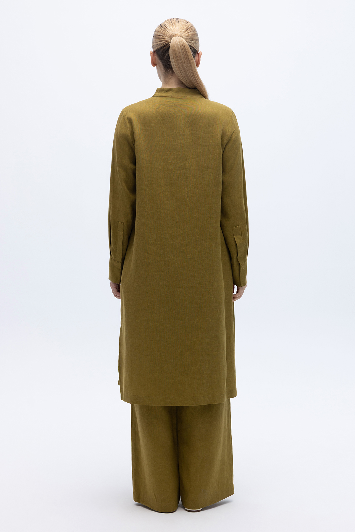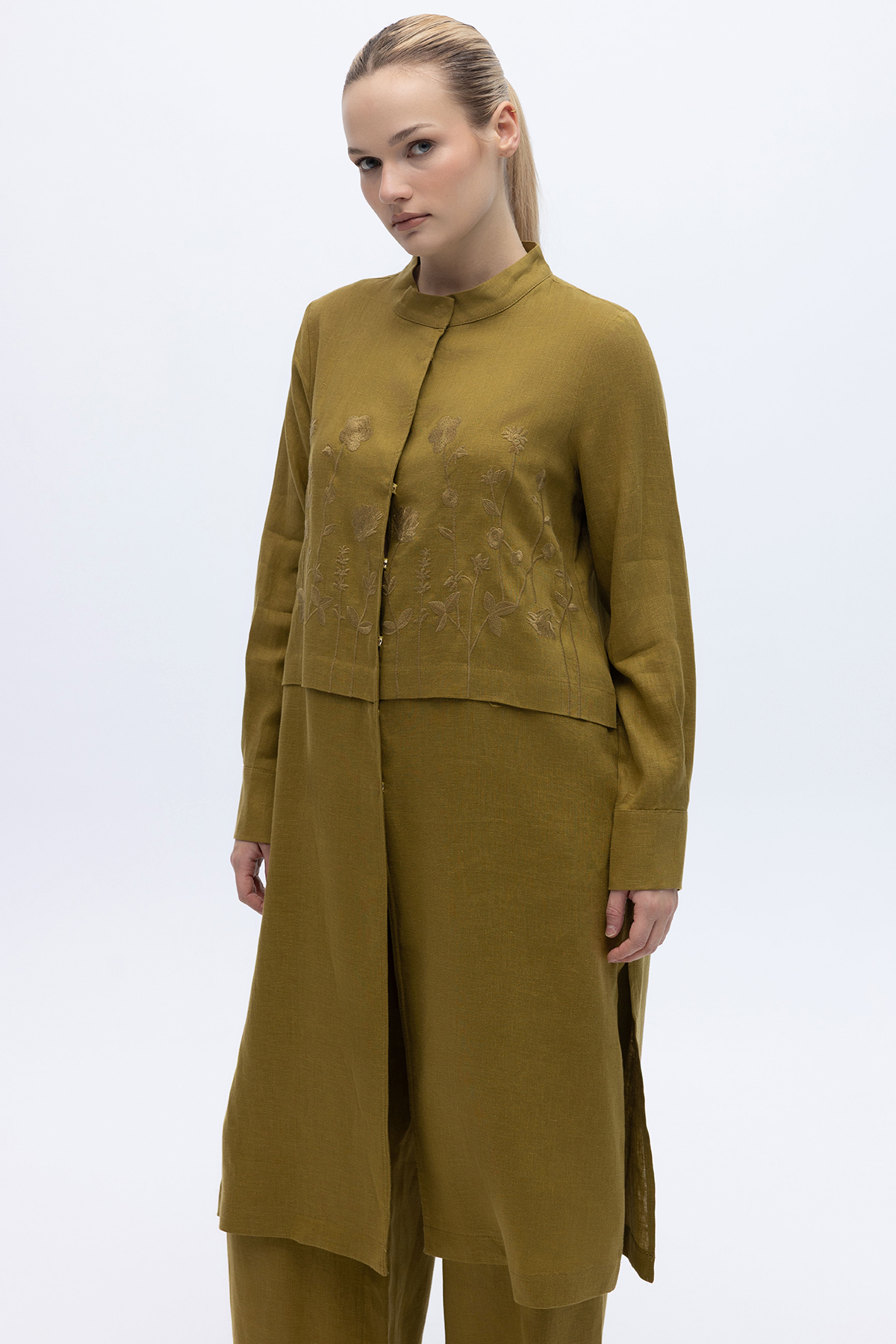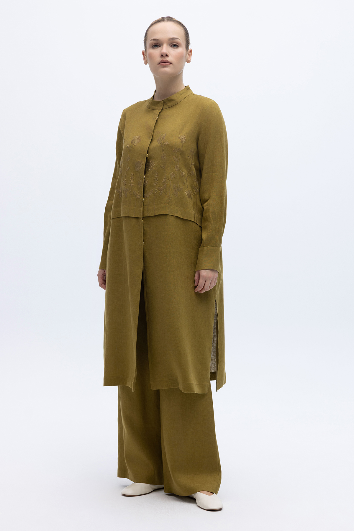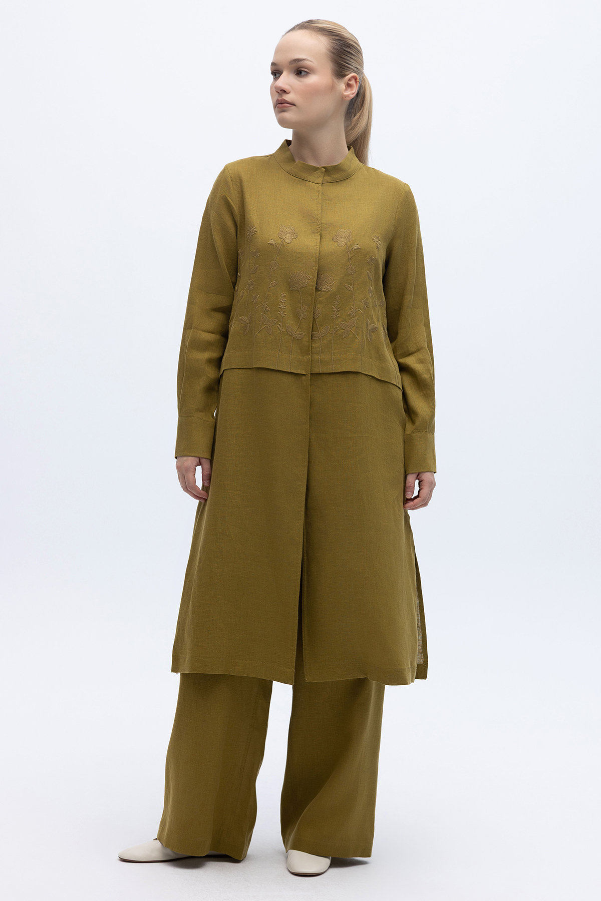 Minimal Nakışlı Uzun Keten Gömlek Stone