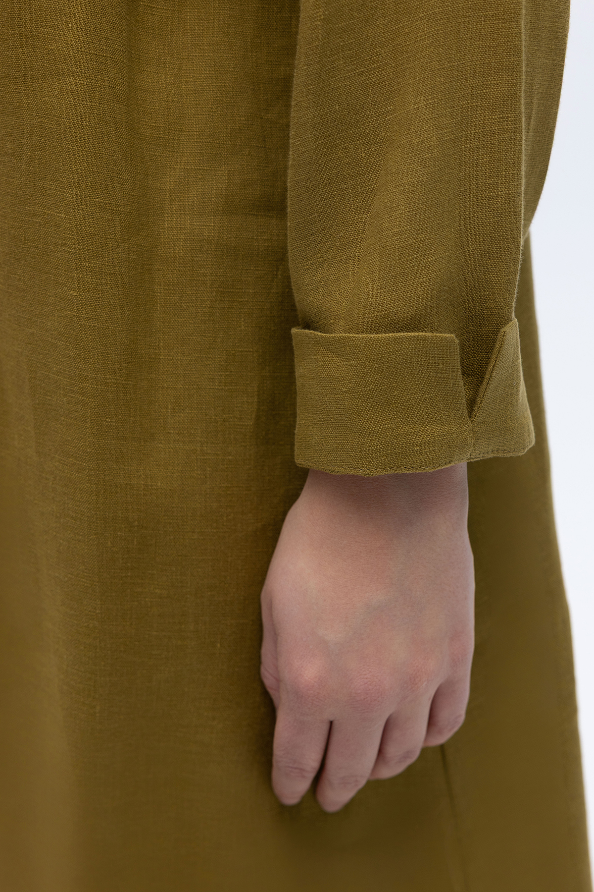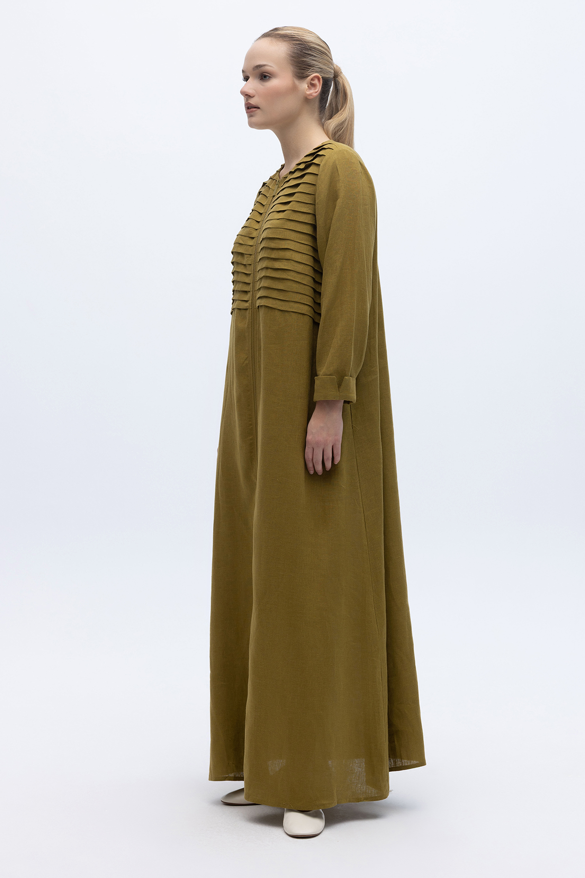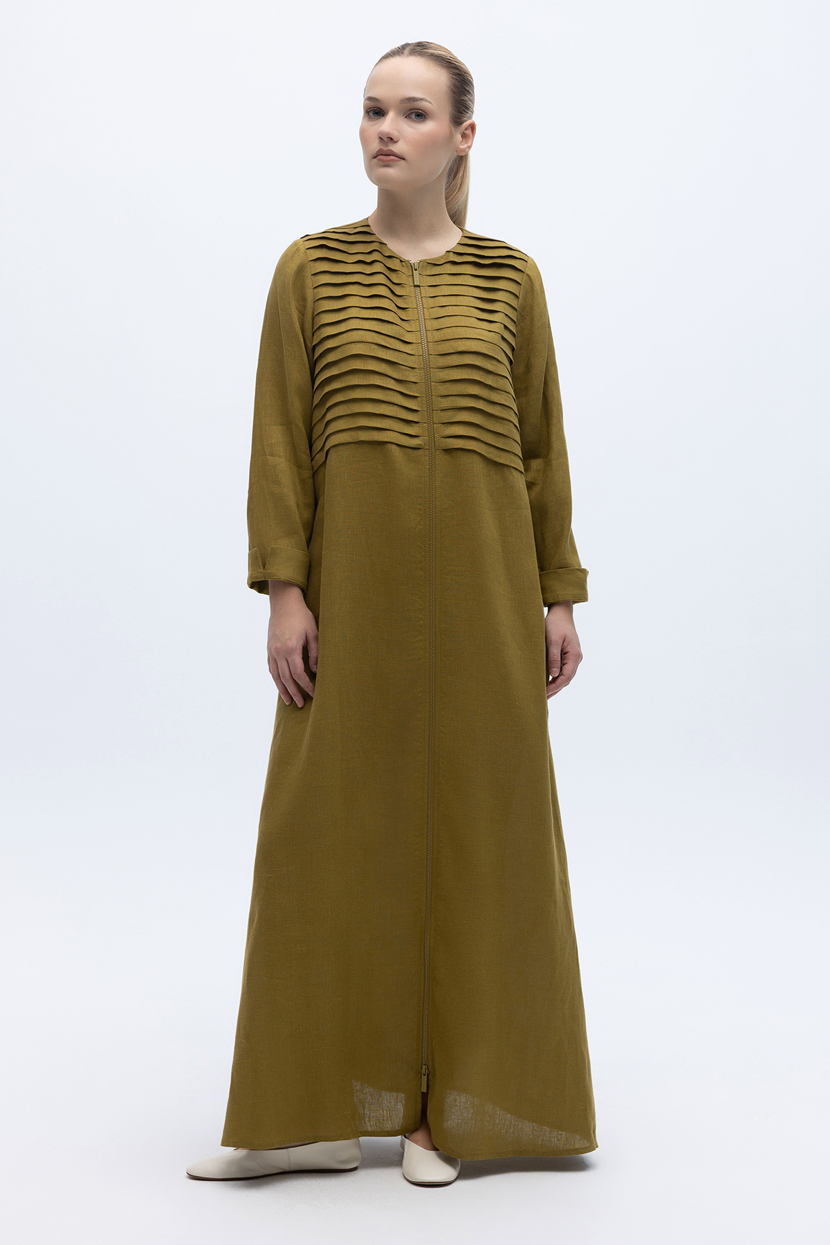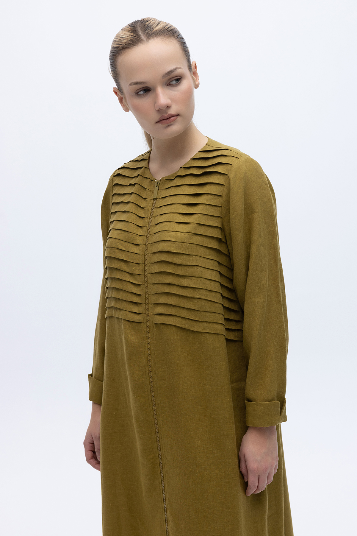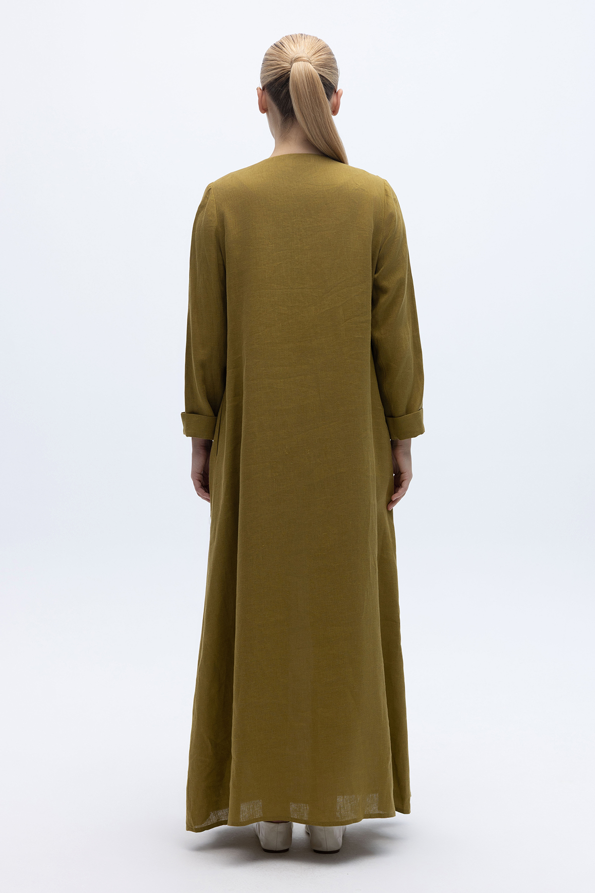 Triko Tiktaklı Uzun Keten Ceket Haki
