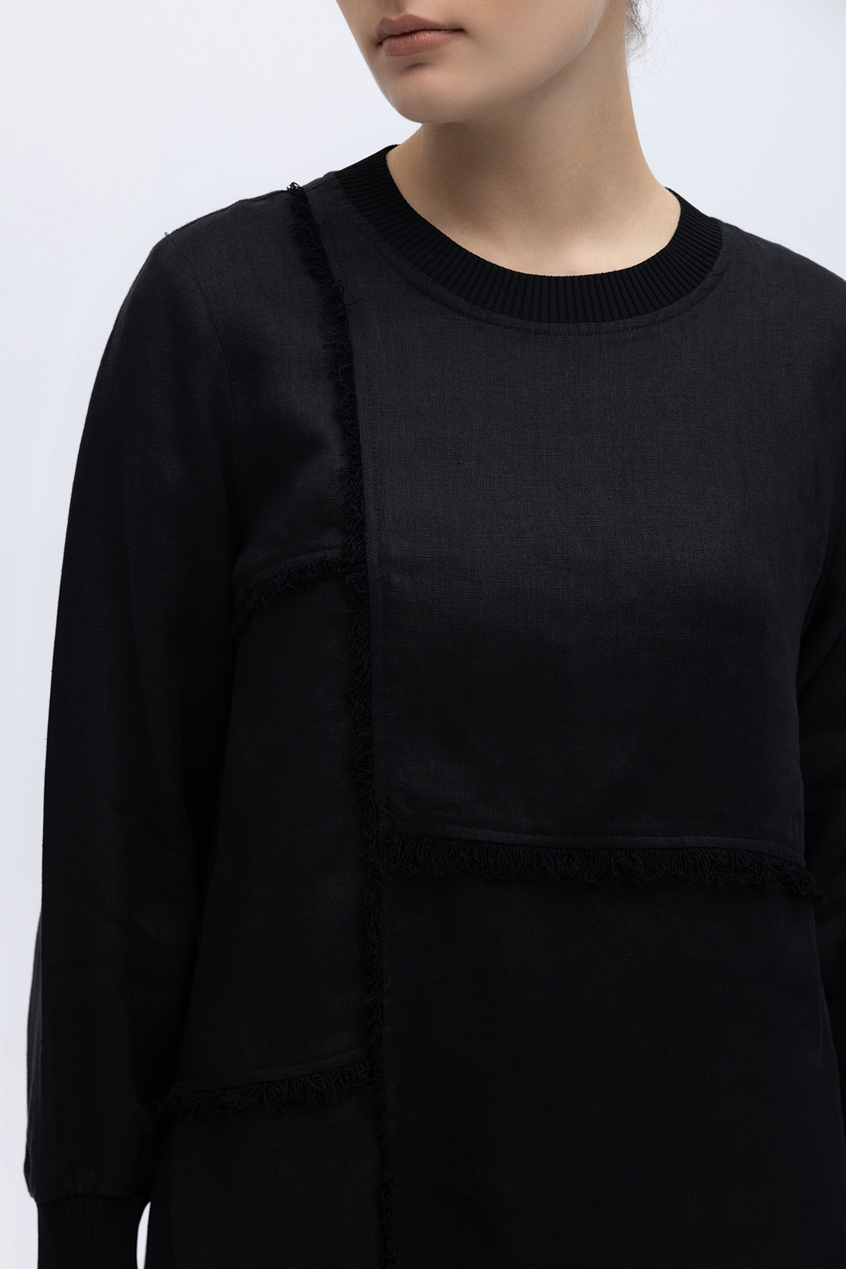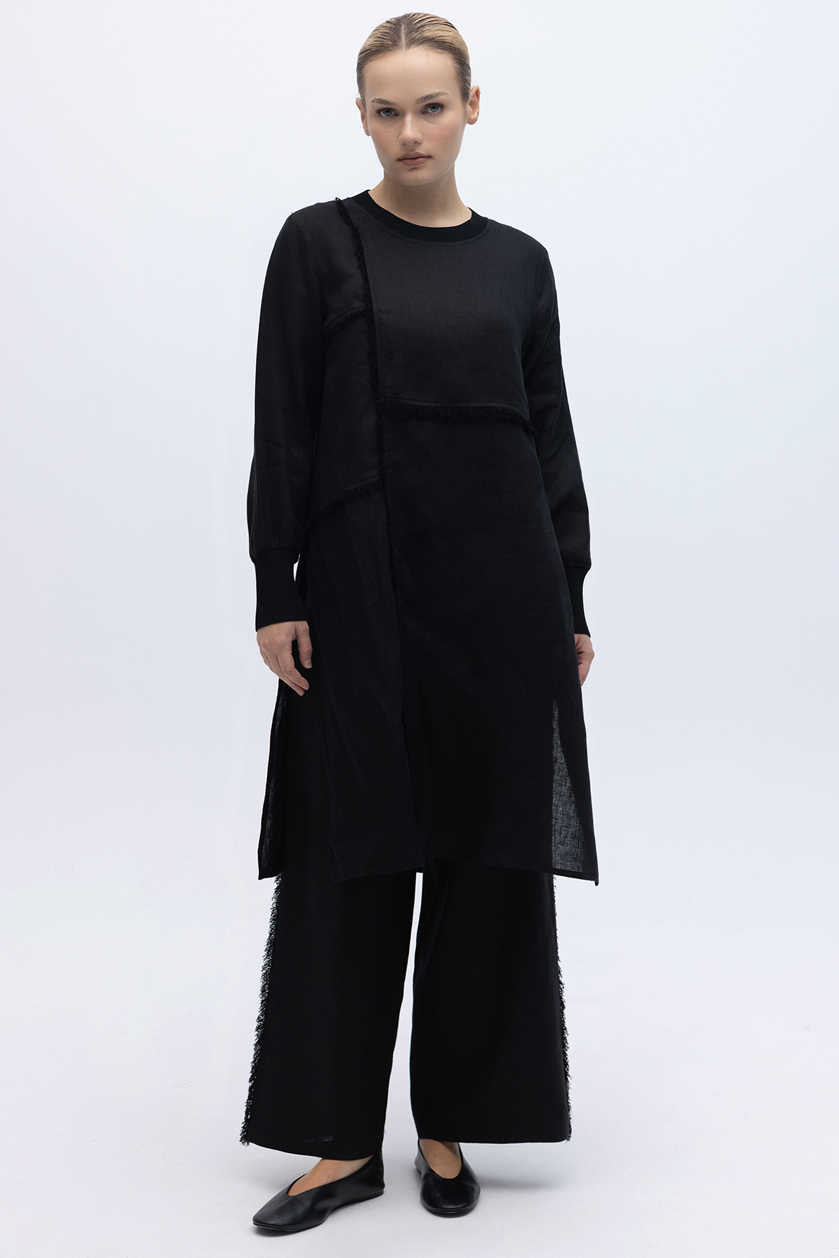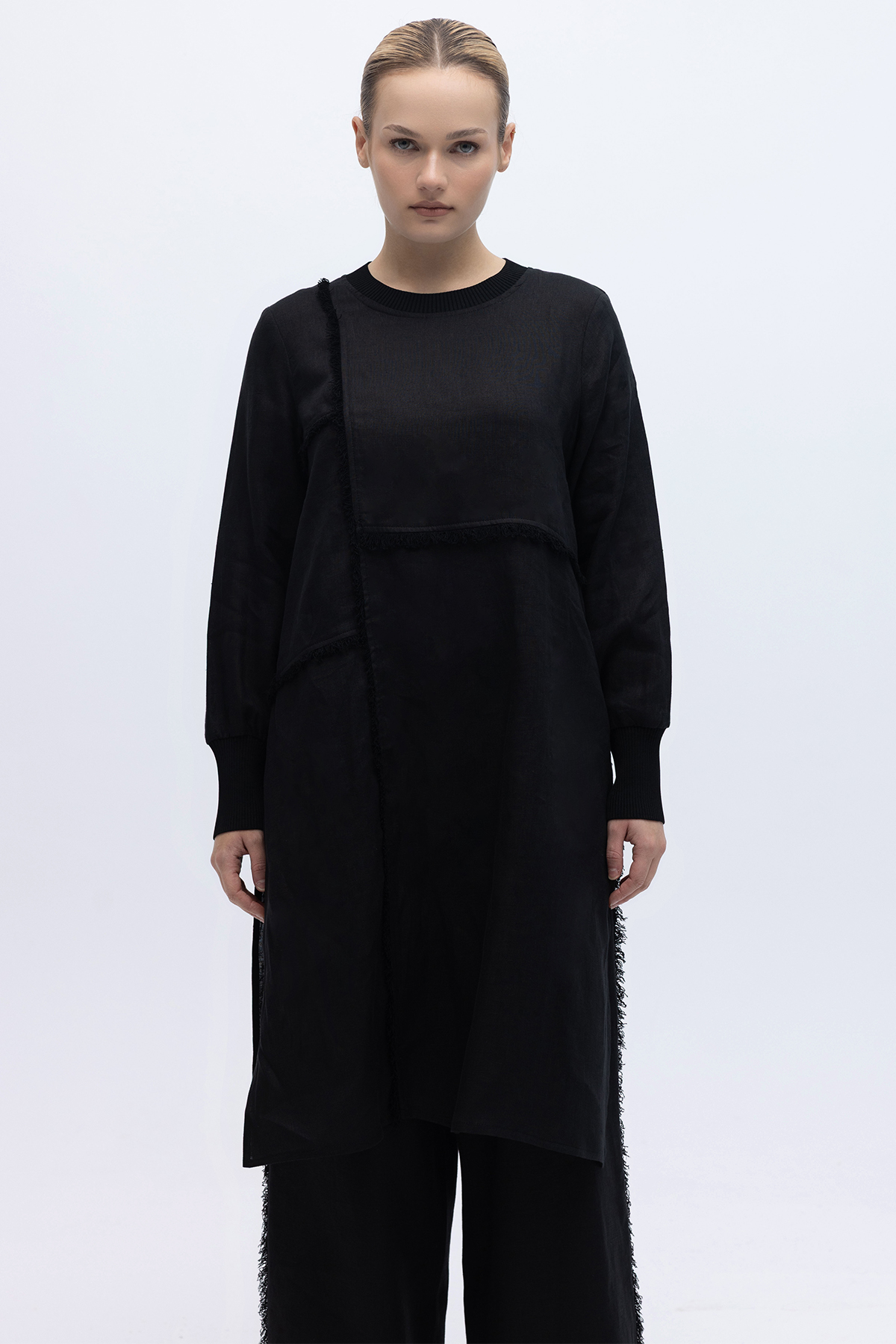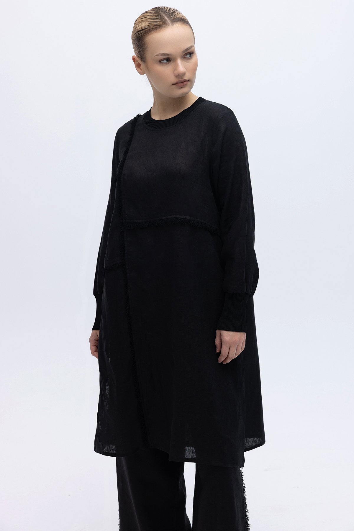 Önü Püsküllü Uzun Kollu Keten Elbise Siyah