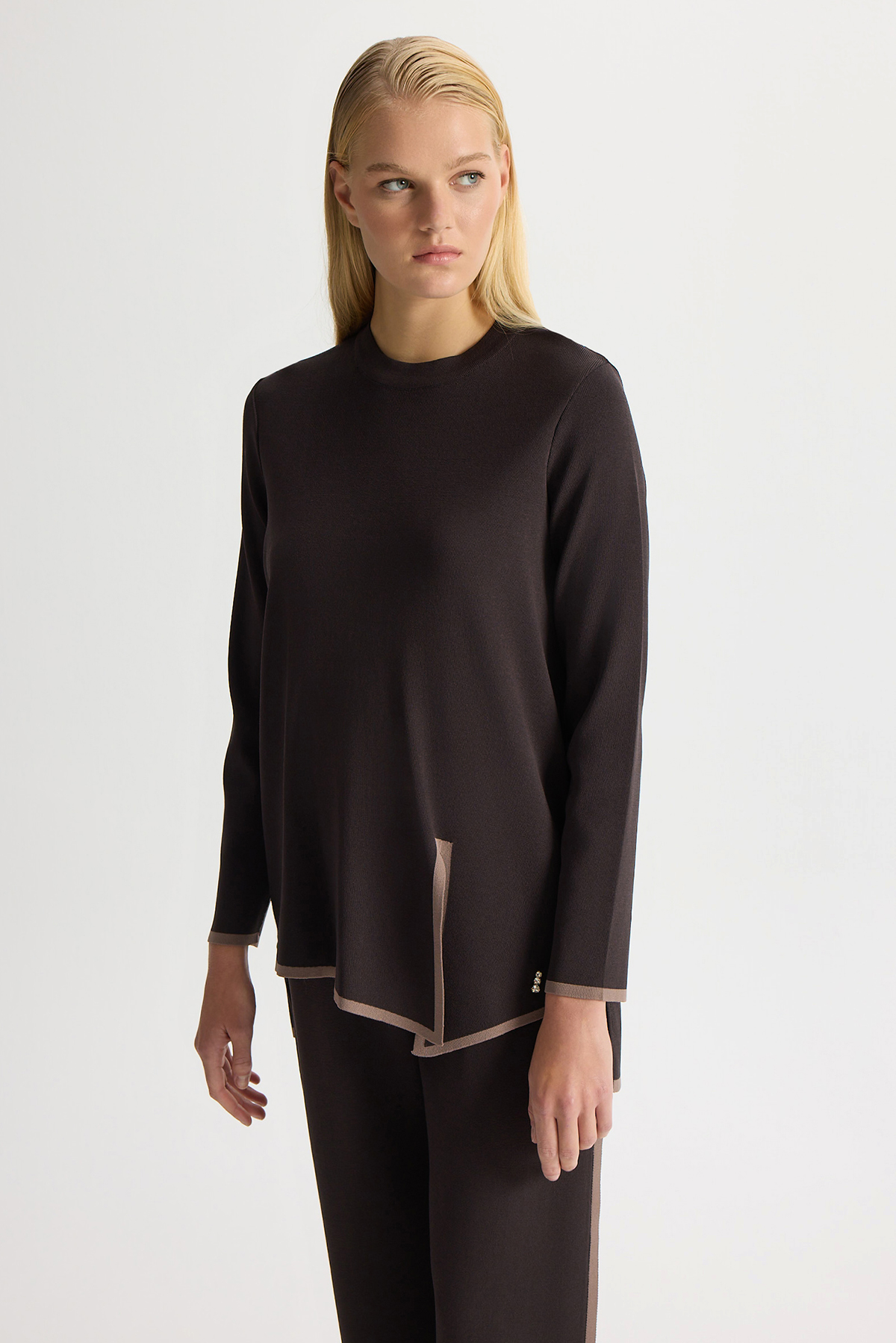 Önü Yırtmaç ve Tiktak Detaylı Triko Tunik Kahverengi