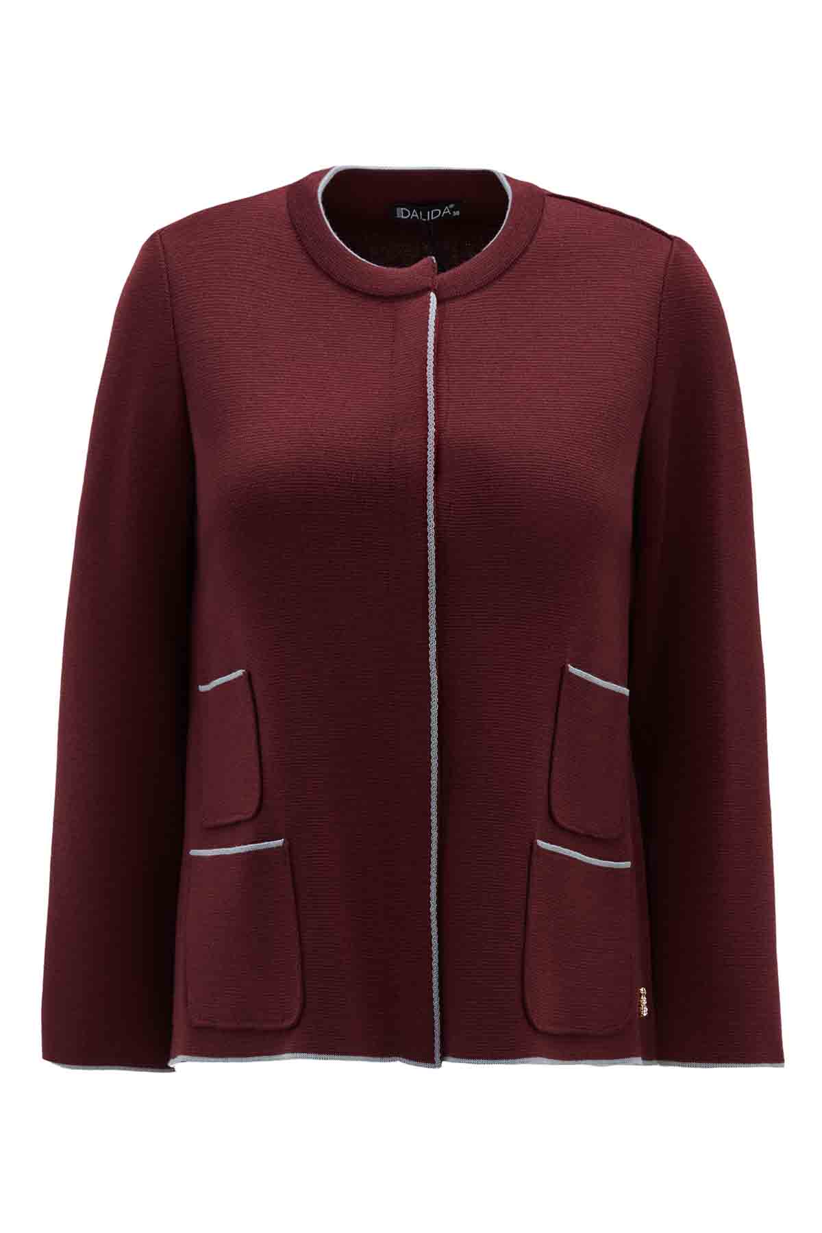 The pocketed short knitted burgundy jacket offers a perfect balance of elegance and practicality. Crafted from soft knit fabric, it features a modern short cut and functional pockets for a chic, versatile look. Ideal for both everyday styling and office outfits, it reflects Miss Dalida’s signature refined aesthetic.
