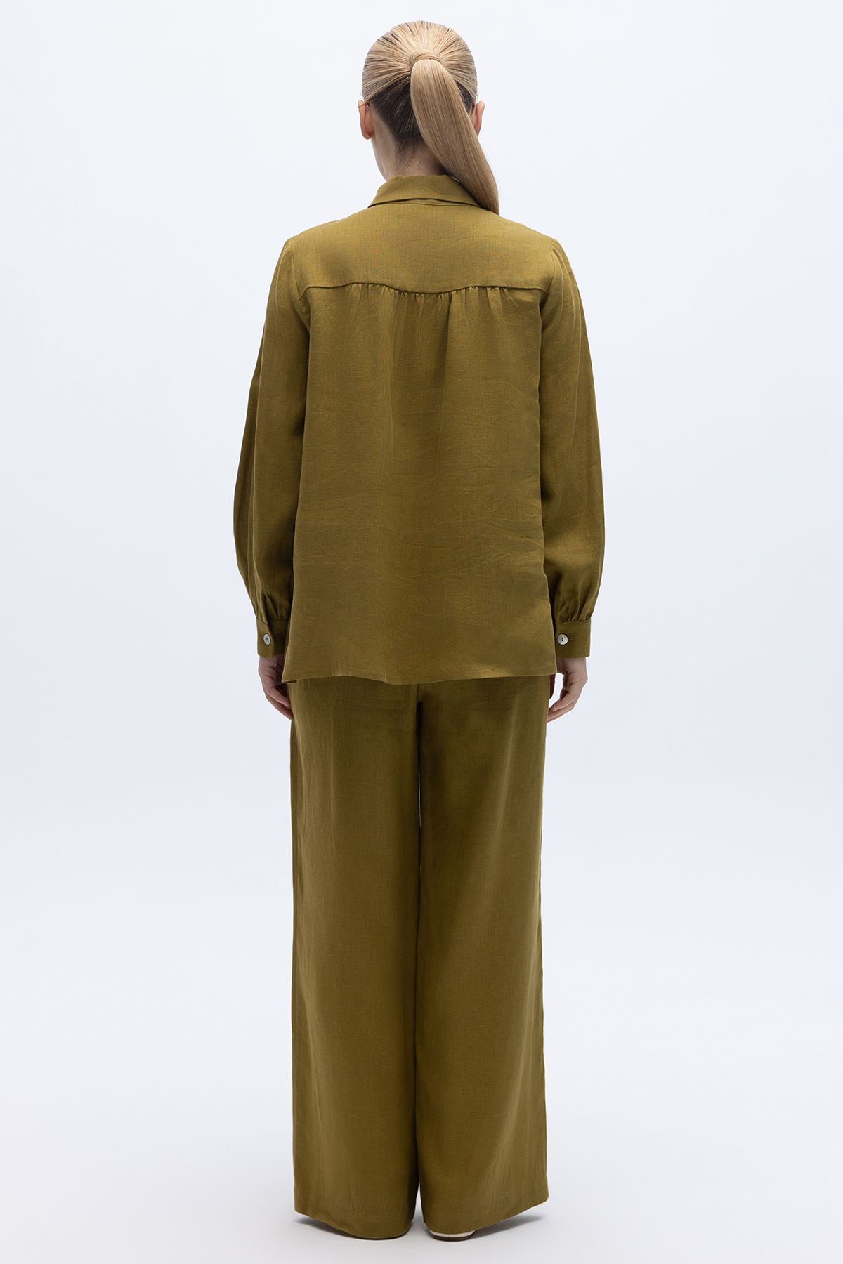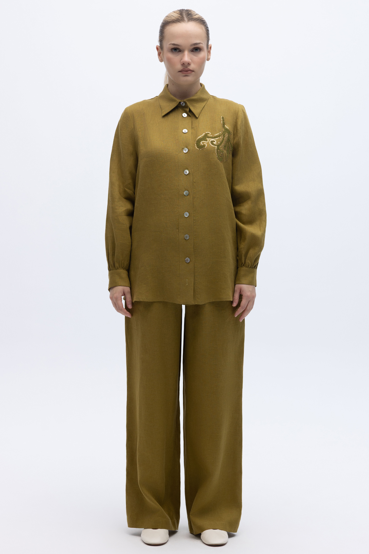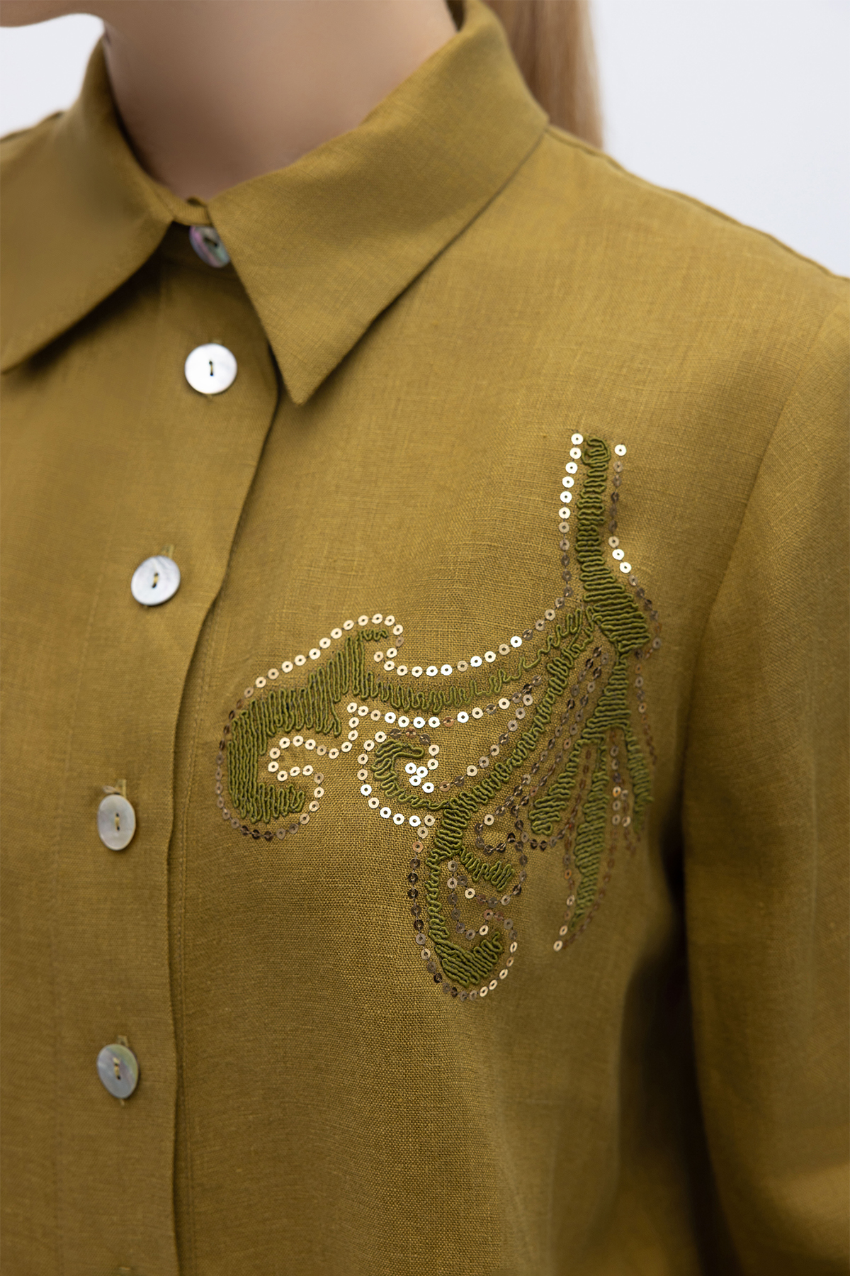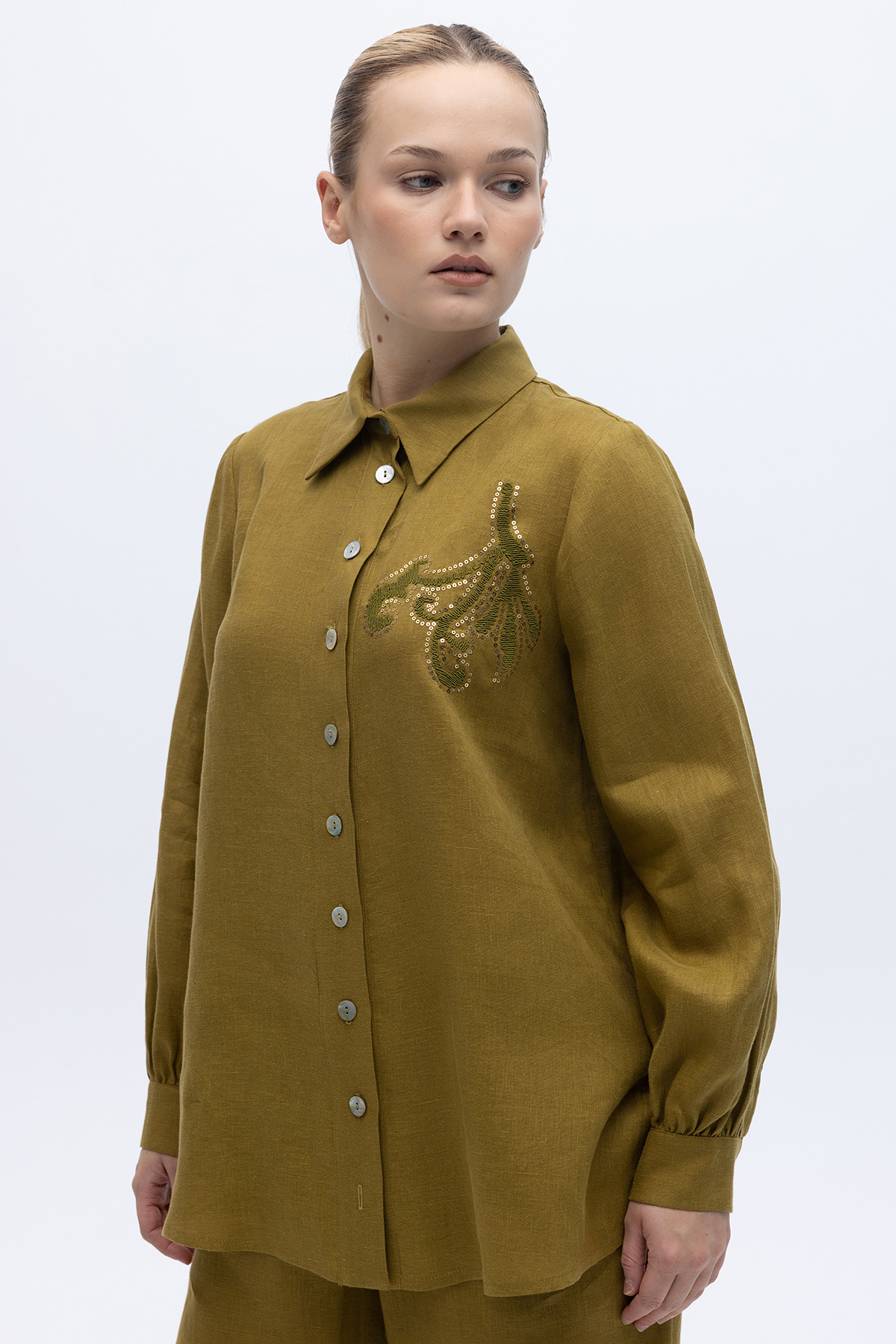 Pullu Nakışlı Keten Gömlek Amber