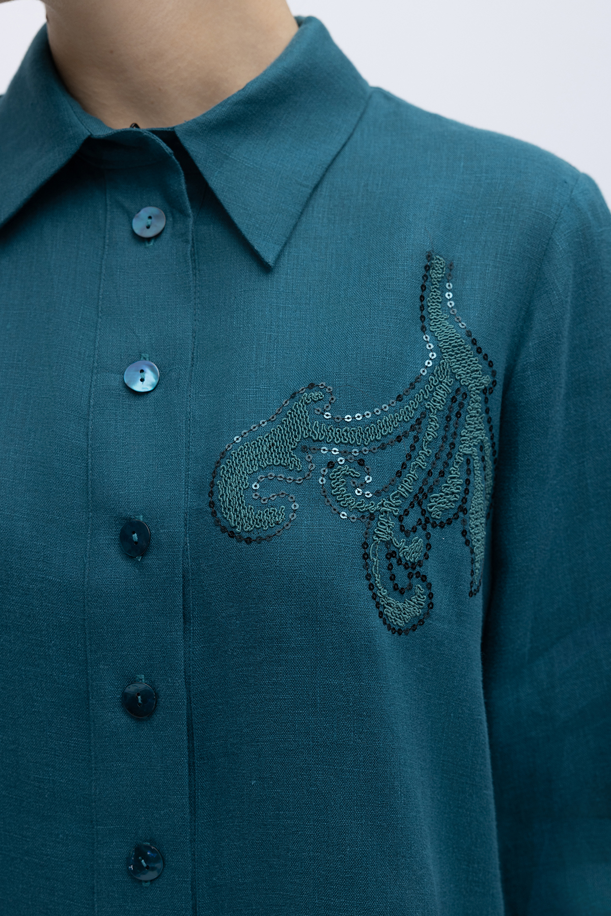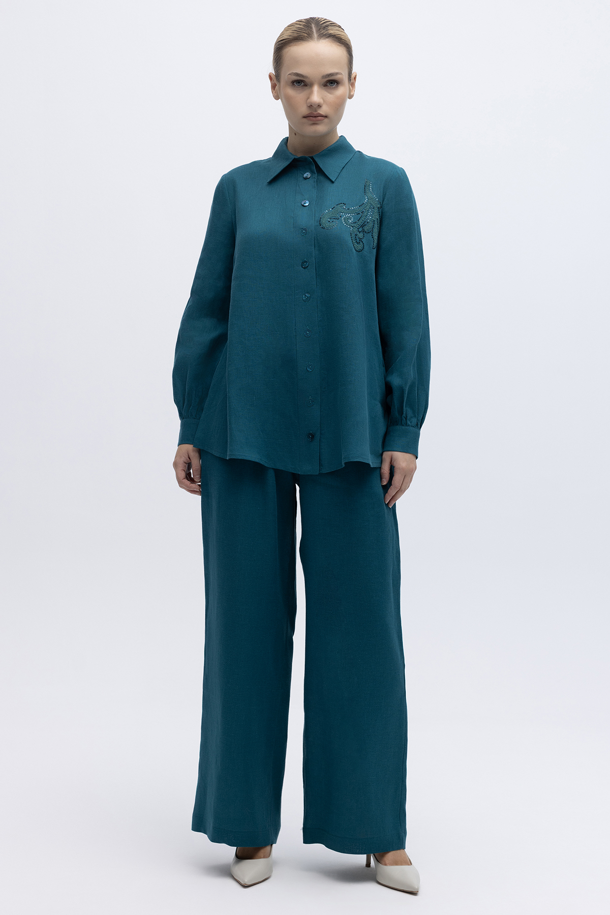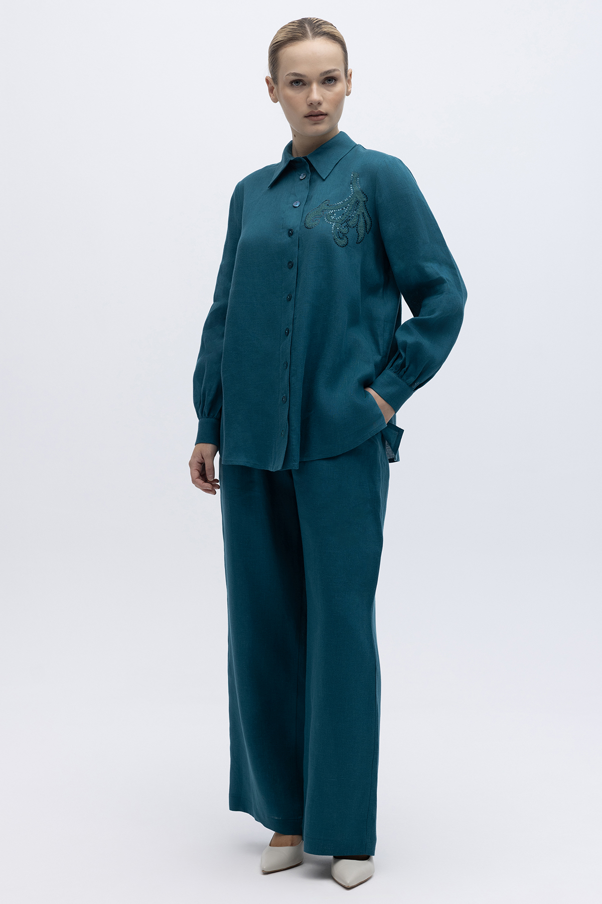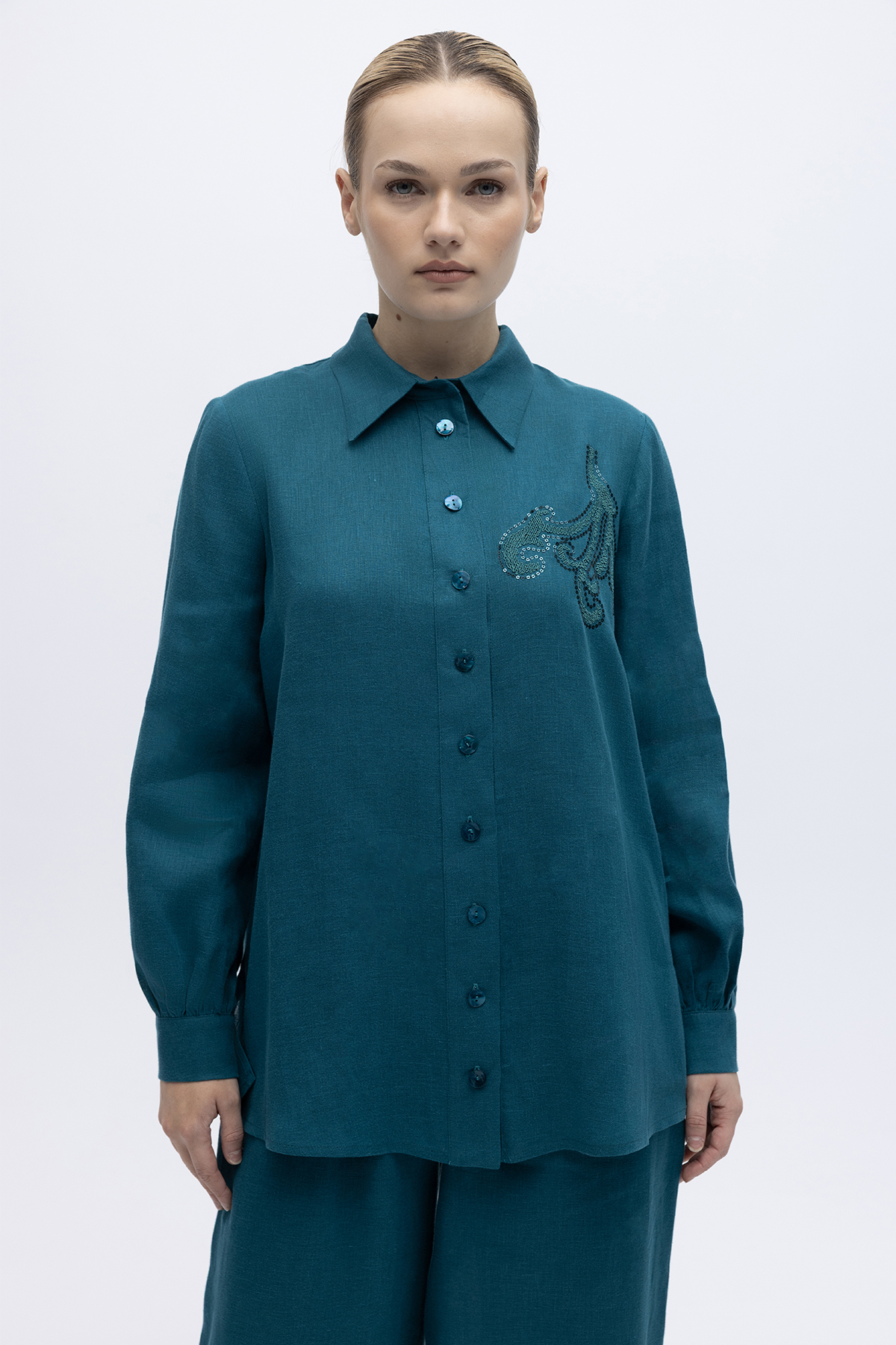 Pullu Nakışlı Keten Gömlek North Sea