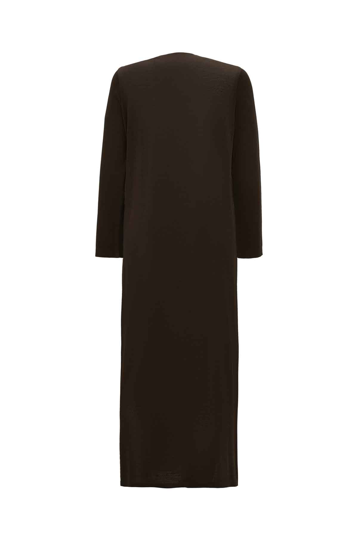 The relaxed fit round neck brown dress combines natural warmth with modern simplicity. Made from soft, stretchy knit fabric, it provides effortless comfort and movement throughout the day. The rich brown hue adds depth and sophistication a timeless piece from Miss Dalida’s contemporary collection.