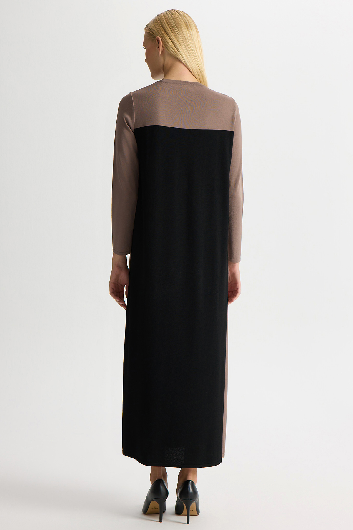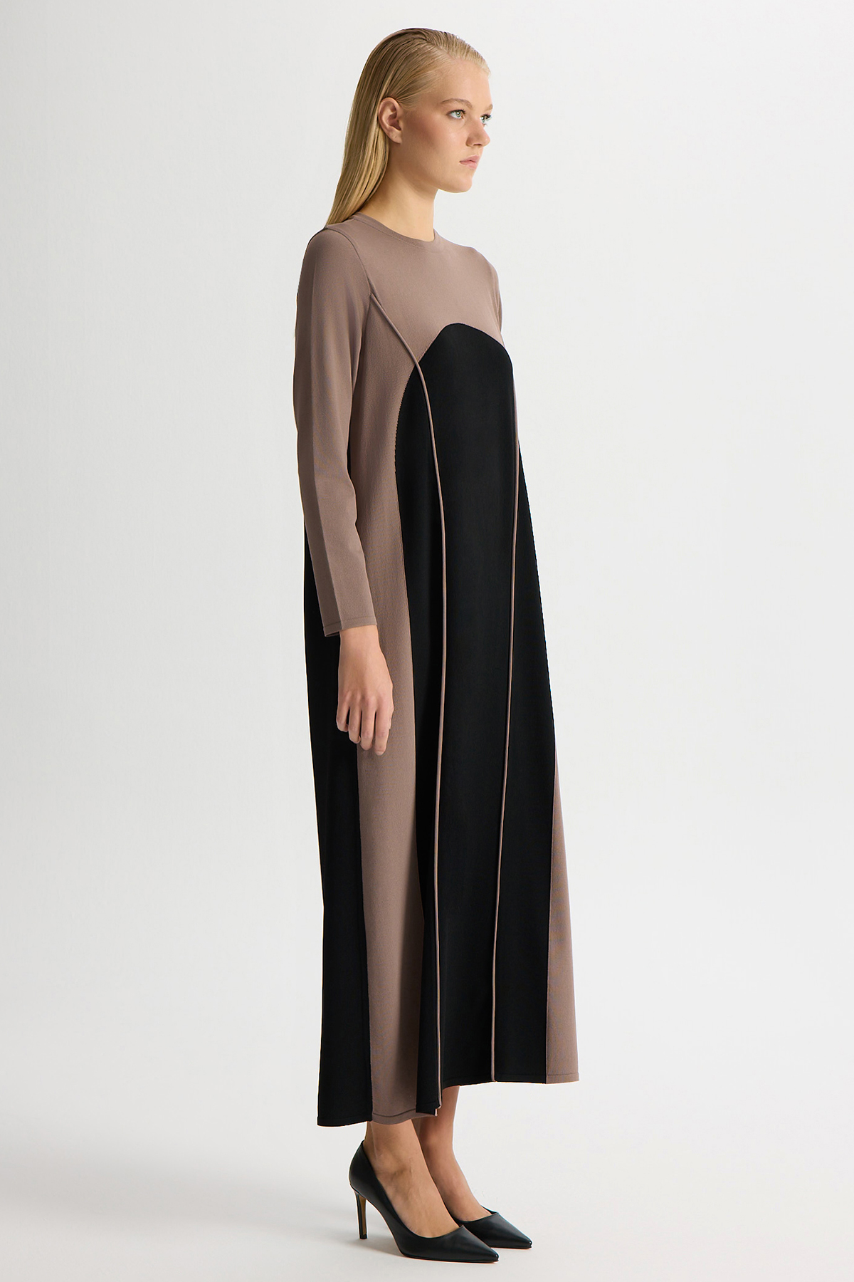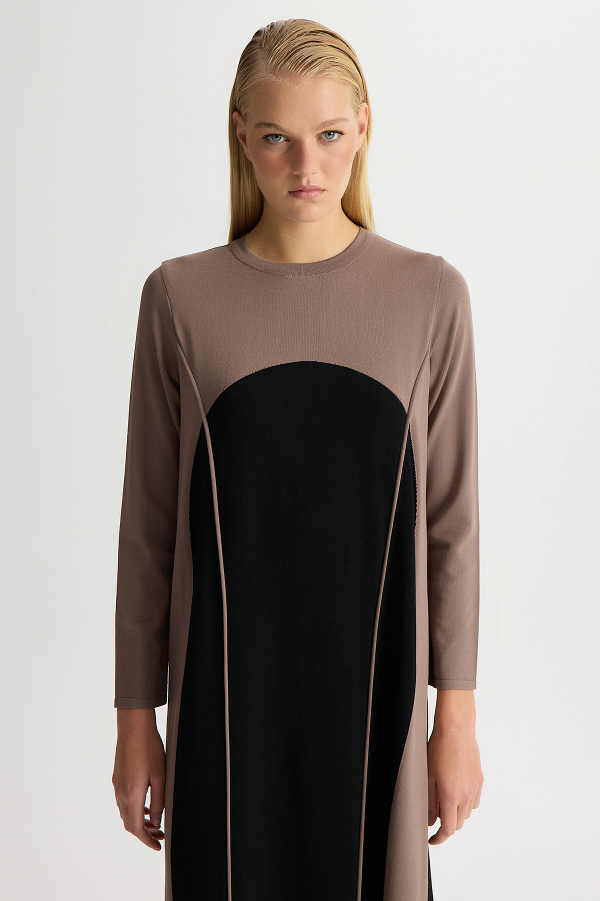 Renk Bloklu Yuvarlak Yaka Triko Elbise Kahverengi