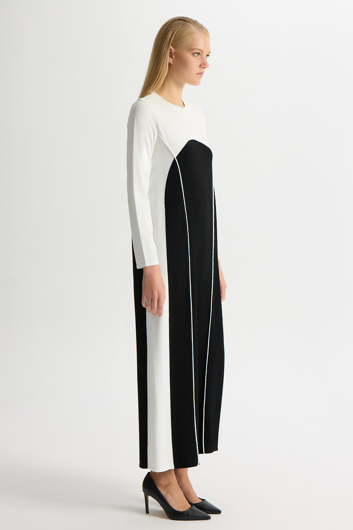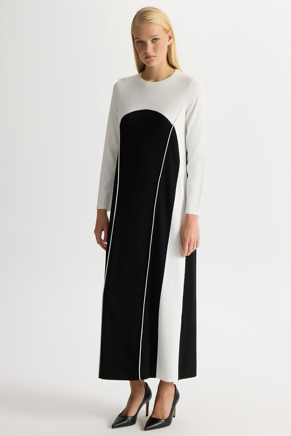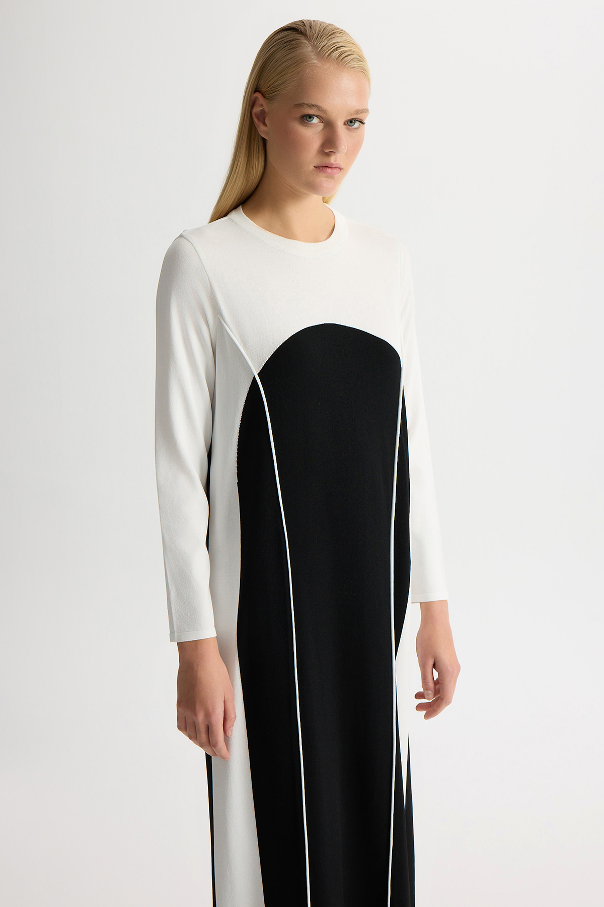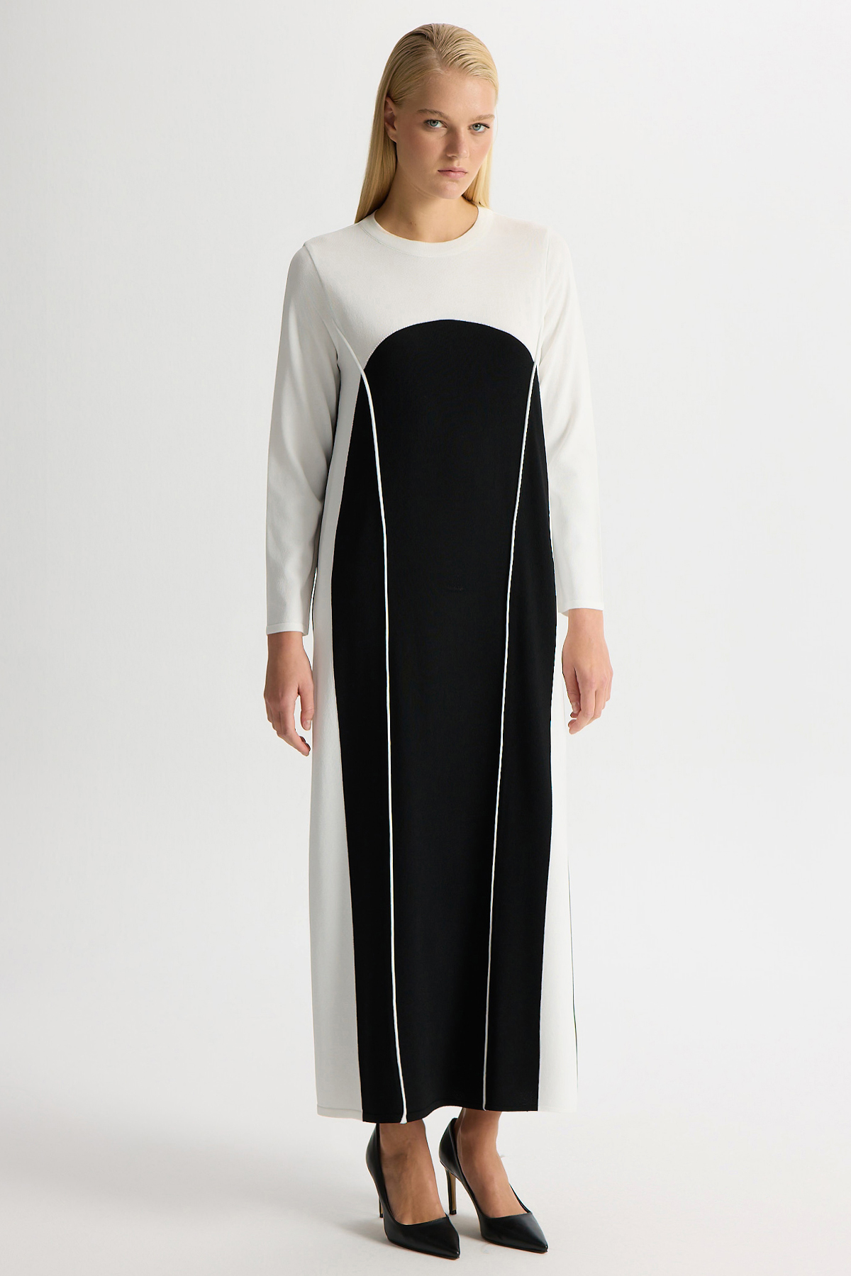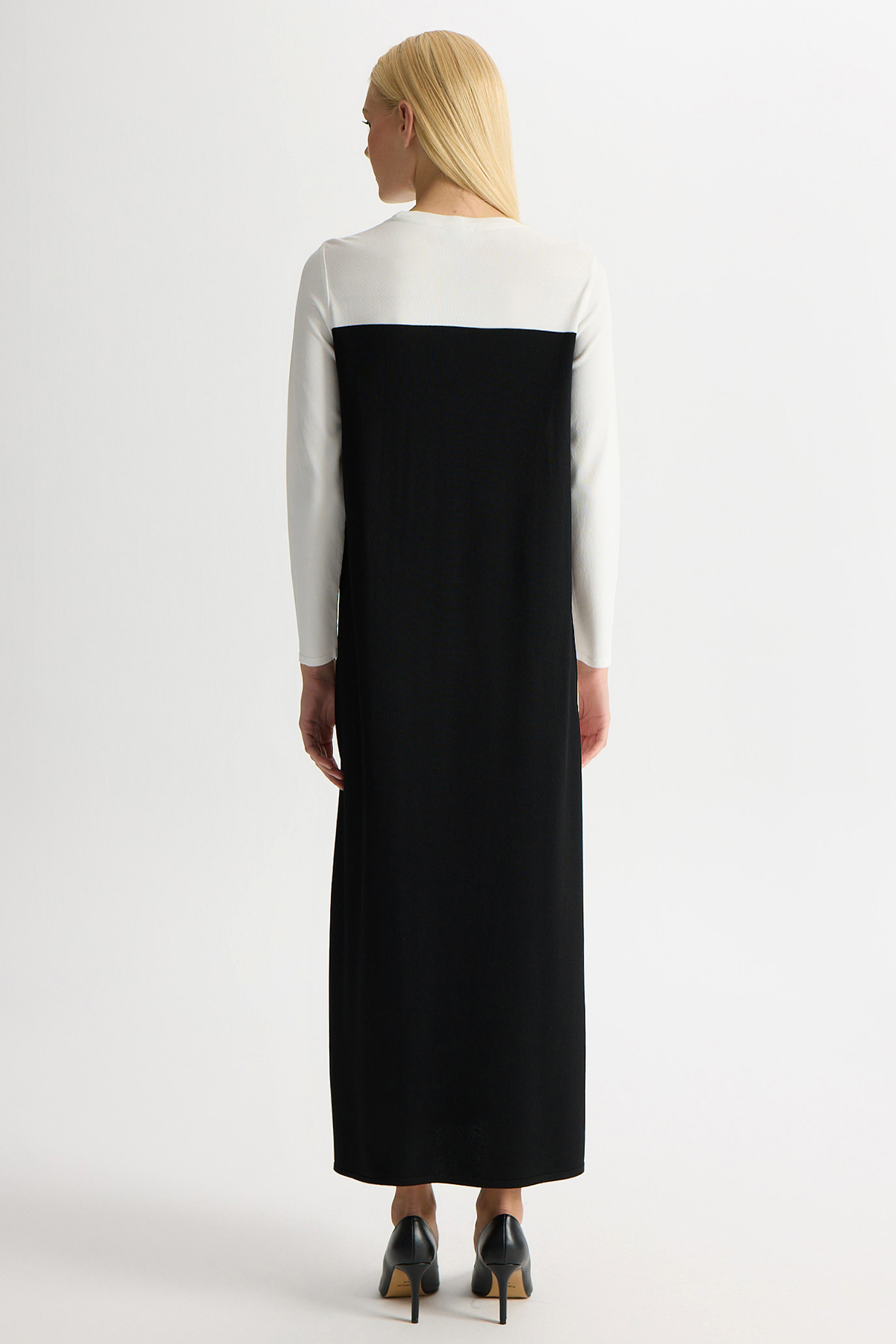 Renk Bloklu Yuvarlak Yaka Triko Elbise Siyah