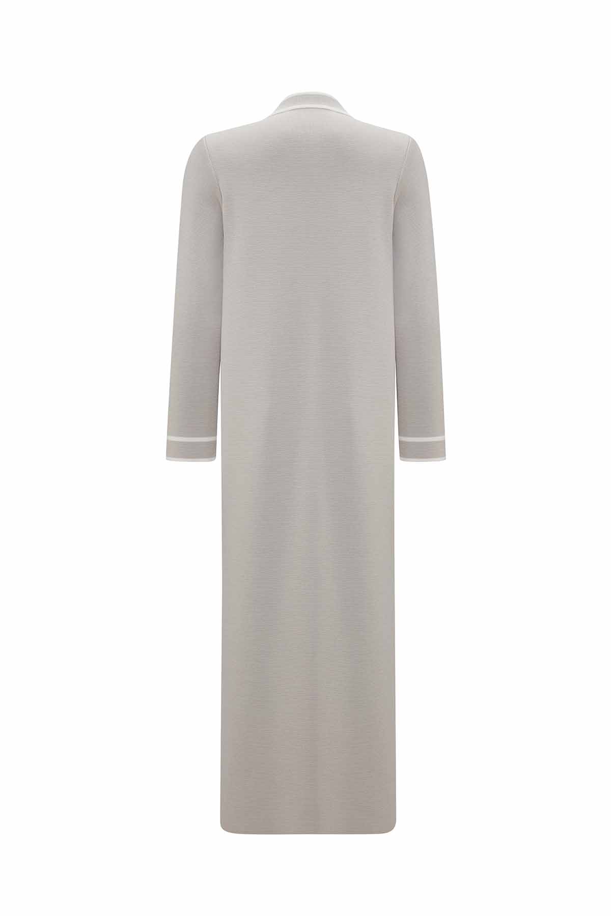 The Round Neck Knit Cardigan with Stripe Details in Stone combines a soft knit texture with stylish stripe accents. The neutral stone tone ensures effortless coordination with any outfit. Perfect for everyday wear or office styling, it offers both comfort and elegance in a single piece.