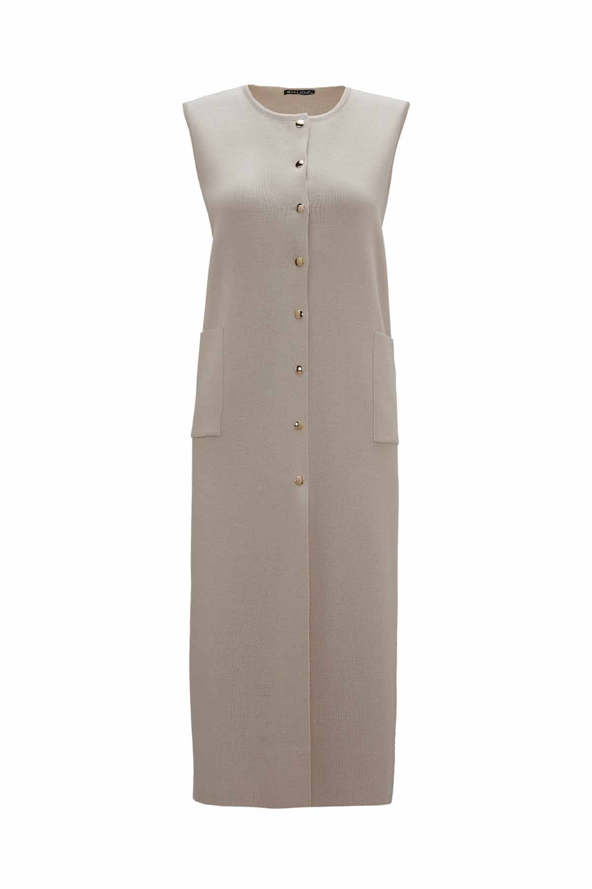 The Round Neck Snap Button Knitted Stone Vest features a soft knit texture and elegant stone tone, making it a perfect layering piece for sophisticated everyday outfits. Its minimal design and snap-button details offer a modern yet timeless appeal.