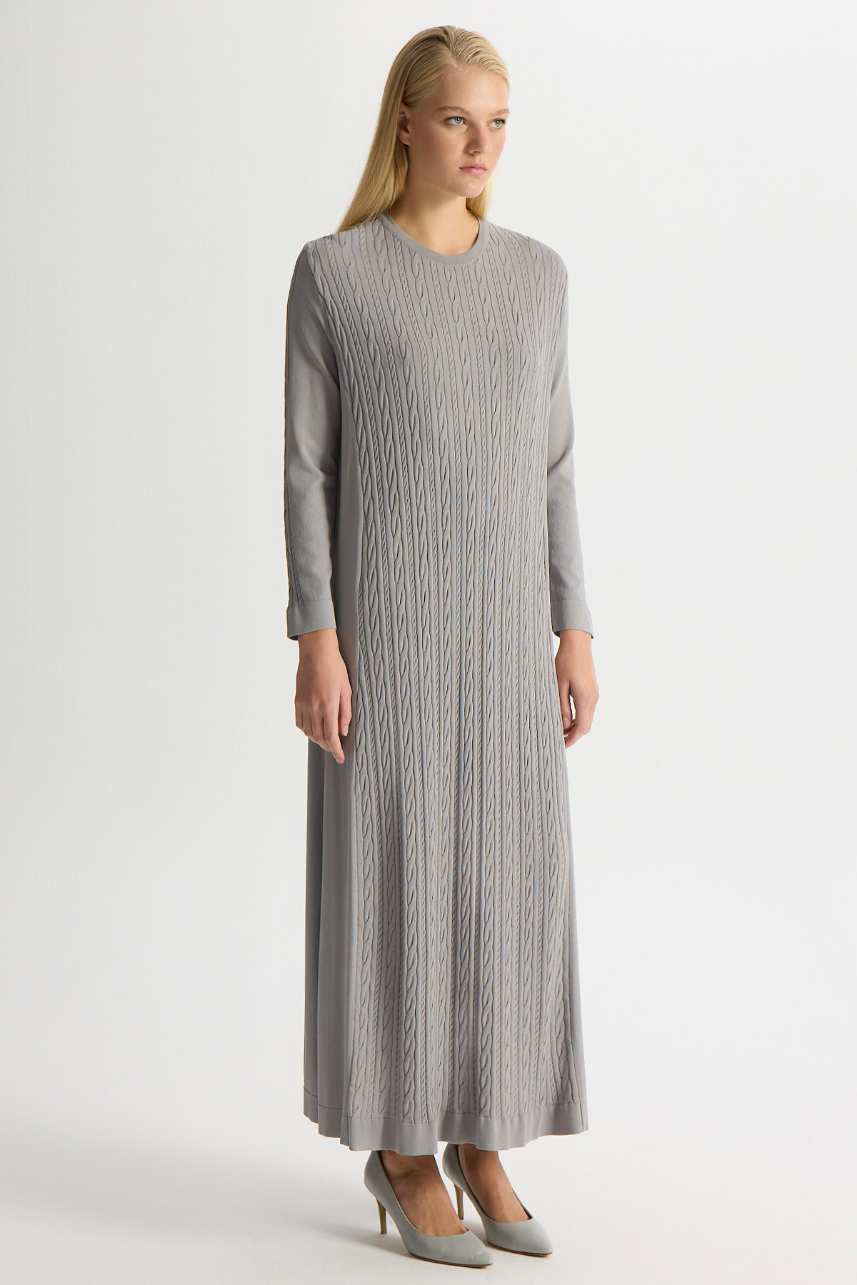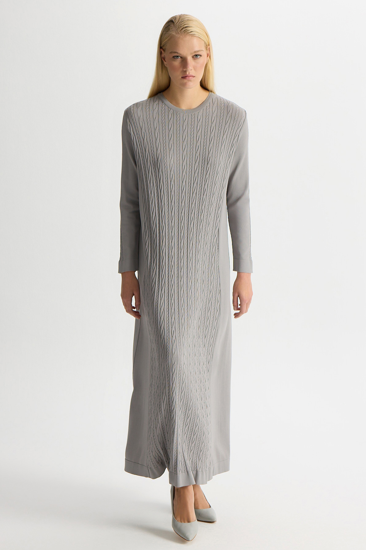 Saç Örgülü Düz Renk Elbise – Dark Grey, minimal tasarımı ve zarif saç örgü detaylarıyla modern bir şıklık sunar.