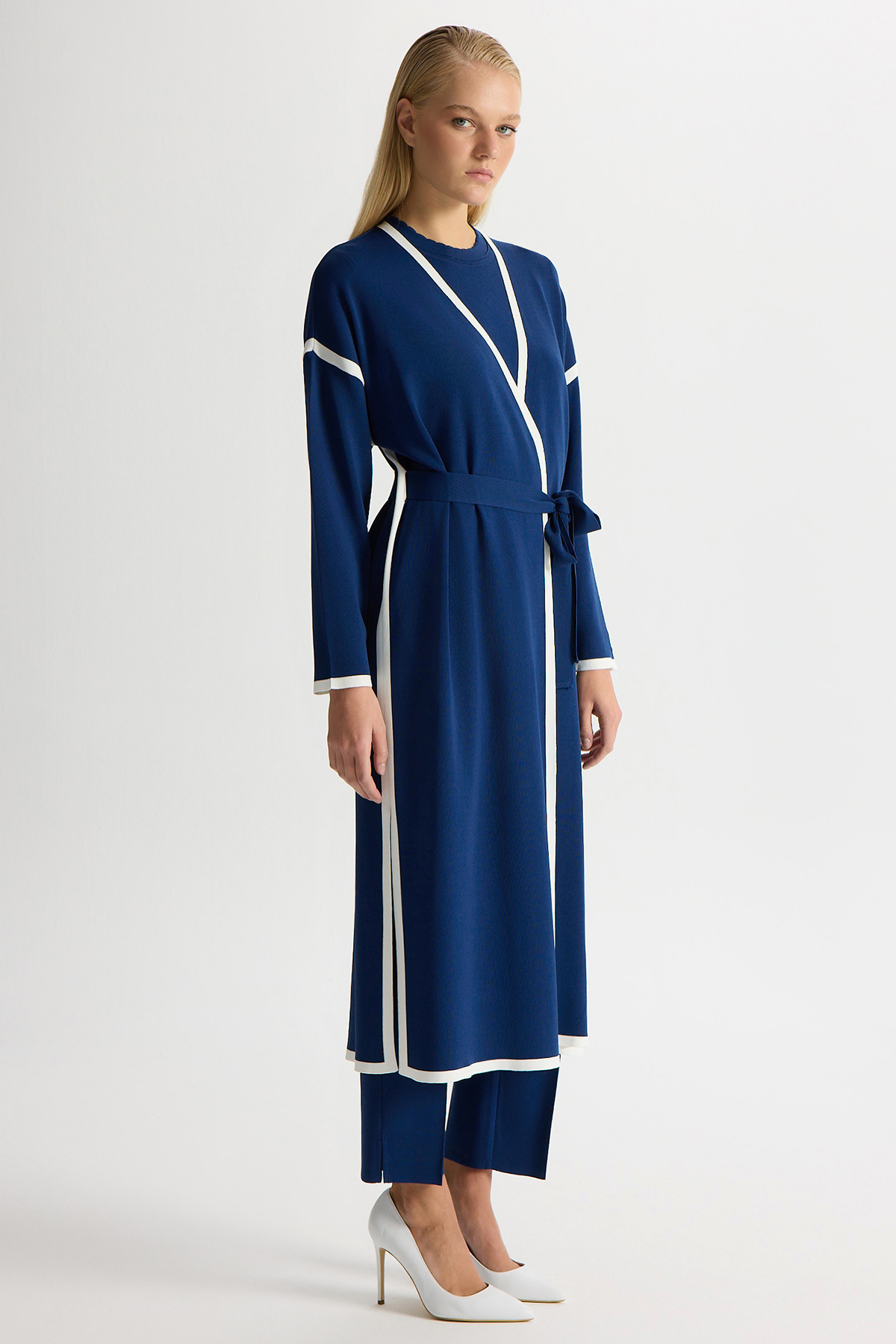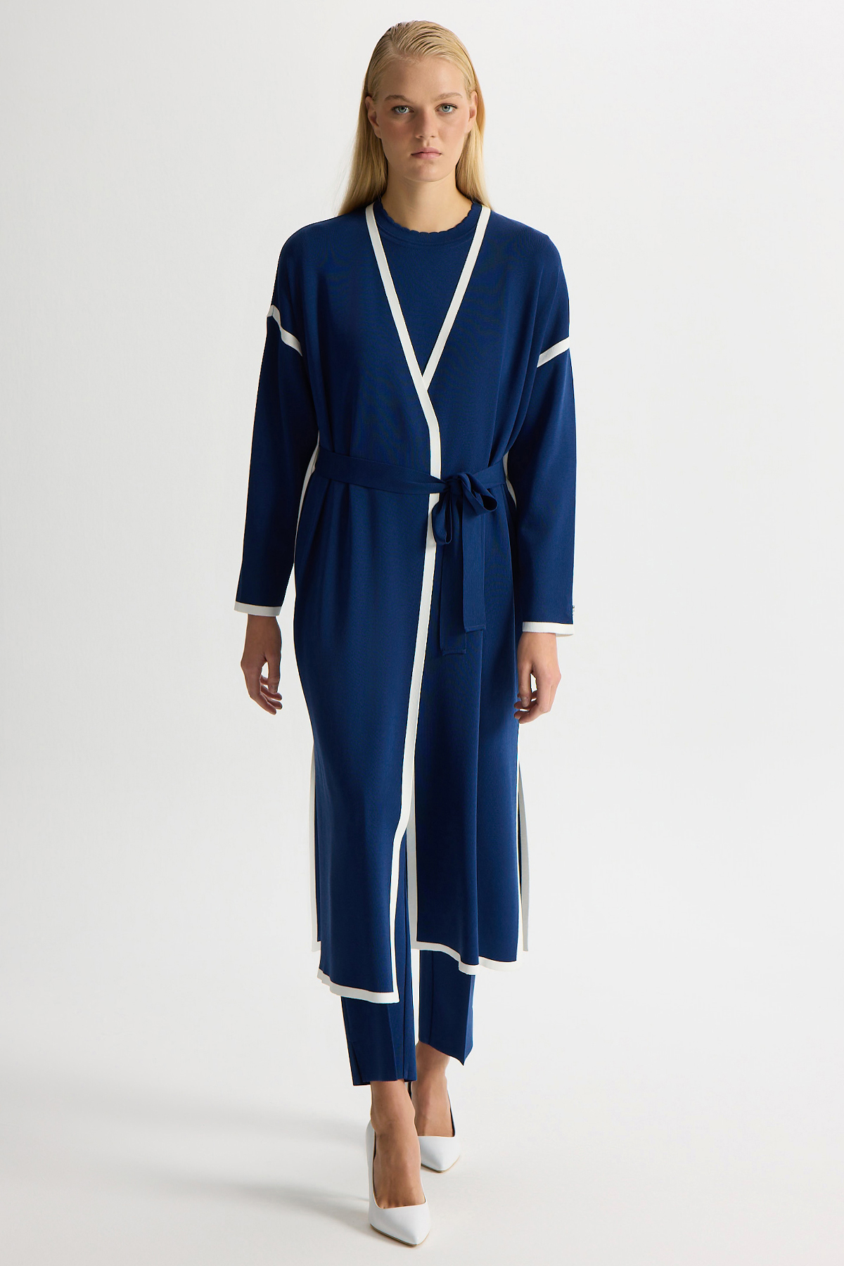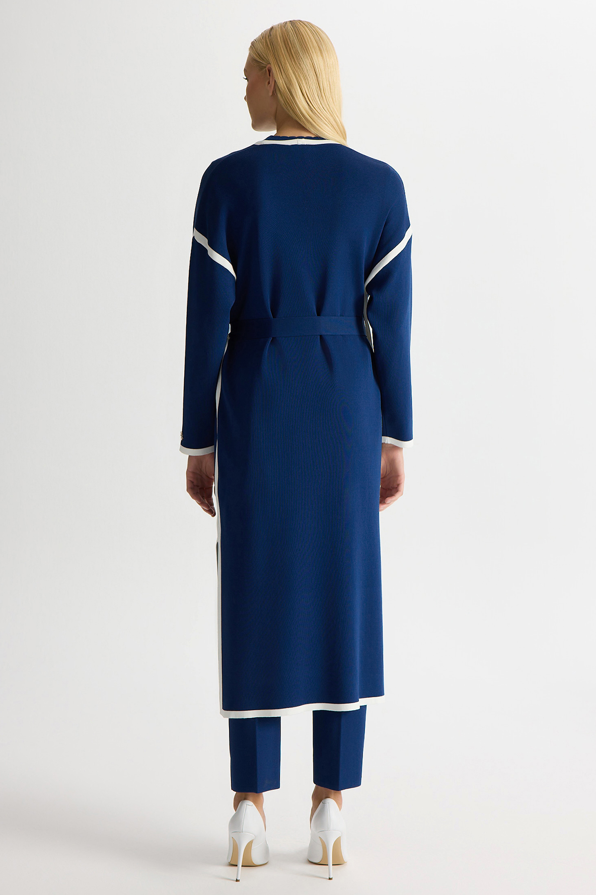 Şerit Detaylı Düz Renk Triko Hırka Navy