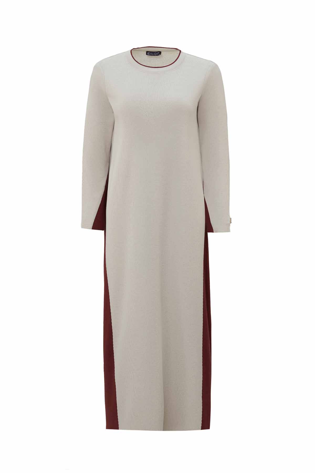 The Side Striped Knitted Stone Dress features a soft stone color base with contrasting side stripes for a contemporary look. Its knit fabric ensures comfort all day long, making it perfect for casual wear or chic urban outfits.